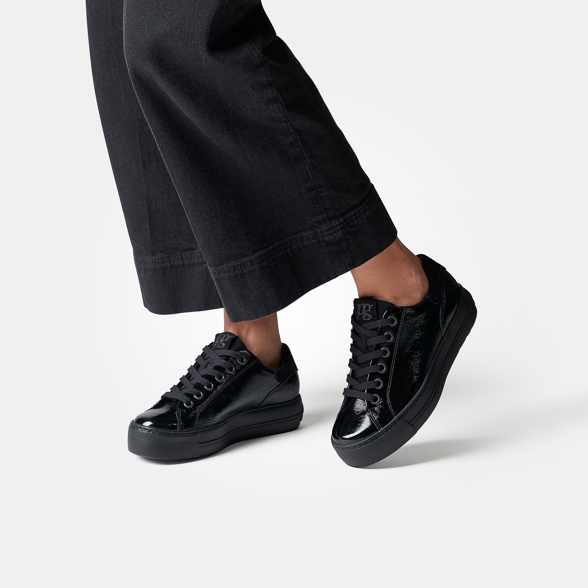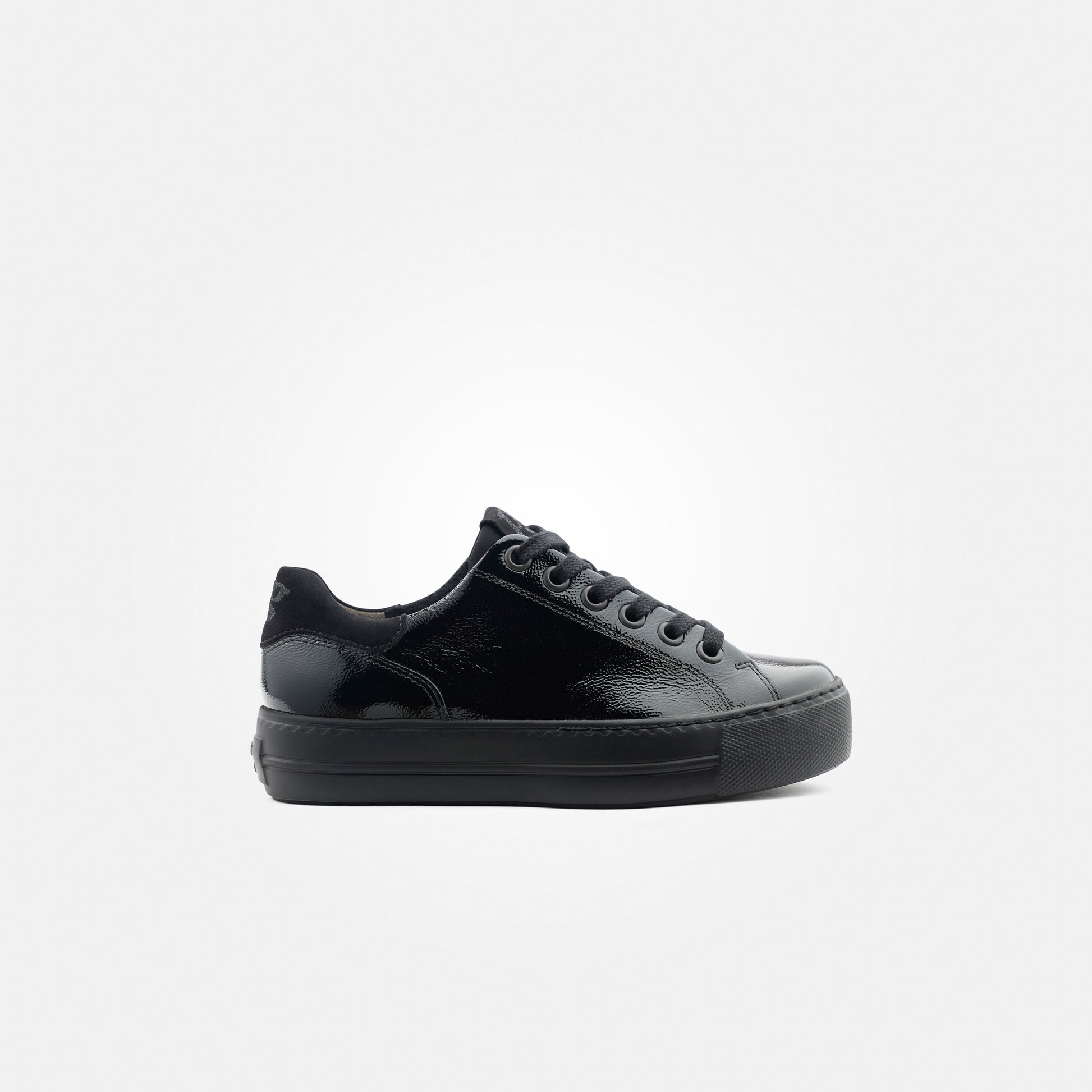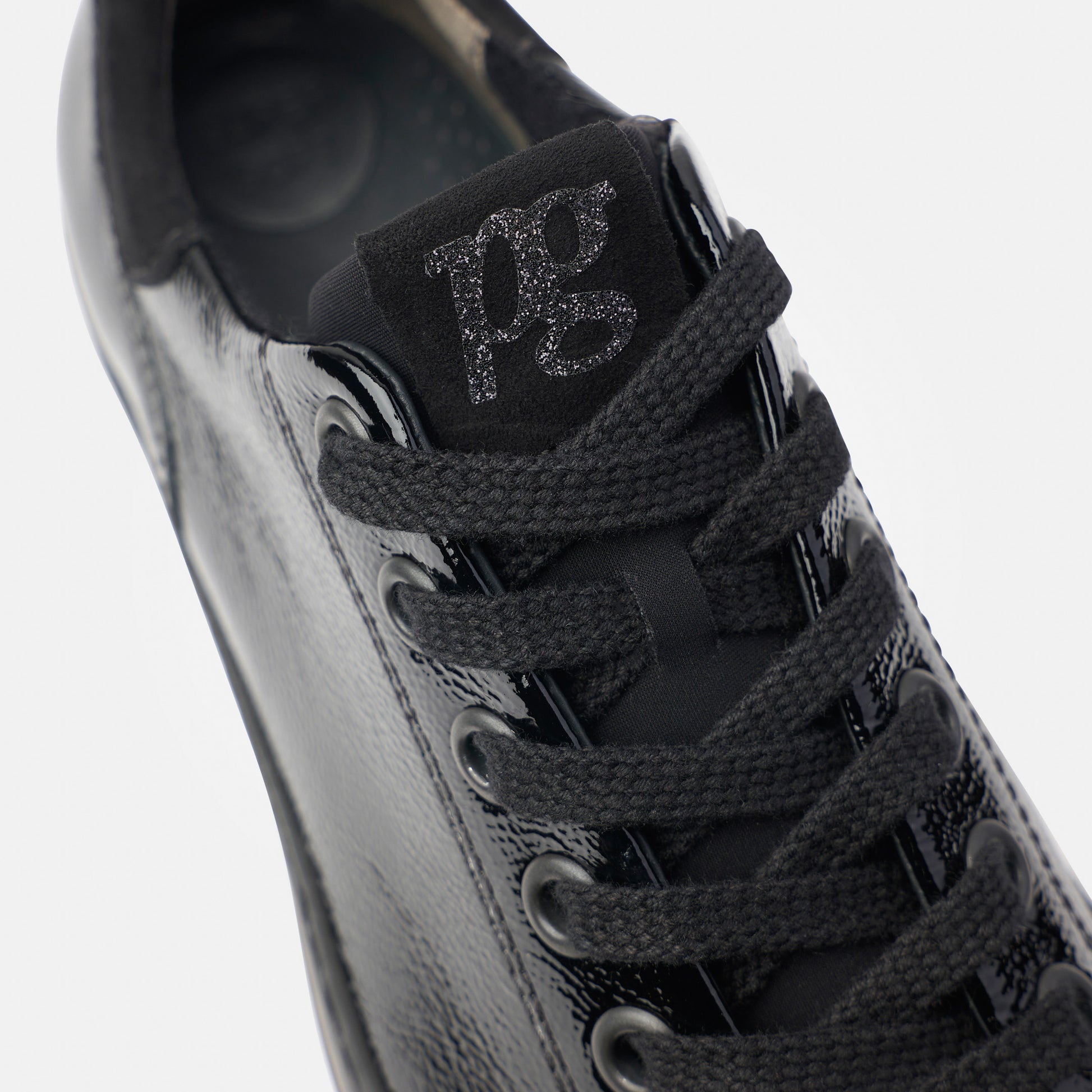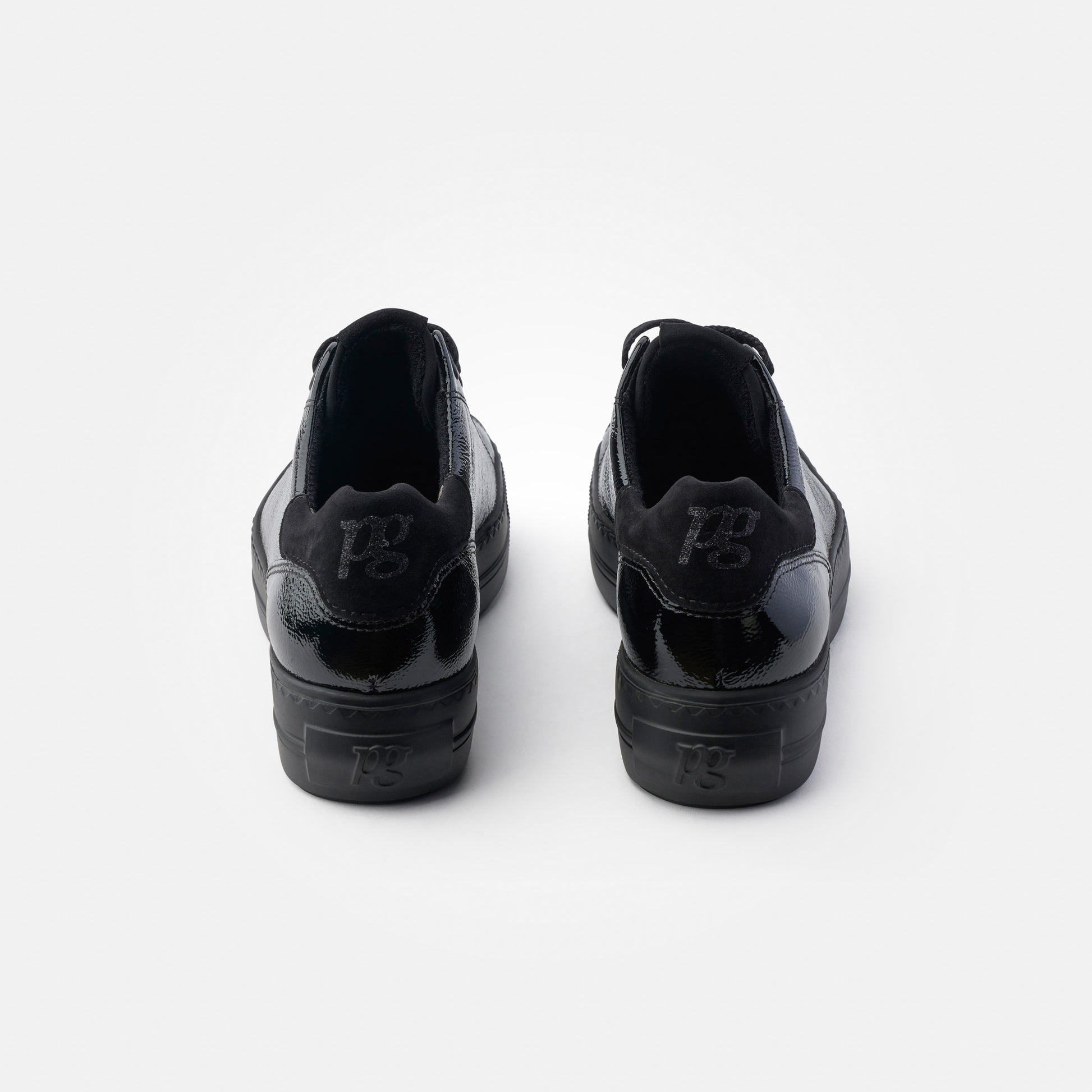 Paul Green soft black patent leather sneakers with dressy black suede trim and diamante Paul green logo. The black eyelets tone nicely with the upper for a colour matched minimal look.