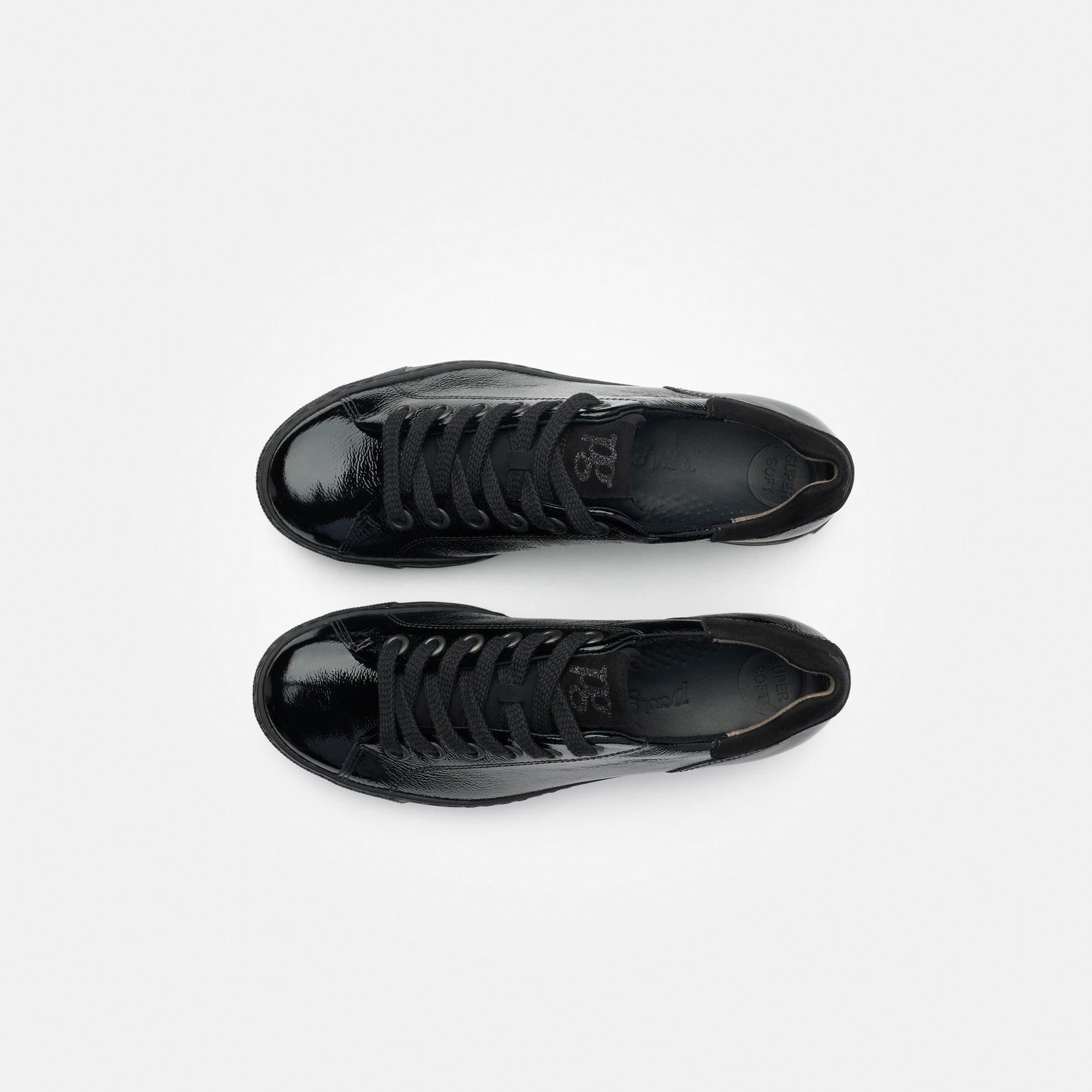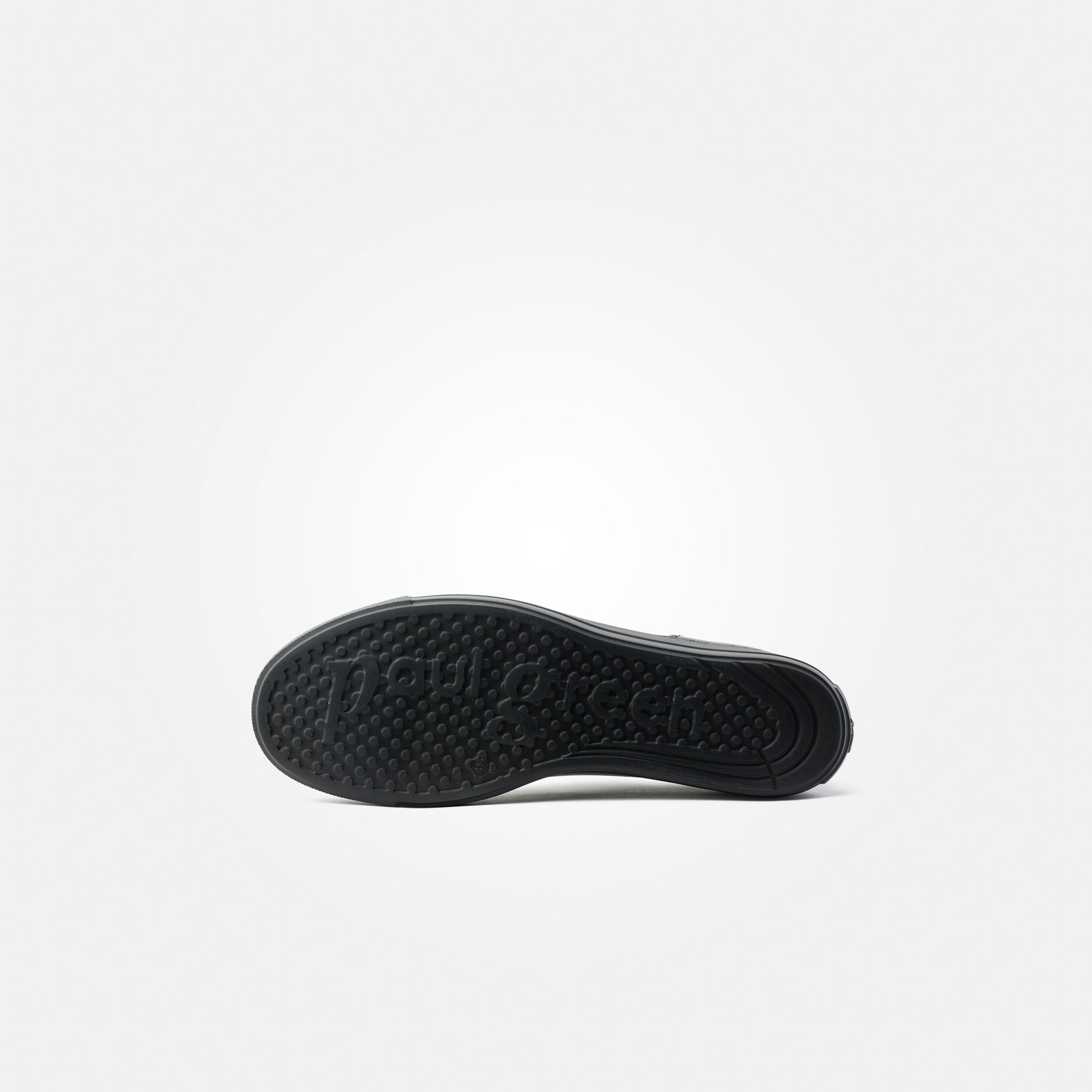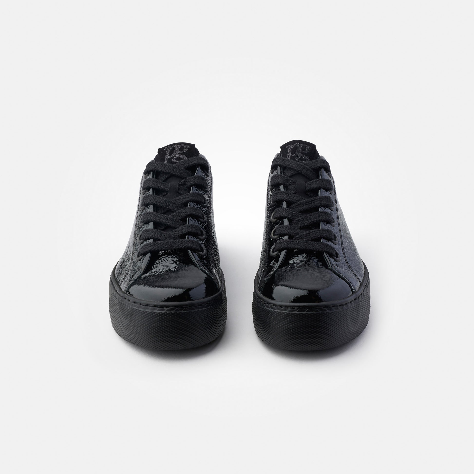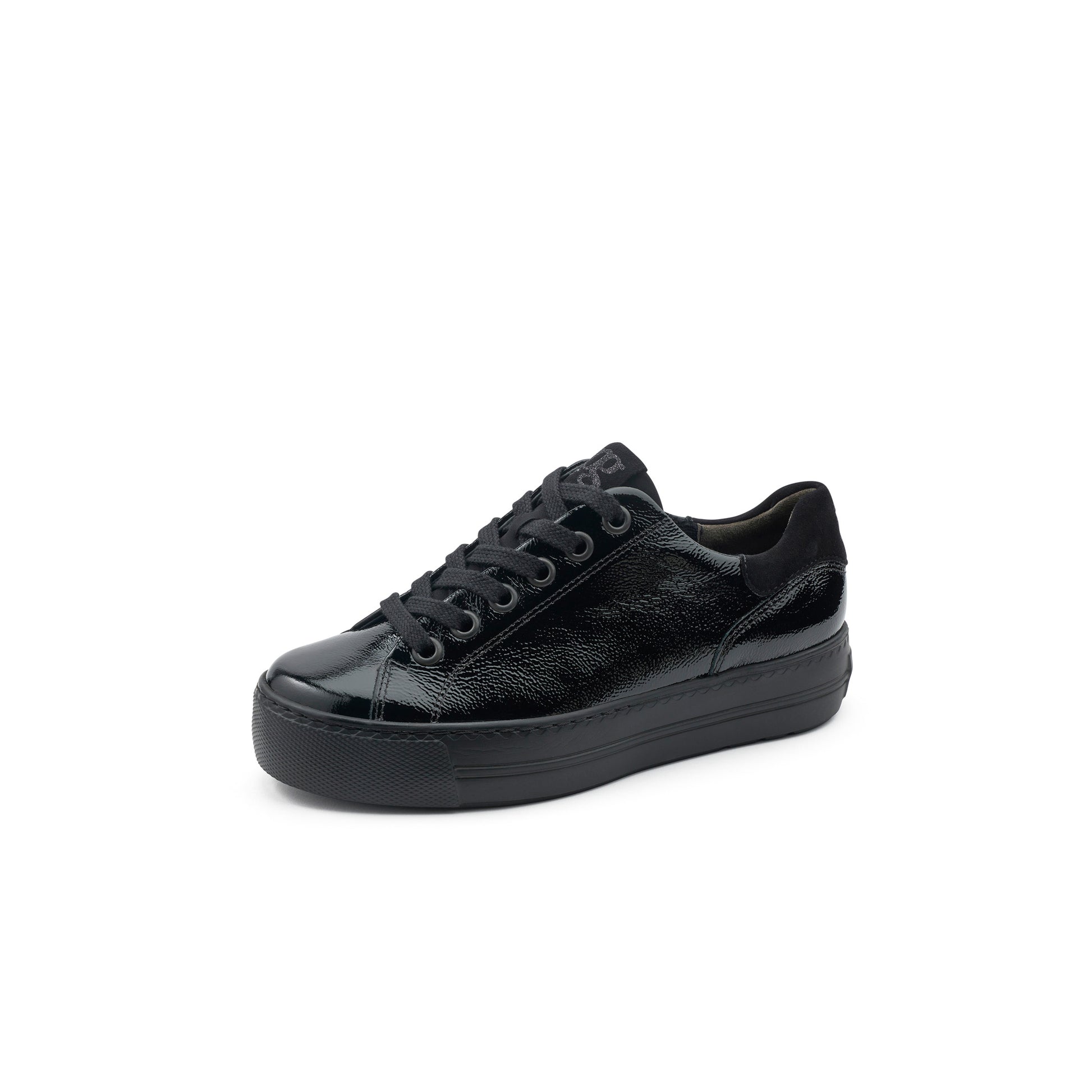 Paul Green soft black patent leather sneakers with dressy black suede trim and diamante Paul green logo. The black eyelets tone nicely with the upper for a colour matched minimal look.