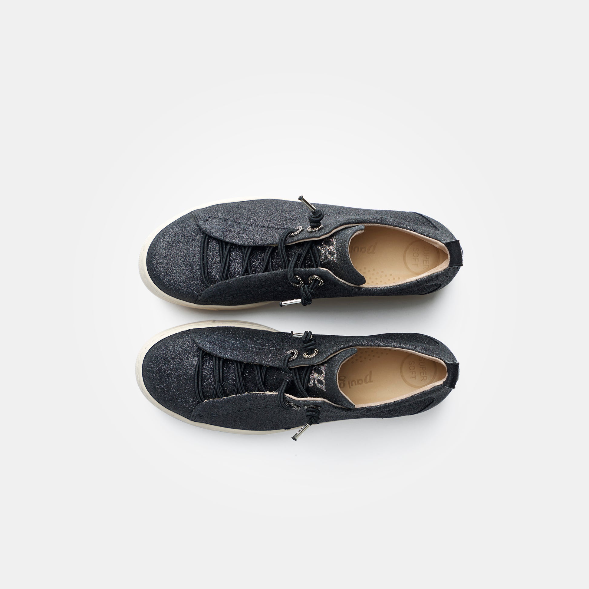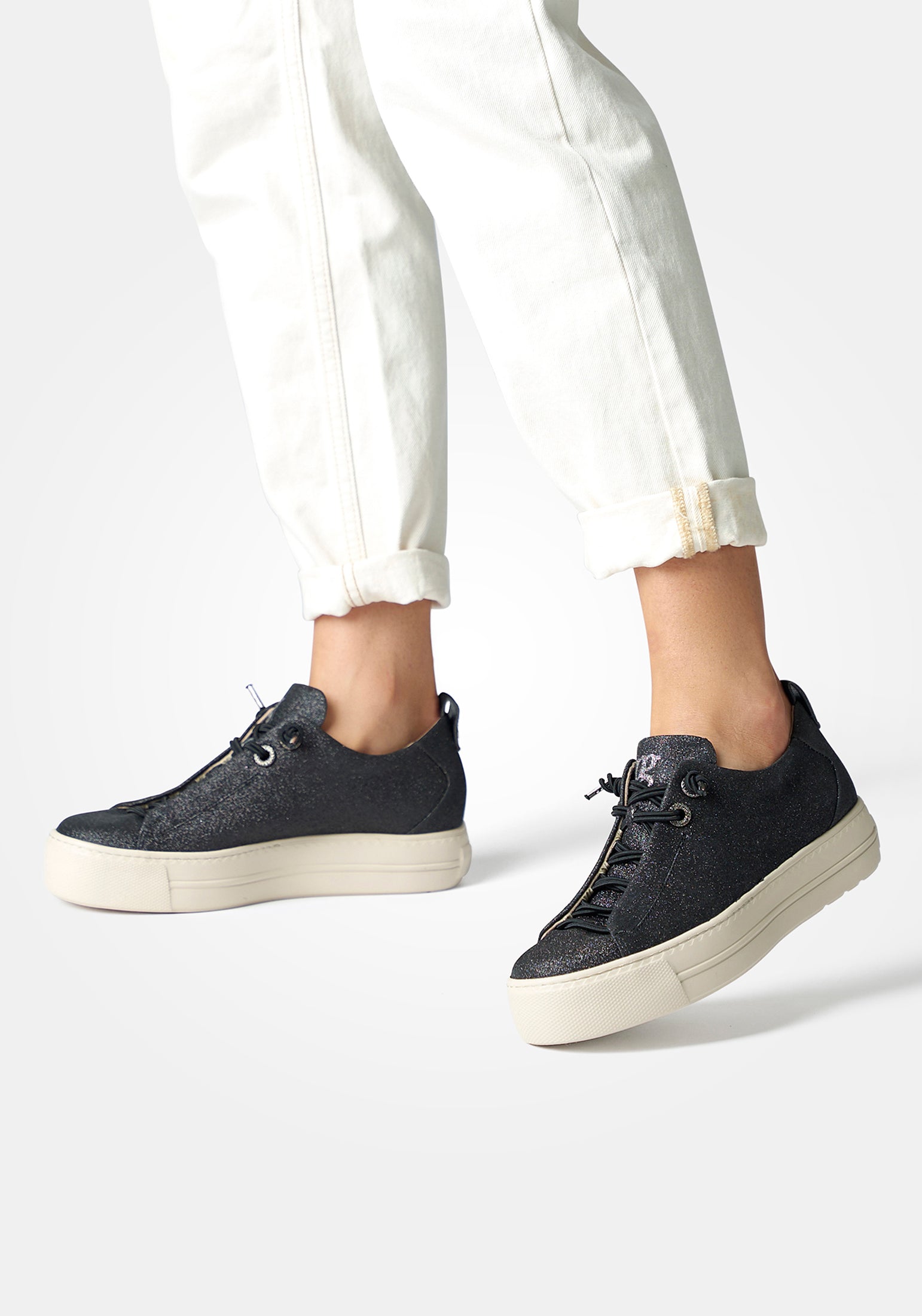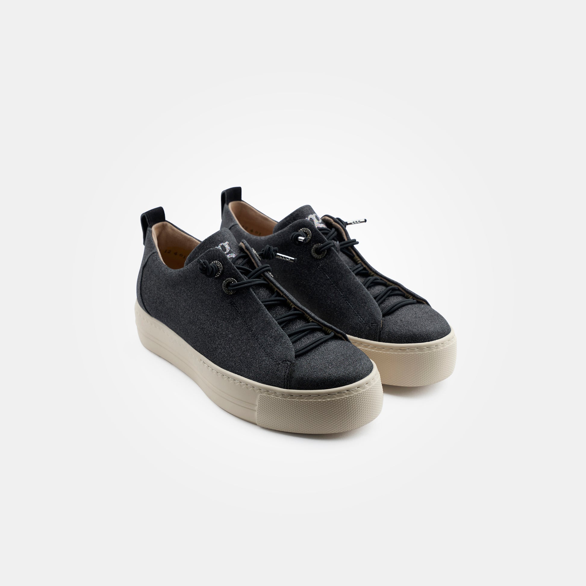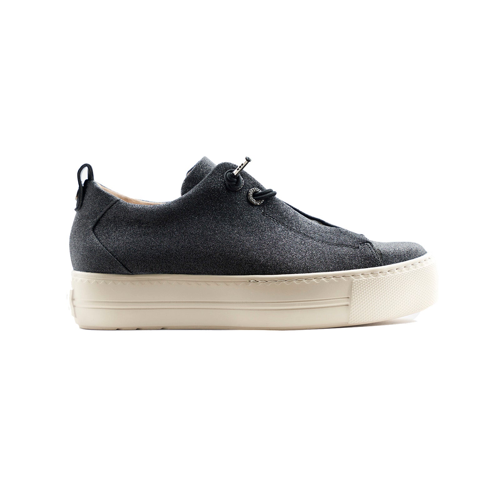Paul Green beautiful glitter textile, leather lined low top sneakers. These incredibly eye catching and lightweight grey black sparkly glitter sneakers with elastic laces showcase the luxury products from a master shoemaker. Paul Green shoes are handmade in Austria using only the finest materials for admirable quality and exclusive design.