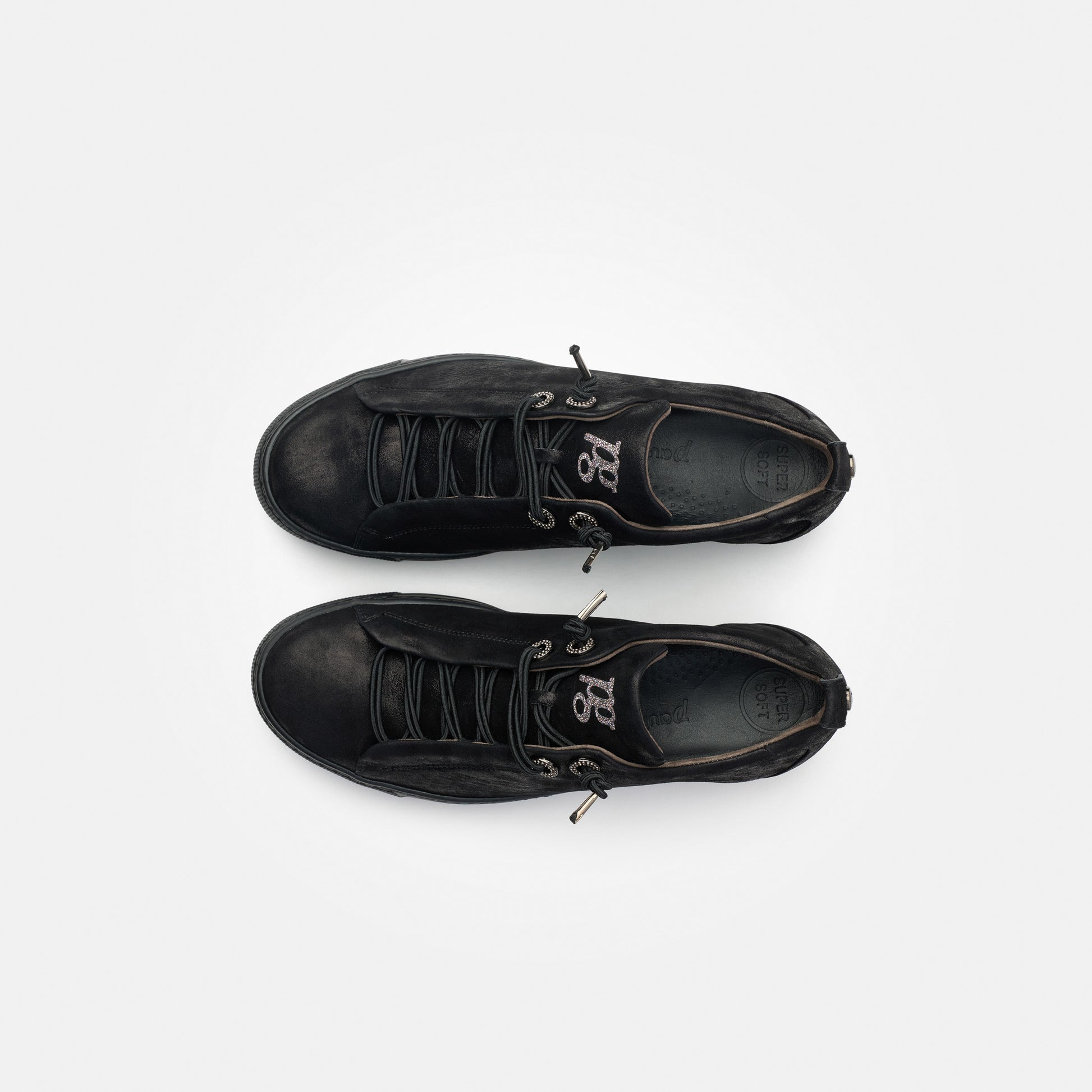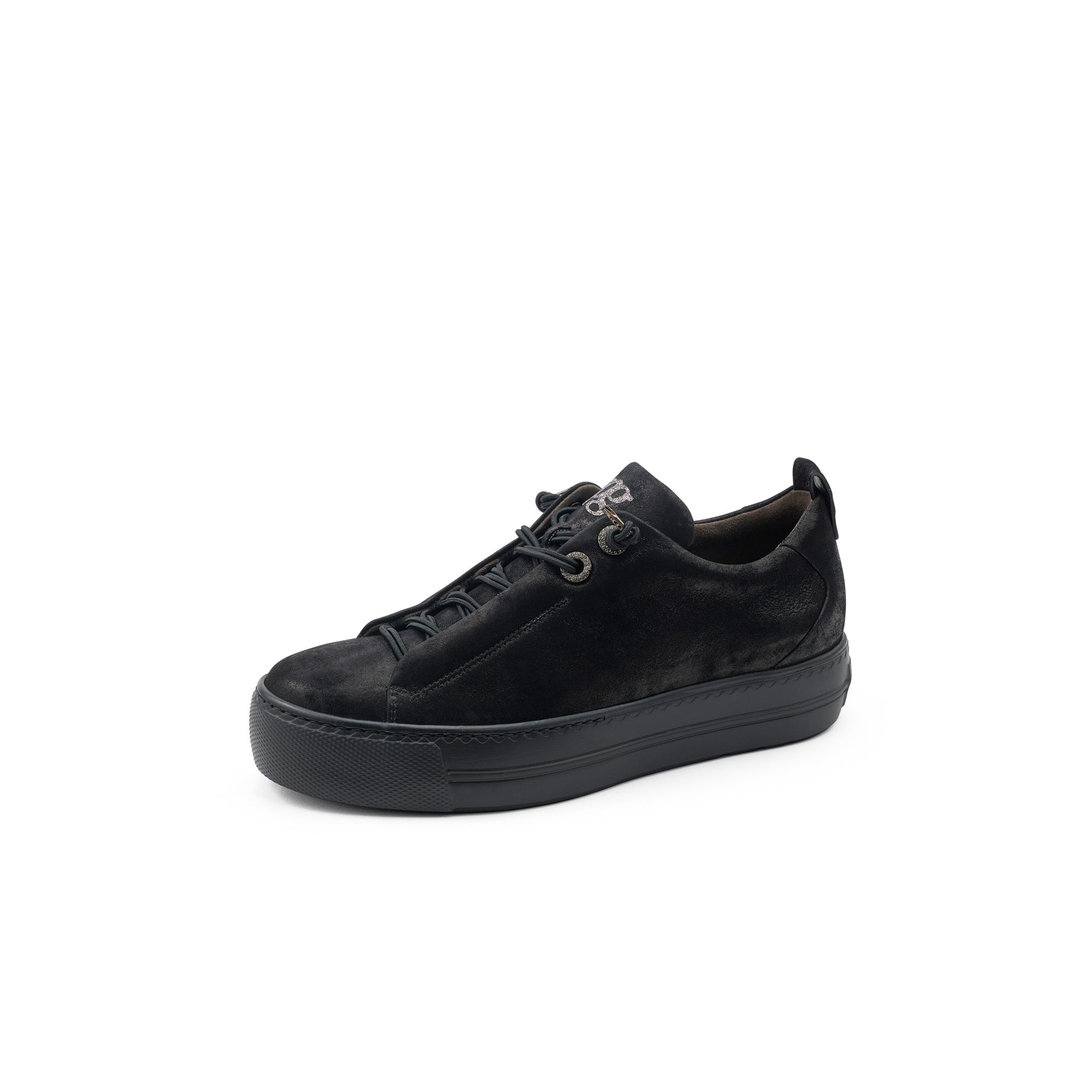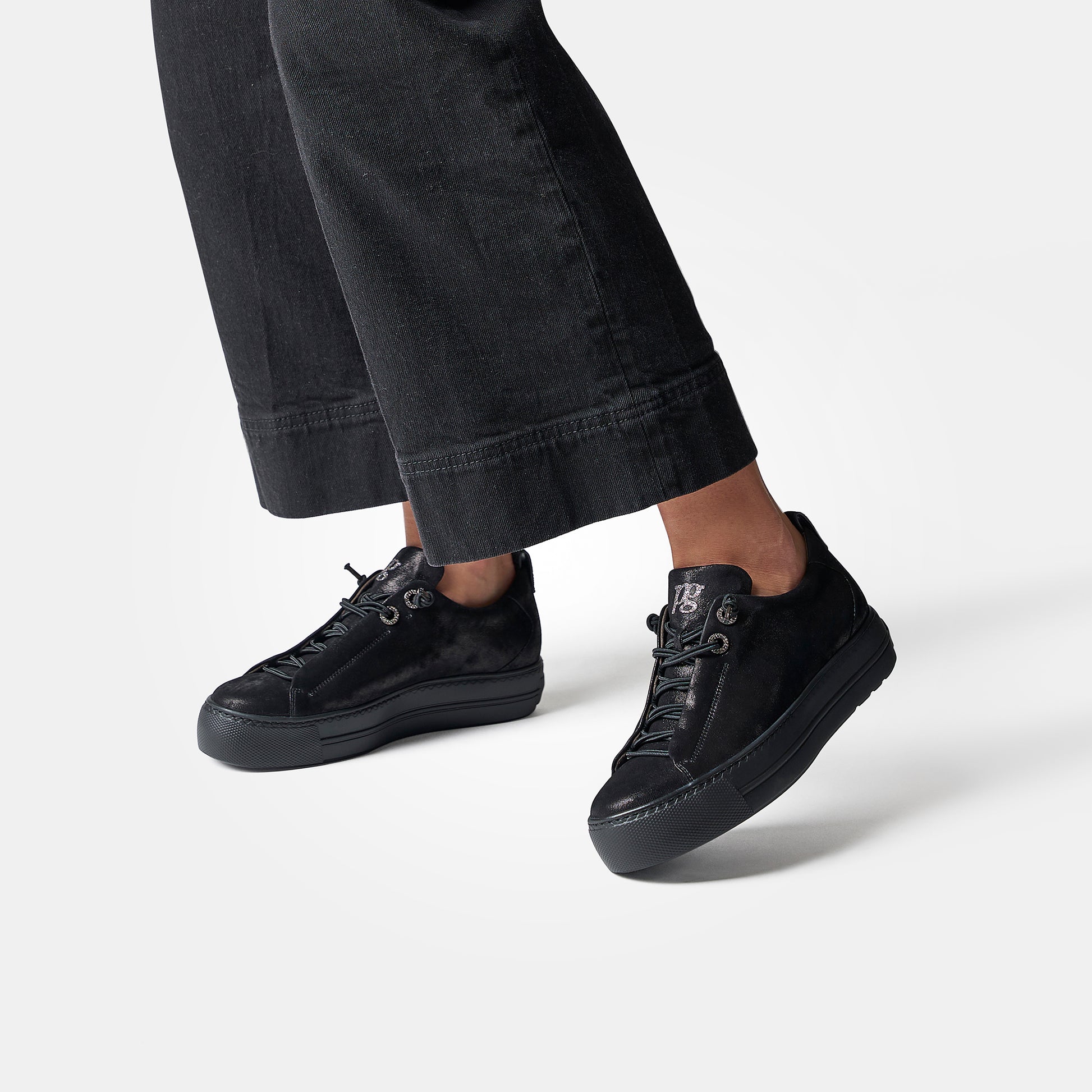Paul Green matt black leather sneakers with subtle shimmer suede leather upper and diamante eyelets and matching diamante PG logo. These exceptional Austrian sneakers are made from fine Italian leather by master shoe makers.