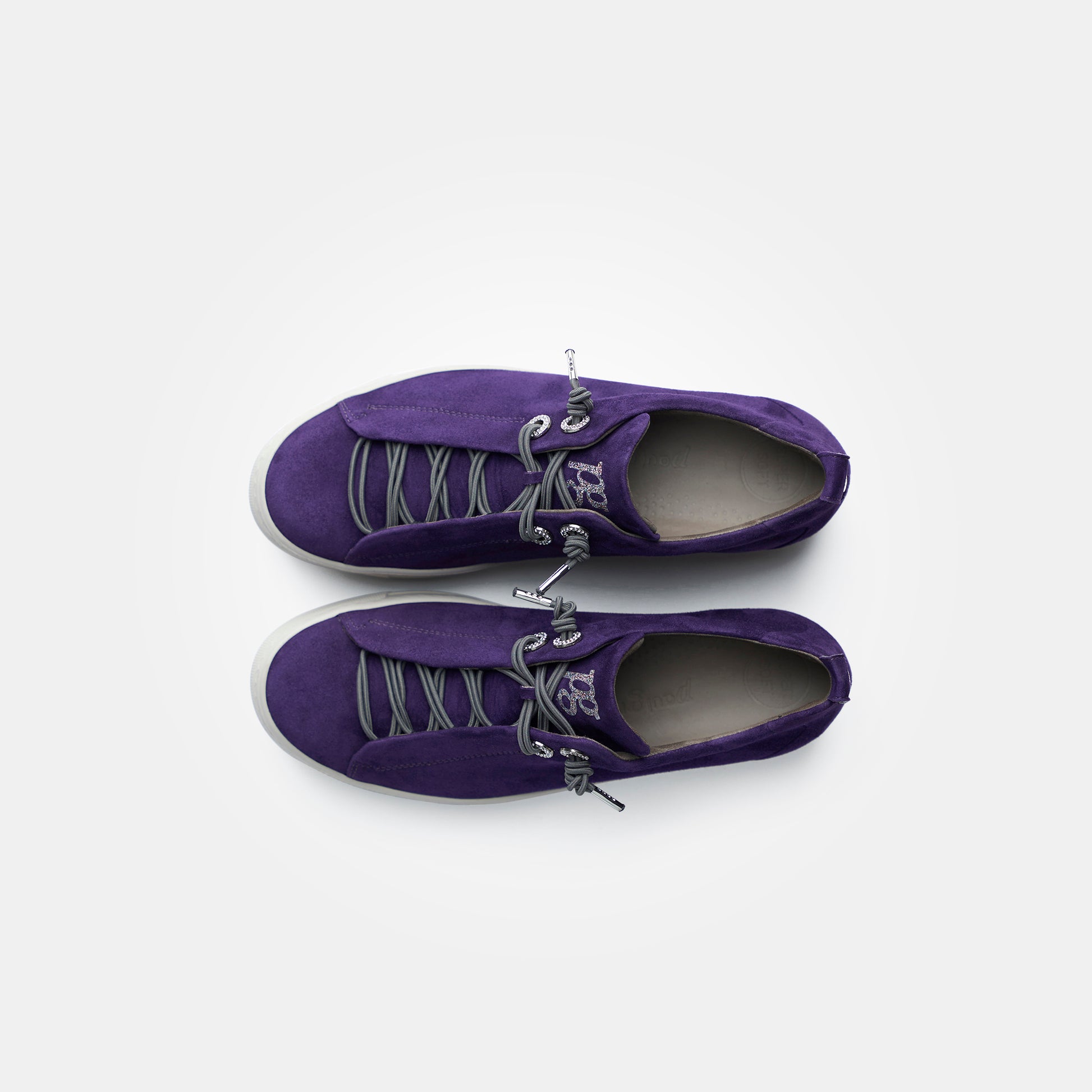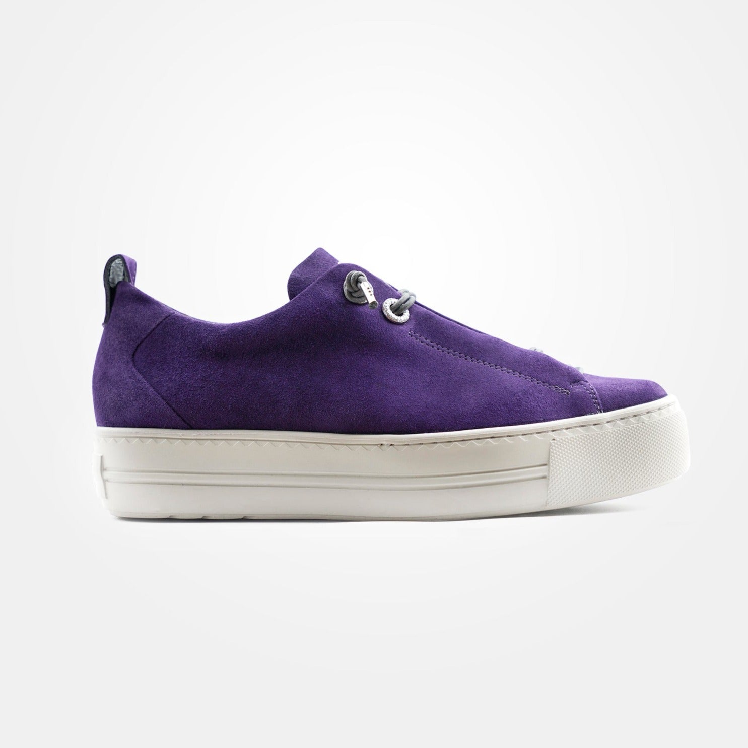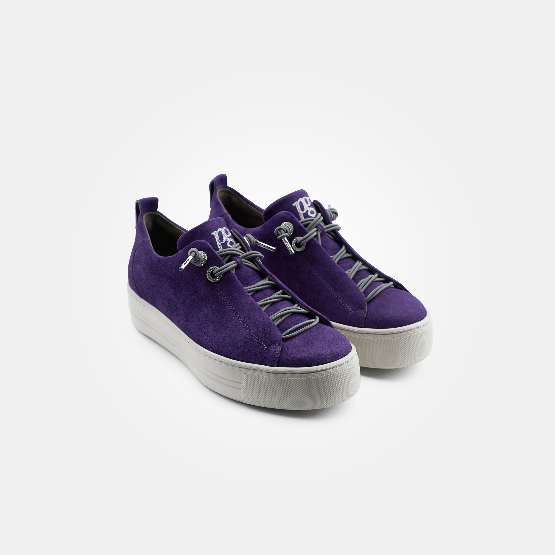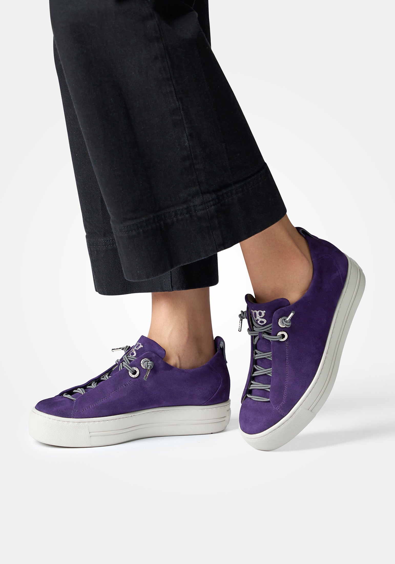 Paul Green super soft nubuck leather low top sneakers. These incredibly soft and lightweight purple nubuck sneakers with elastic laces showcase the luxury leathers from a master shoemaker. This model has two diamante studed eyelets and glitter PG sineage on the tongue which adds a little bit of sparkle. Paul Green shoes are handmade in Austria using only the finest leathers for admirable quality and exclusive design.