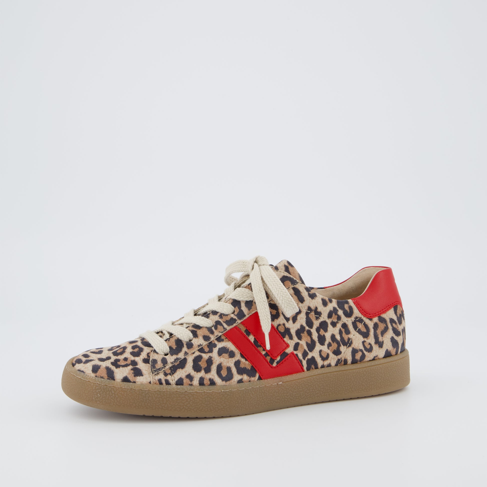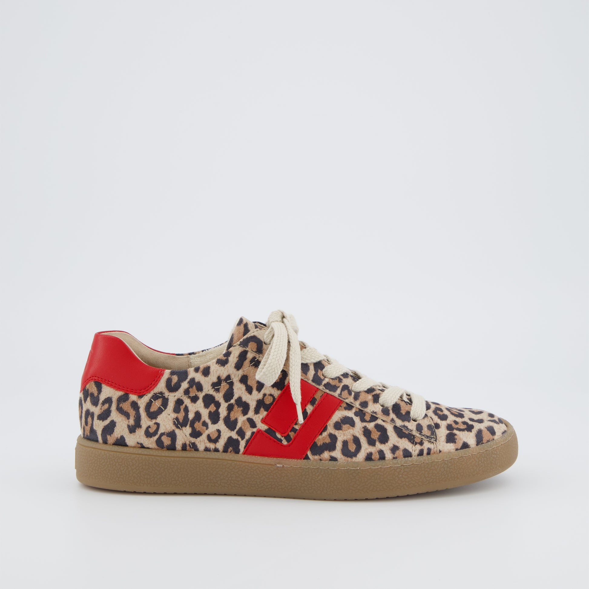 Paul Green super soft suede leather sneakers retro sneakers in leopard print with red accents. These cute retro trainers can be worn with a summer dress, skirts and shorts and your cut off jeans with ease. The outstanding comfort will encourage you to wear them everyday and you will wonder how you managed without them. Paul Green shoes are handmade in Austria using only the finest leathers for admirable quality and exclusive design.