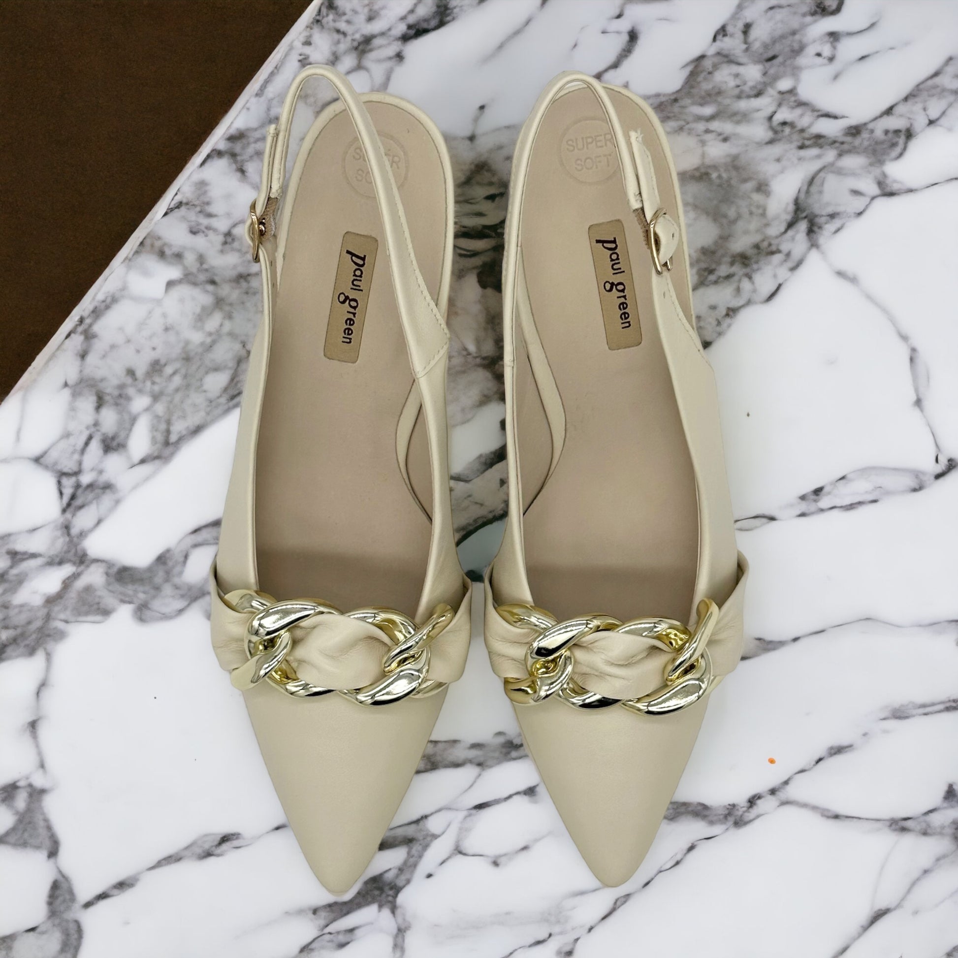 Paul Green super soft leather slingback heels. These beautifully soft, cream leather shoes have an oversized gold chain detail, adding a dressy touch to a timeless classic.