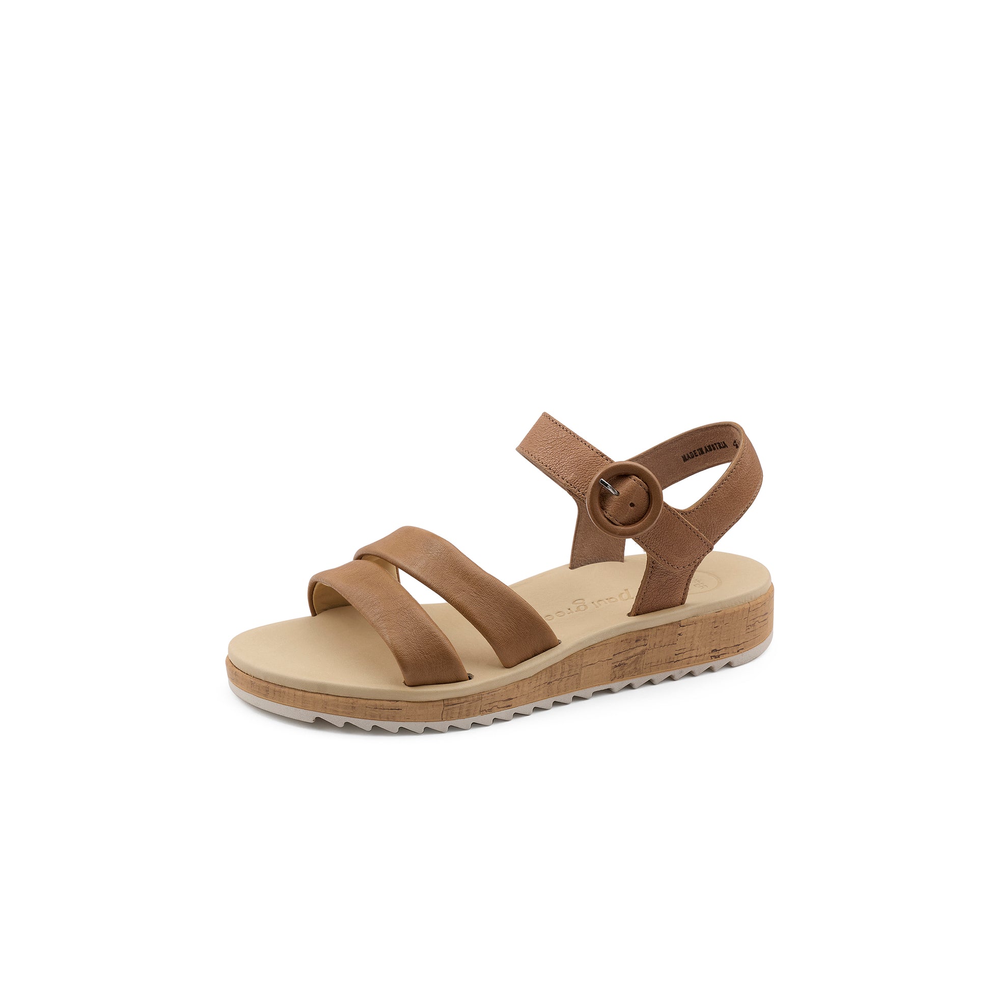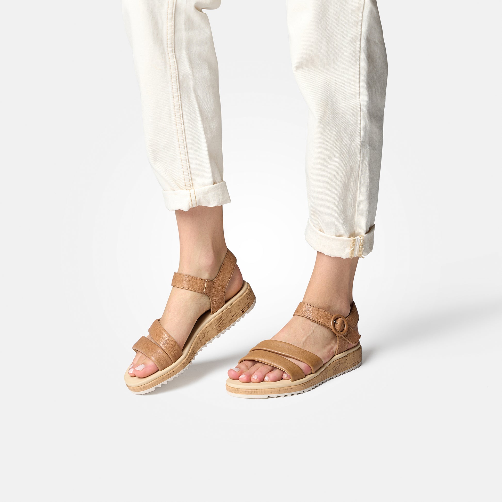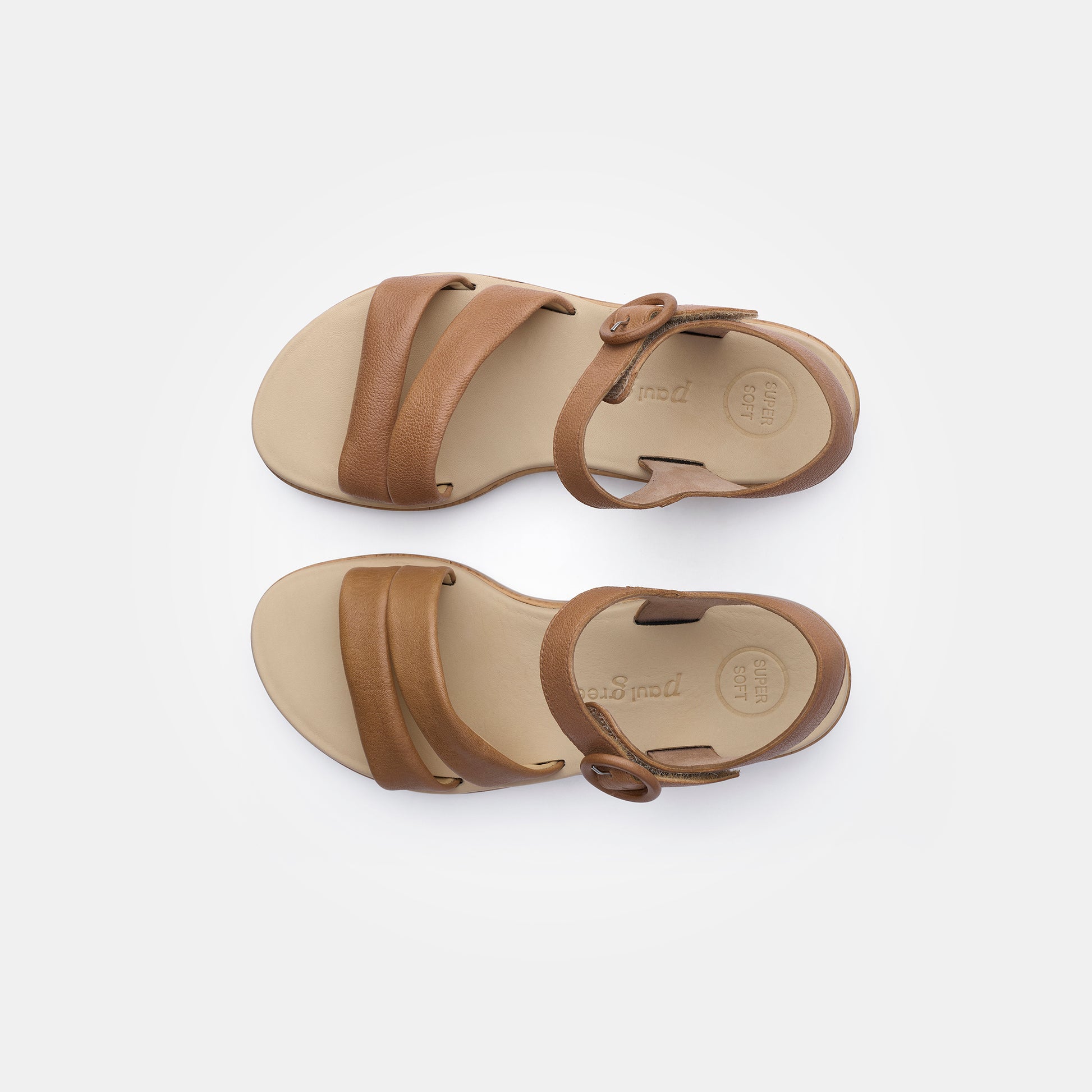 Paul Green tan leather sandals. The toe straps are stitched and turned so there are no rough edges just beautifully soft quilted leather against your feet. The ankle strap is a hook and loop fastening disguised as a buckle.