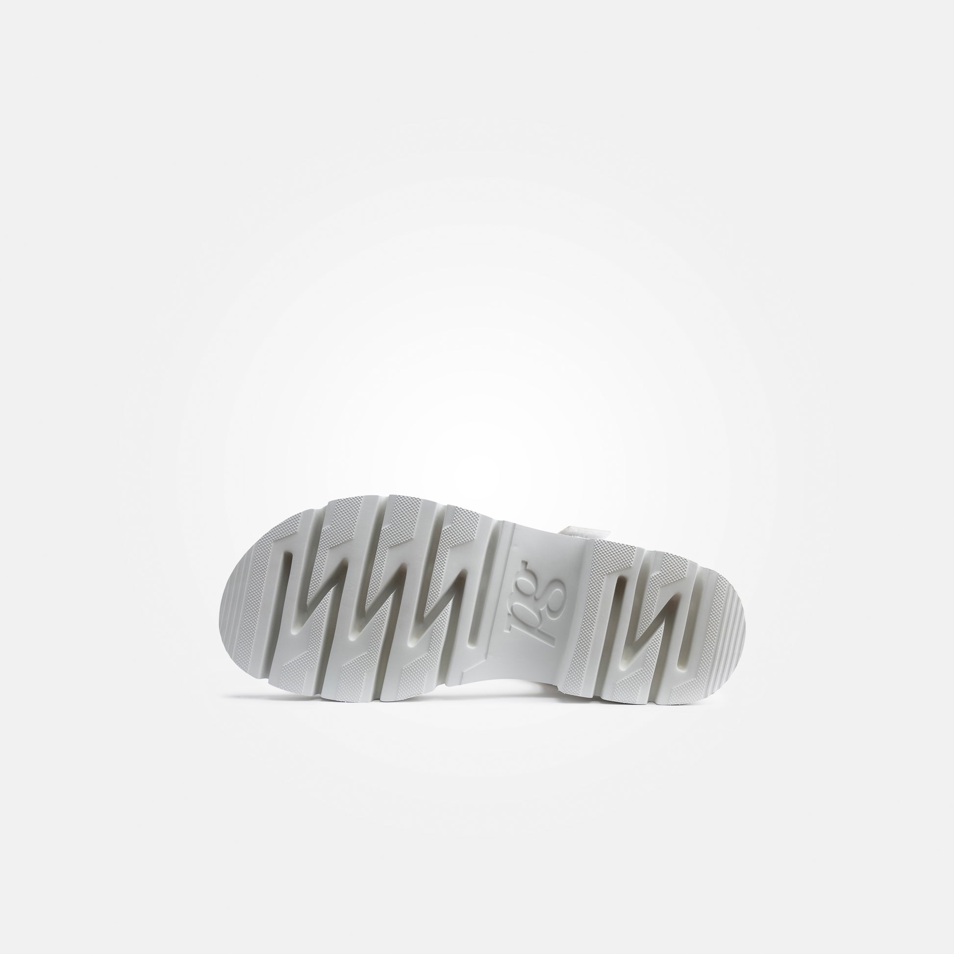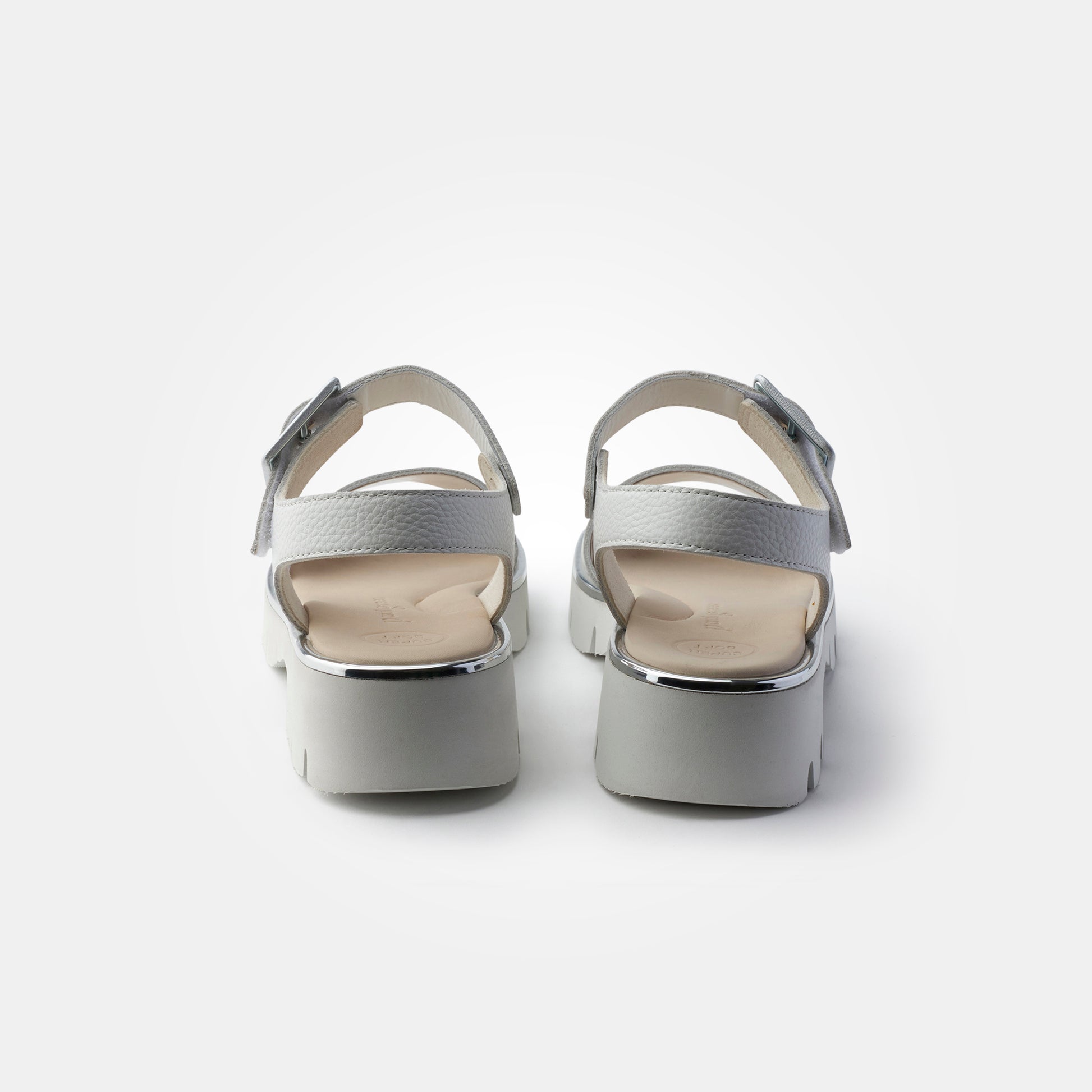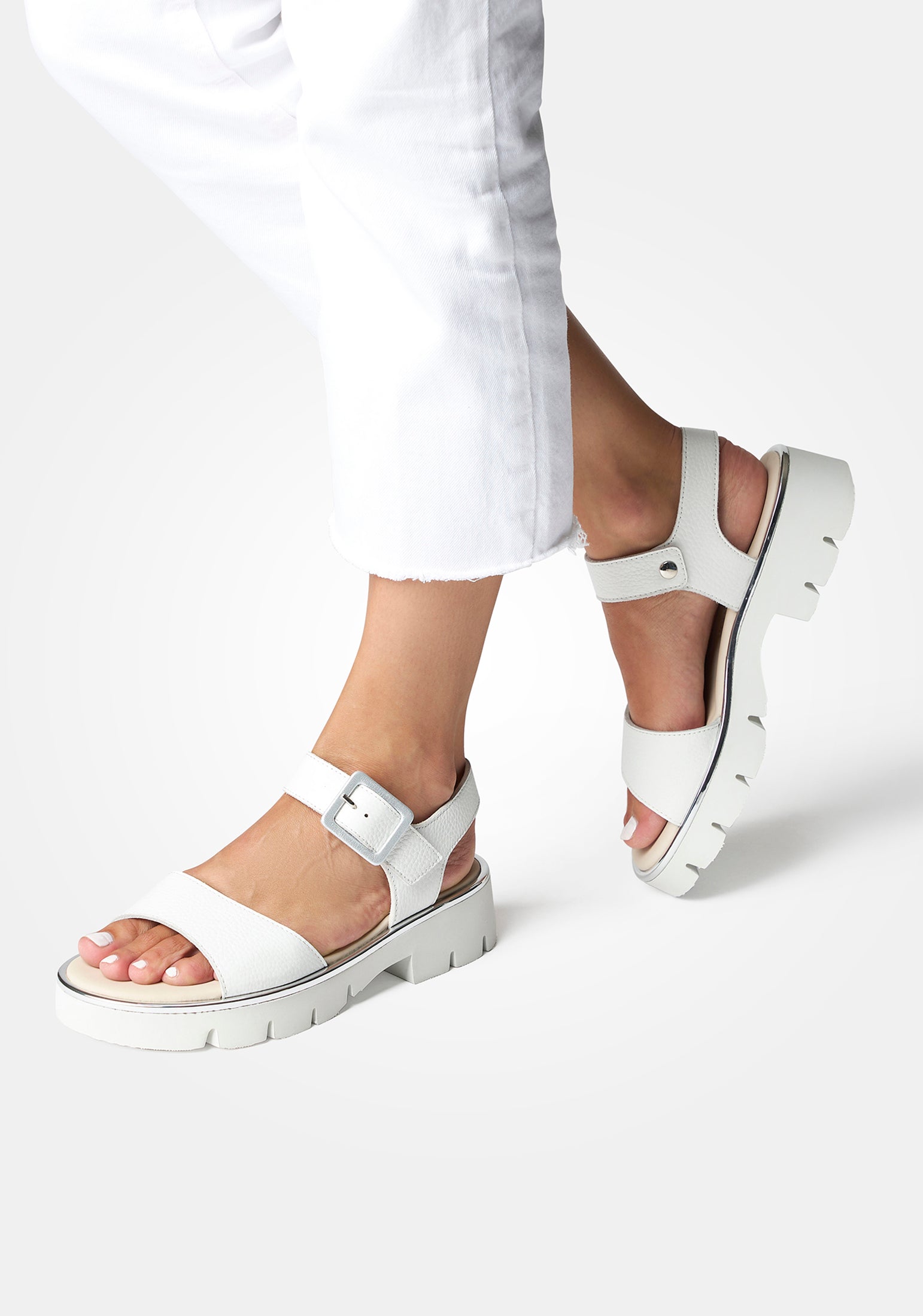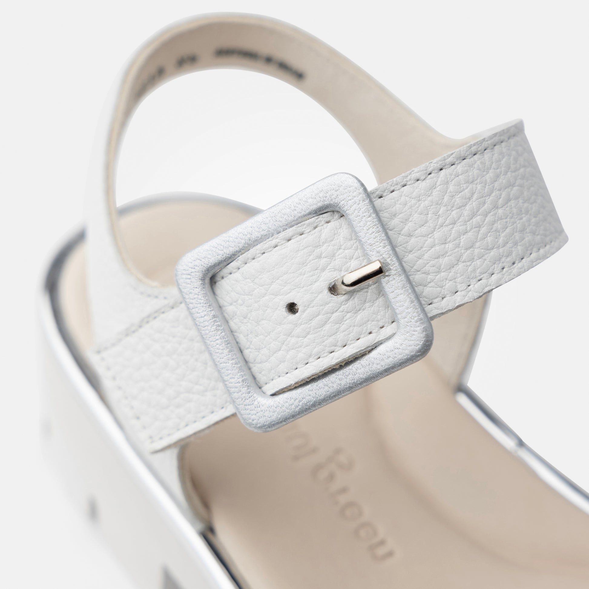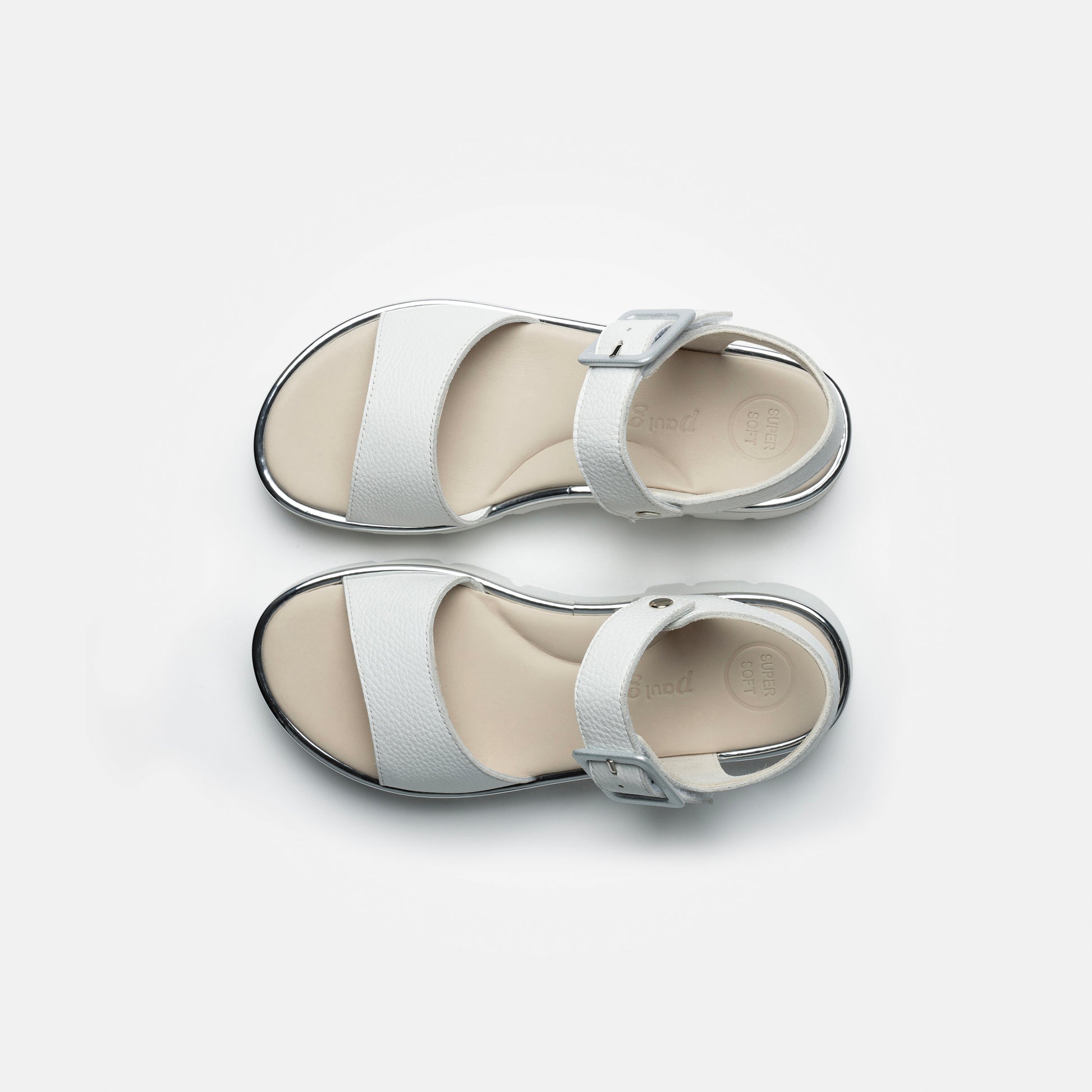 Paul Green white leather sandals with silver trim. A clean silhouette and simplicity makes these comfy leather walking sandals stand out. Paul Green sandals have a small arch support built in and an adjustable faux buckle hook and loop ankle strap.
