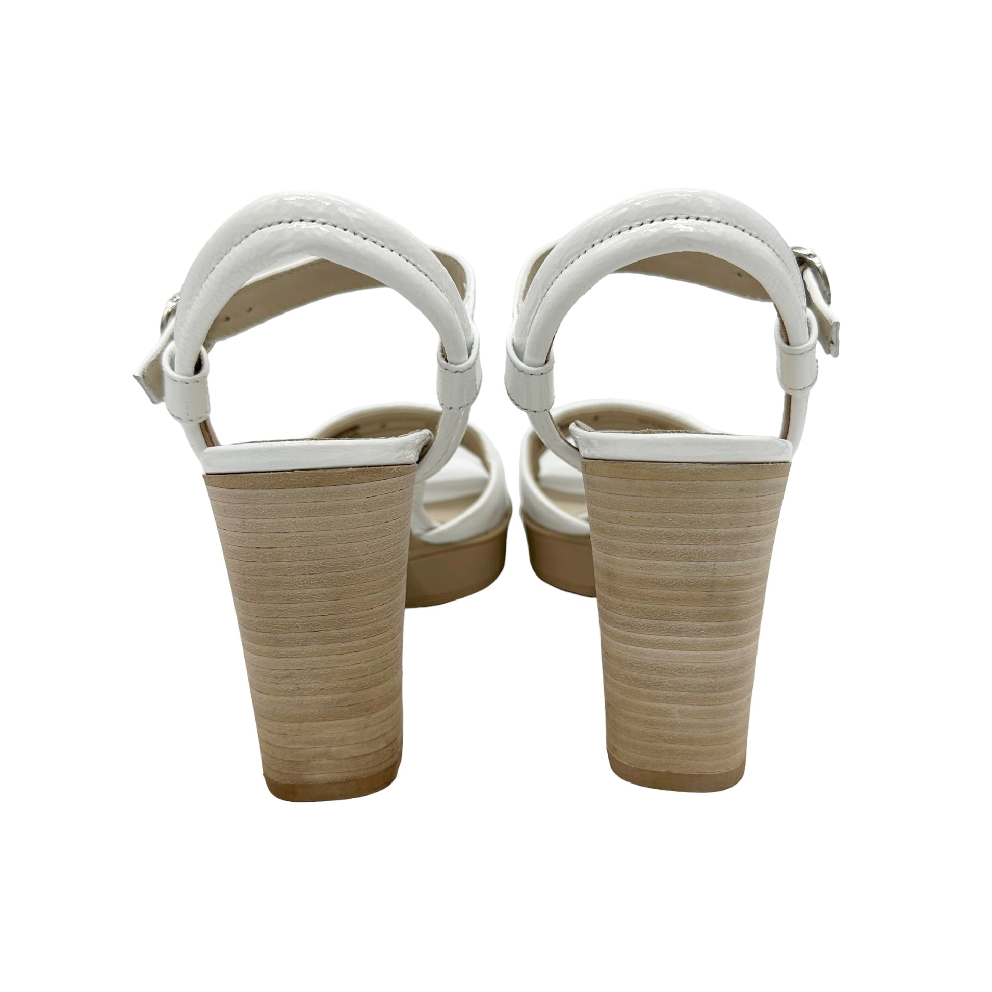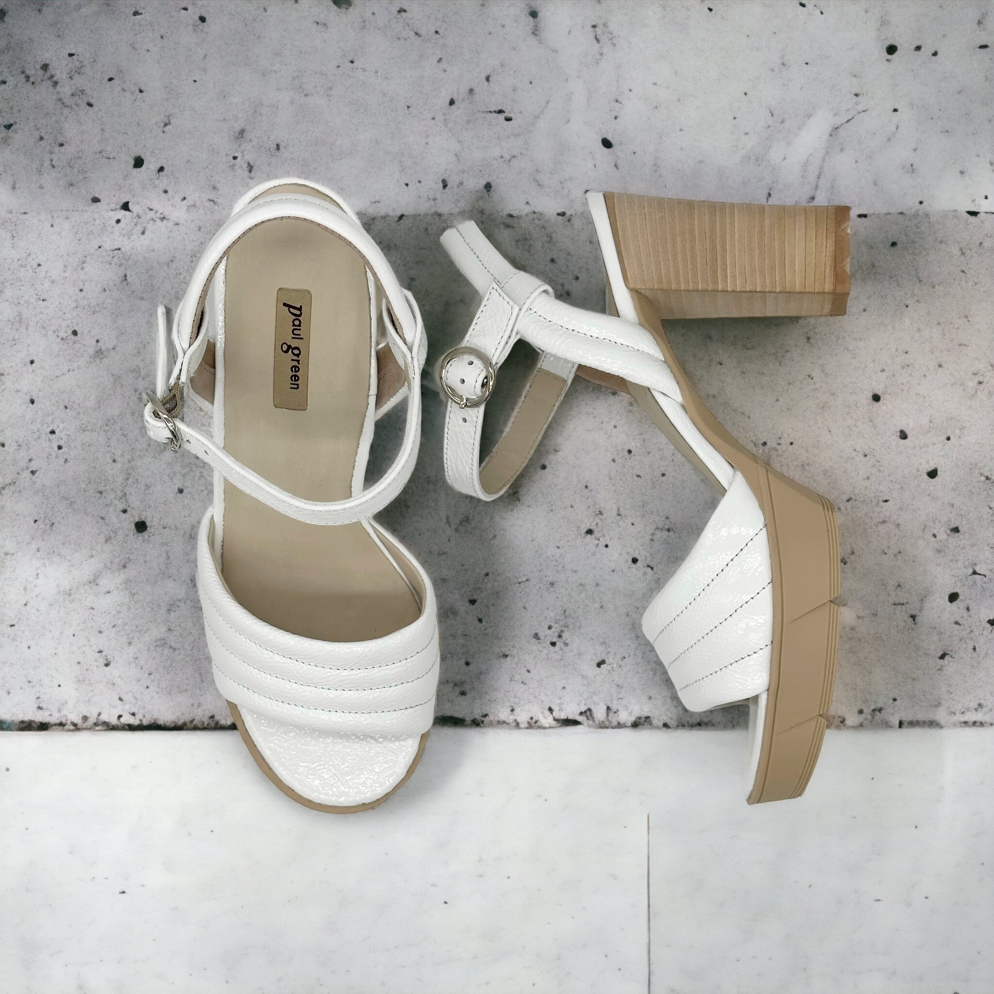 Paul Green stacked heel sandals with adjustable ankle strap and cushioned leather insoles.