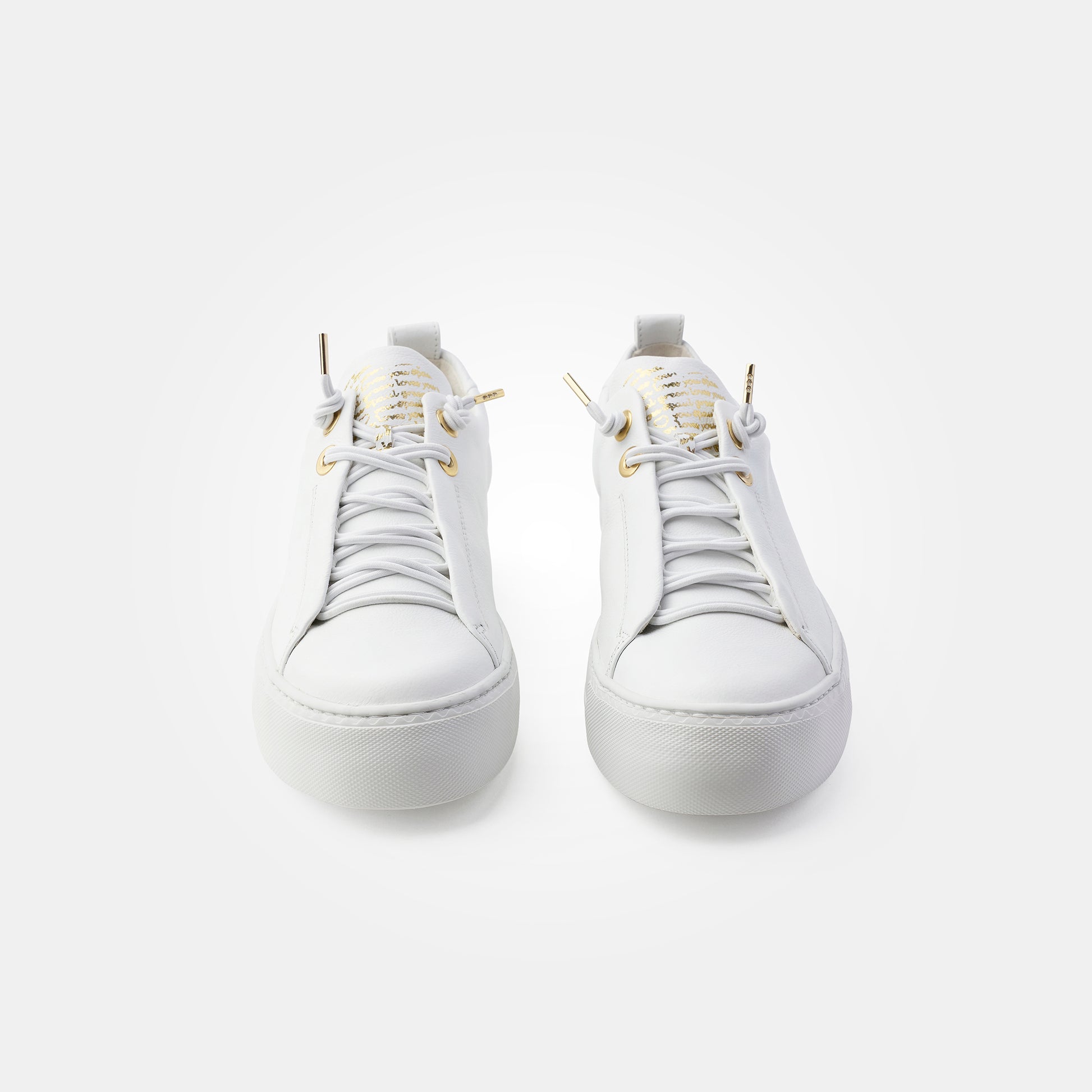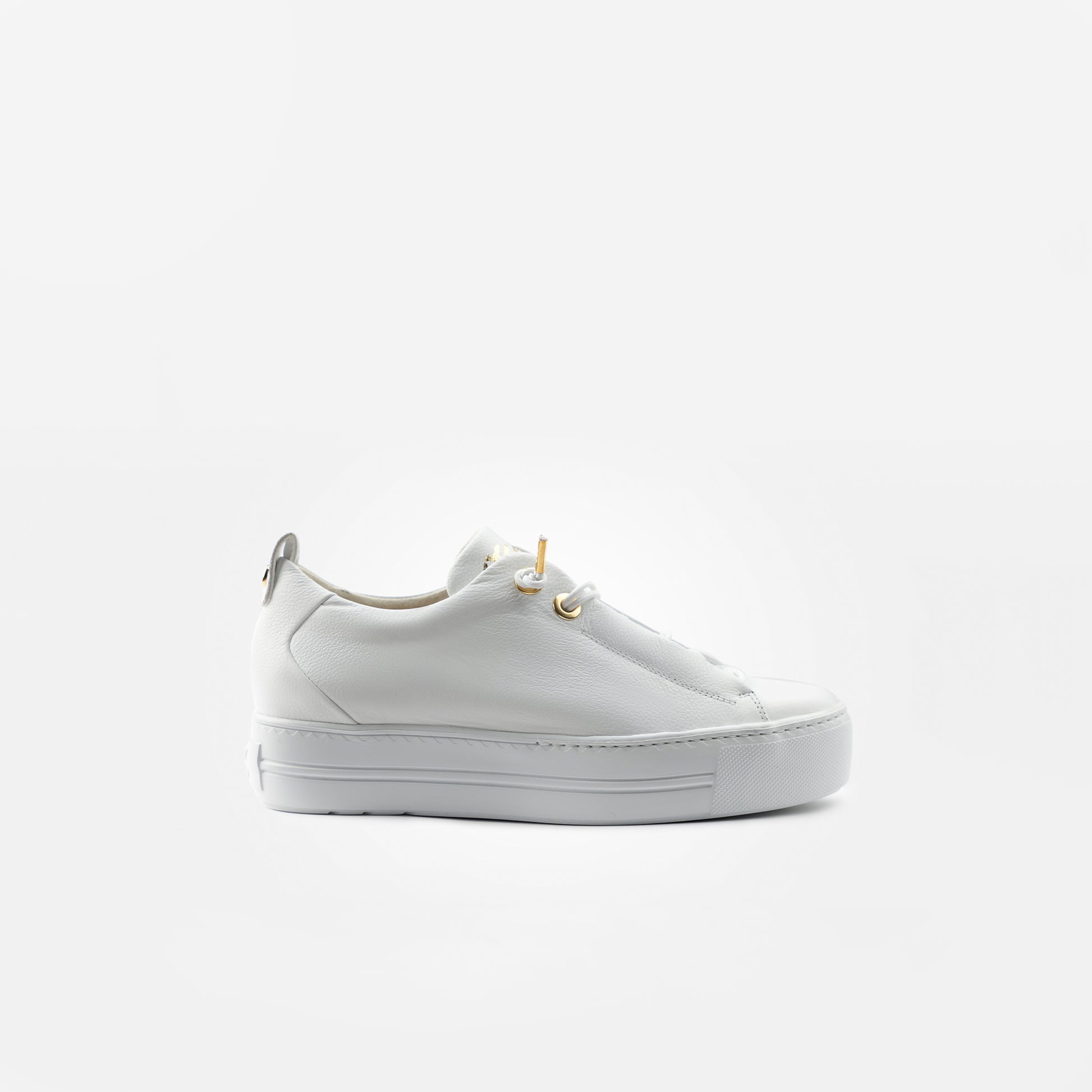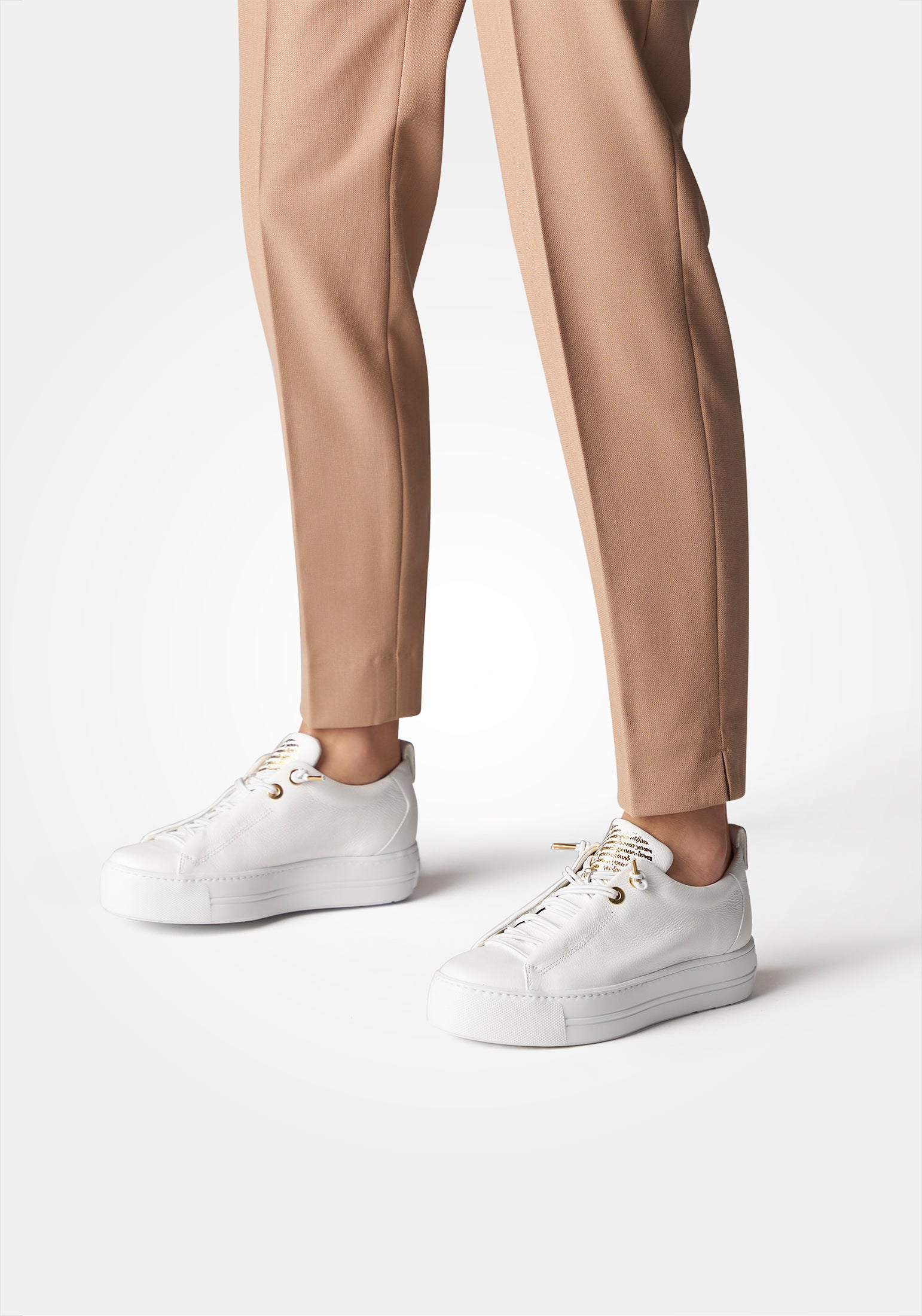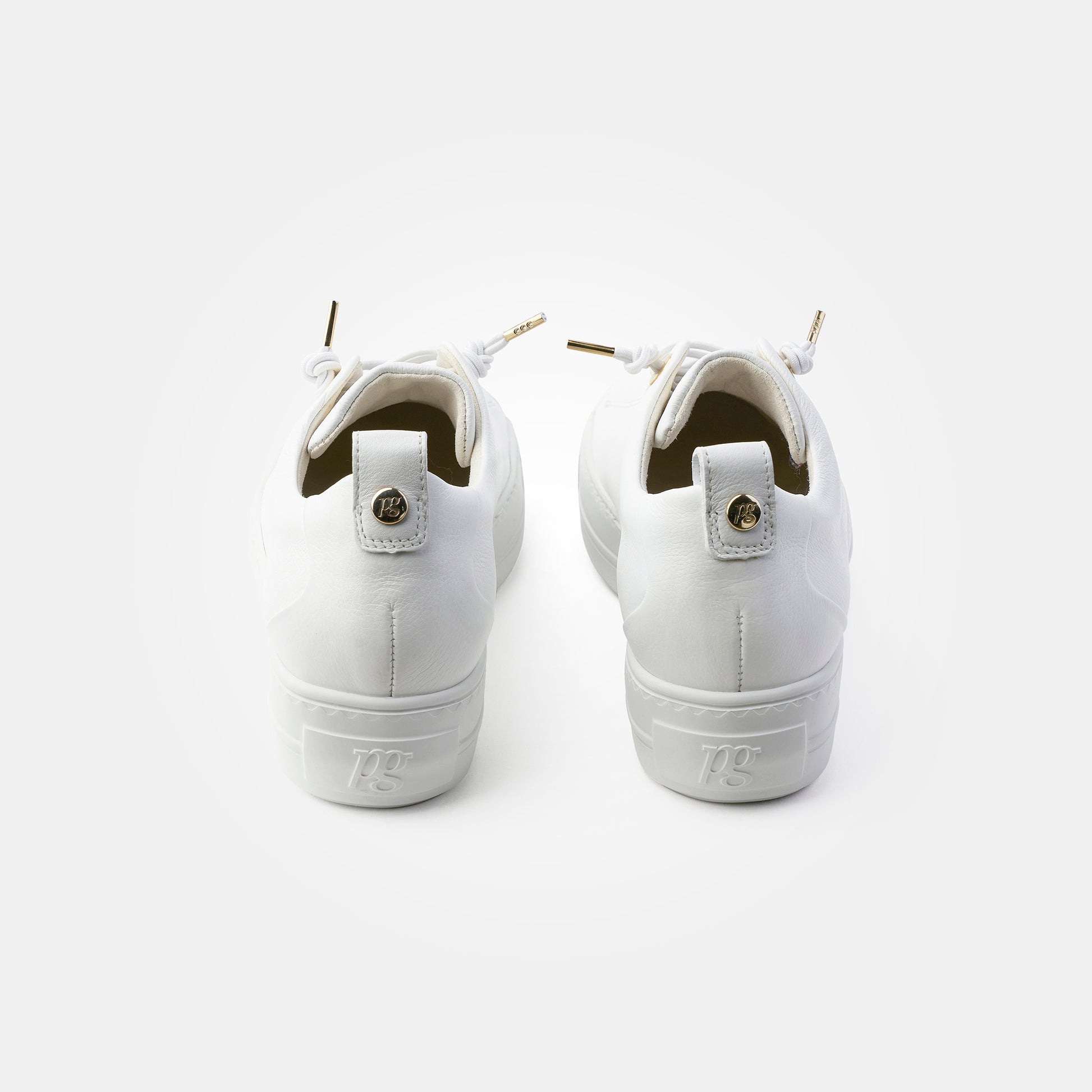Paul Green super soft calf leather leather low top sneakers. These incredibly soft and lightweight white leather sneakers with gold trims showcase the luxury leathers from a master shoemaker. Paul Green shoes are handmade in Austria using only the finest leathers for admirable quality and exclusive design.