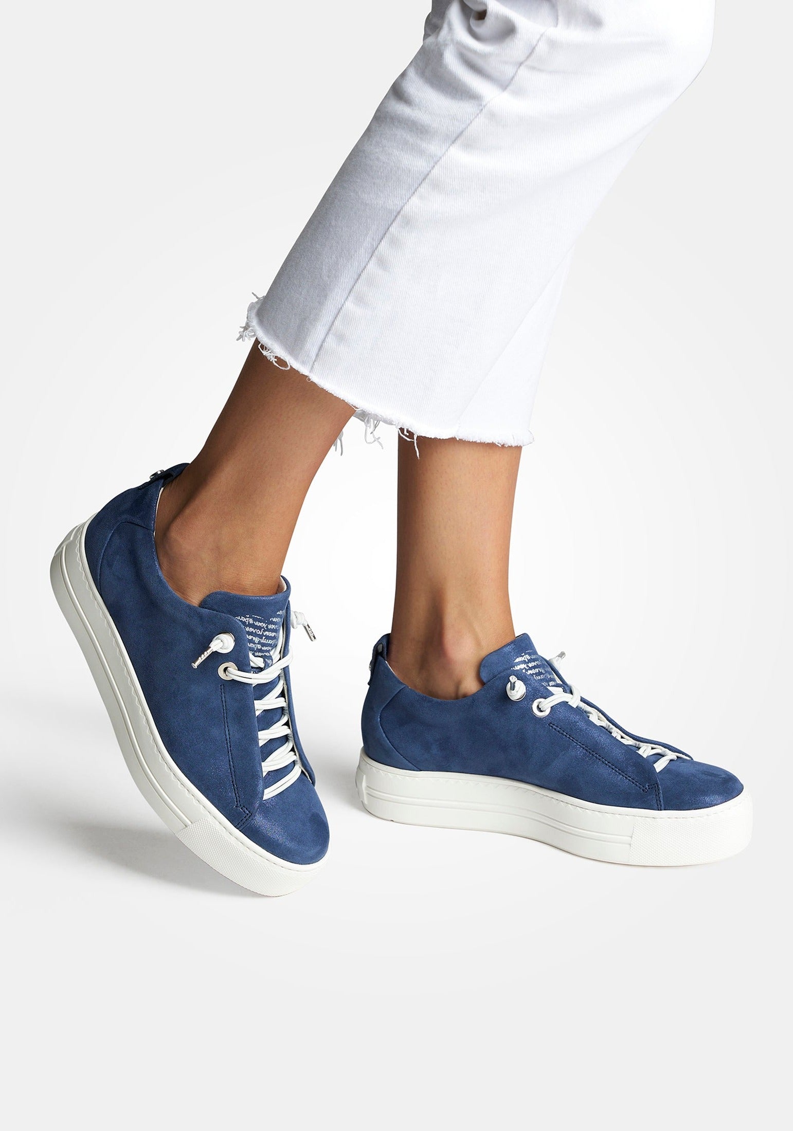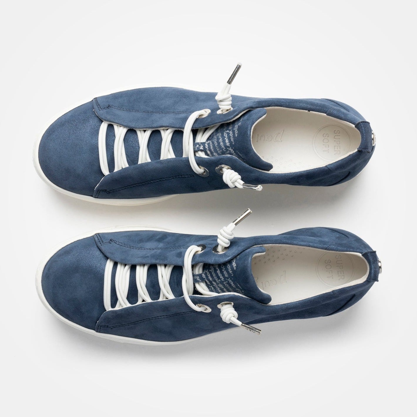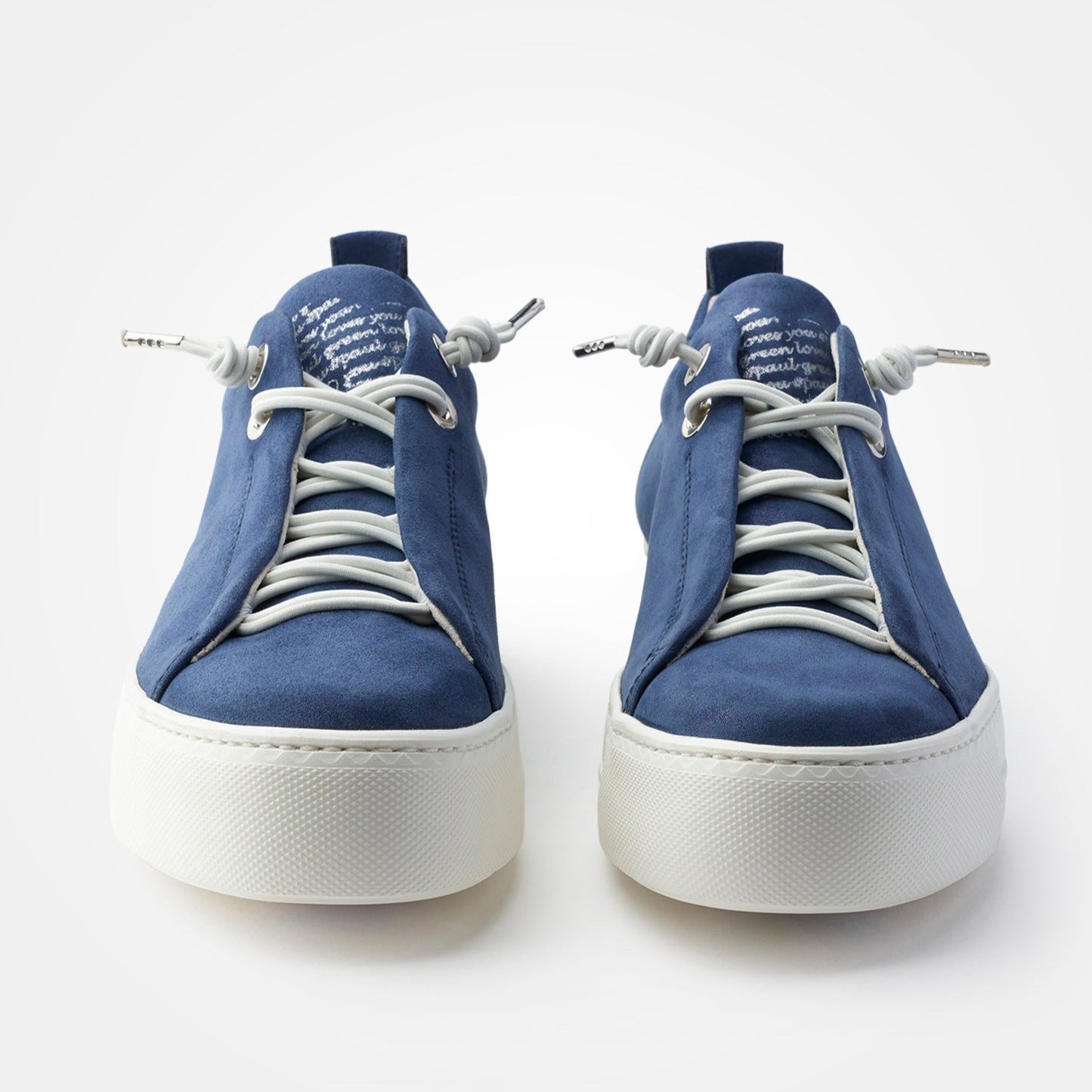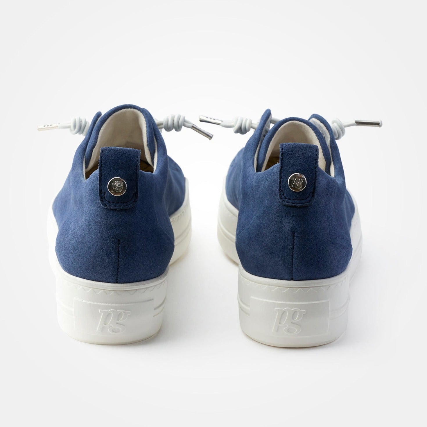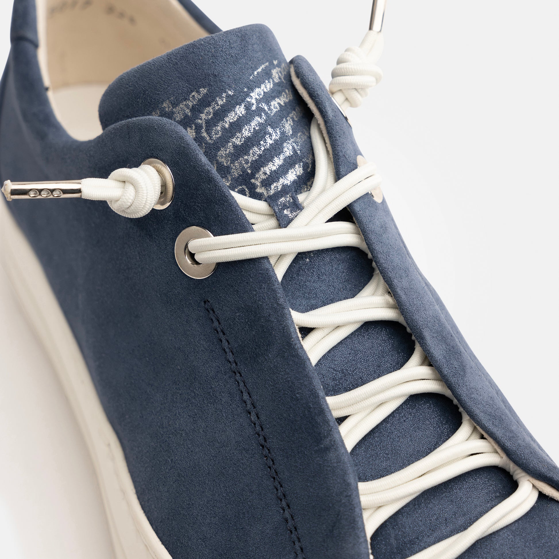 Paul Green super soft calf nubuck leather low top sneakers. These incredibly soft and lightweight blue shimmer nubuck sneakers with elastic laces showcase the luxury leathers from a master shoemaker. Paul Green shoes are handmade in Austria using only the finest leathers for admirable quality and exclusive design.