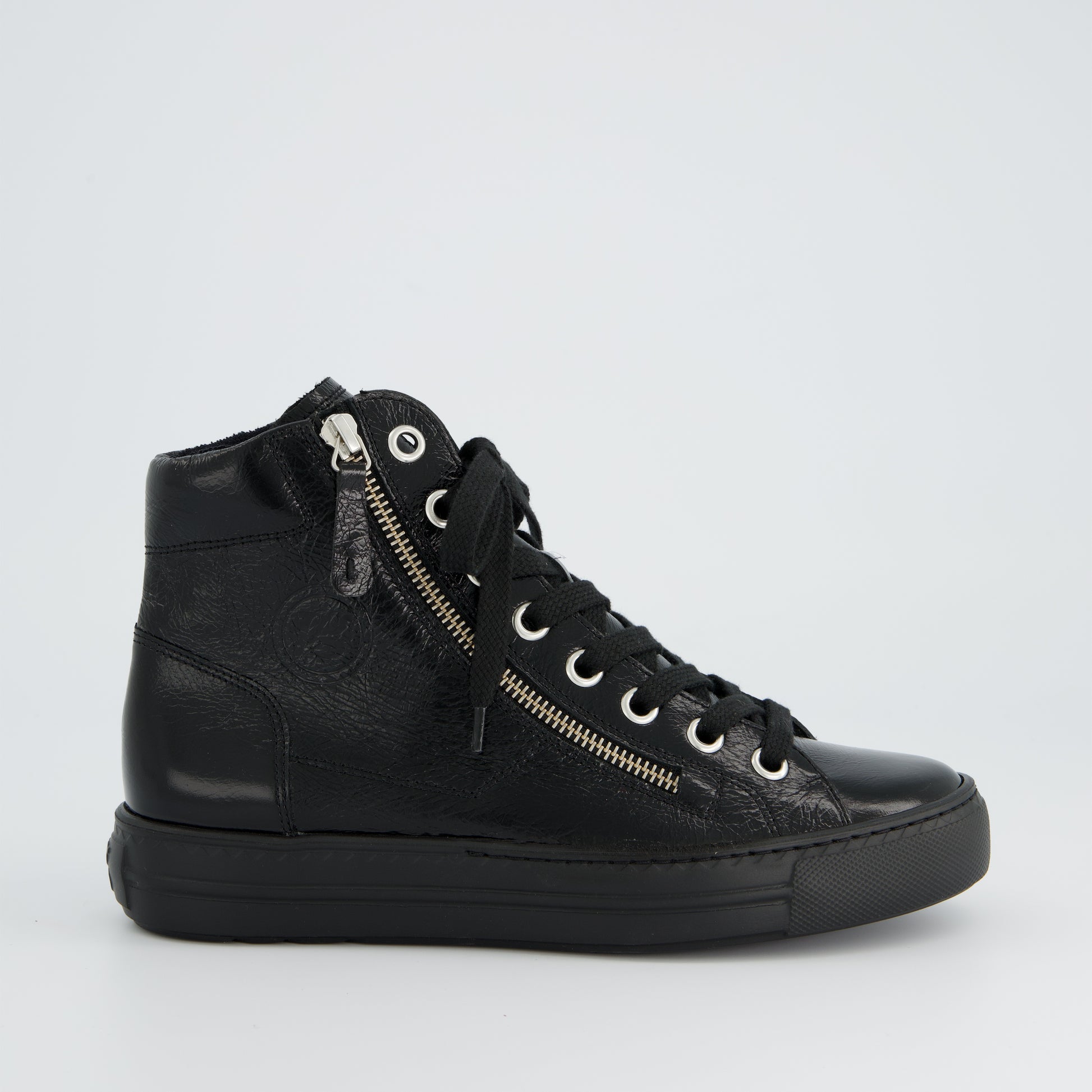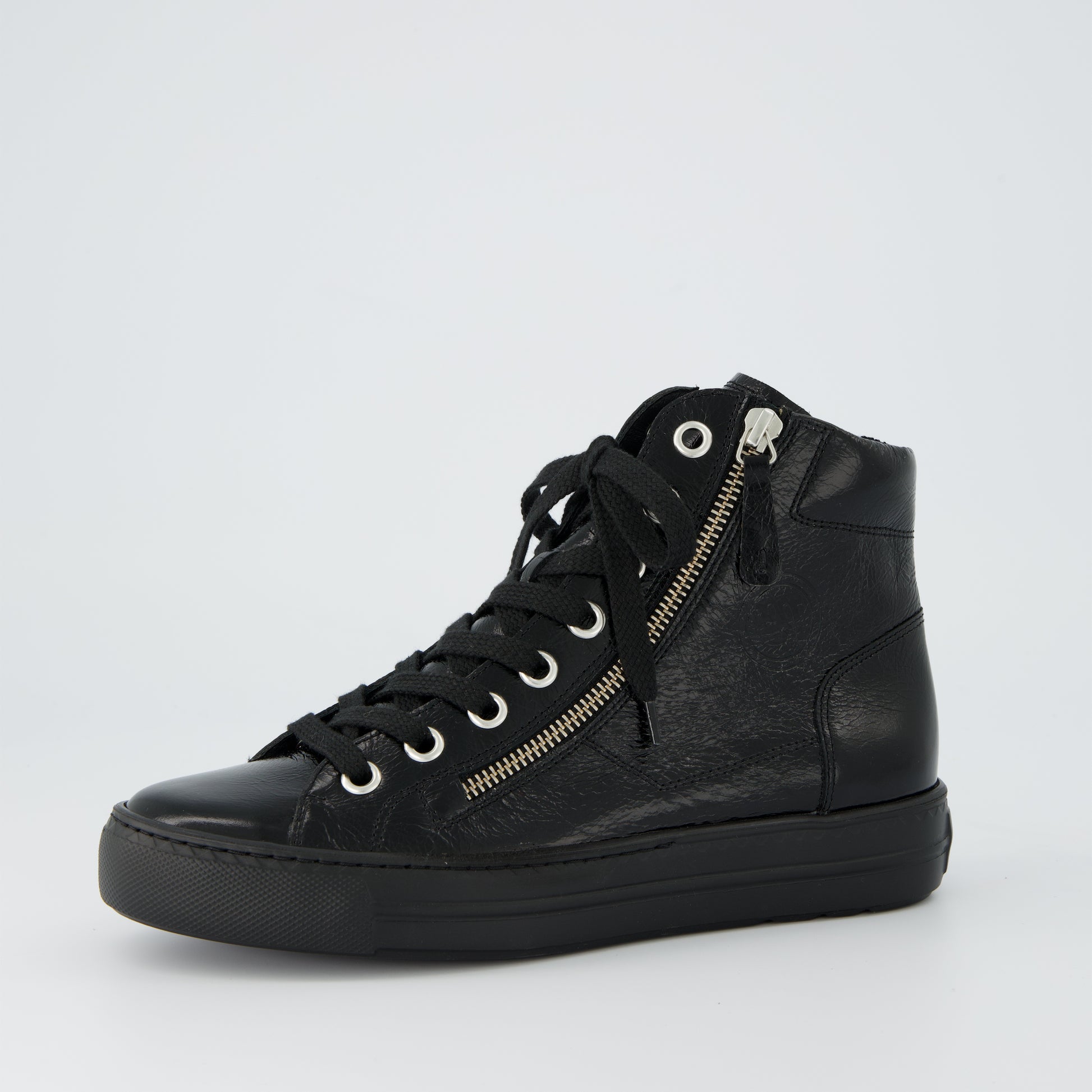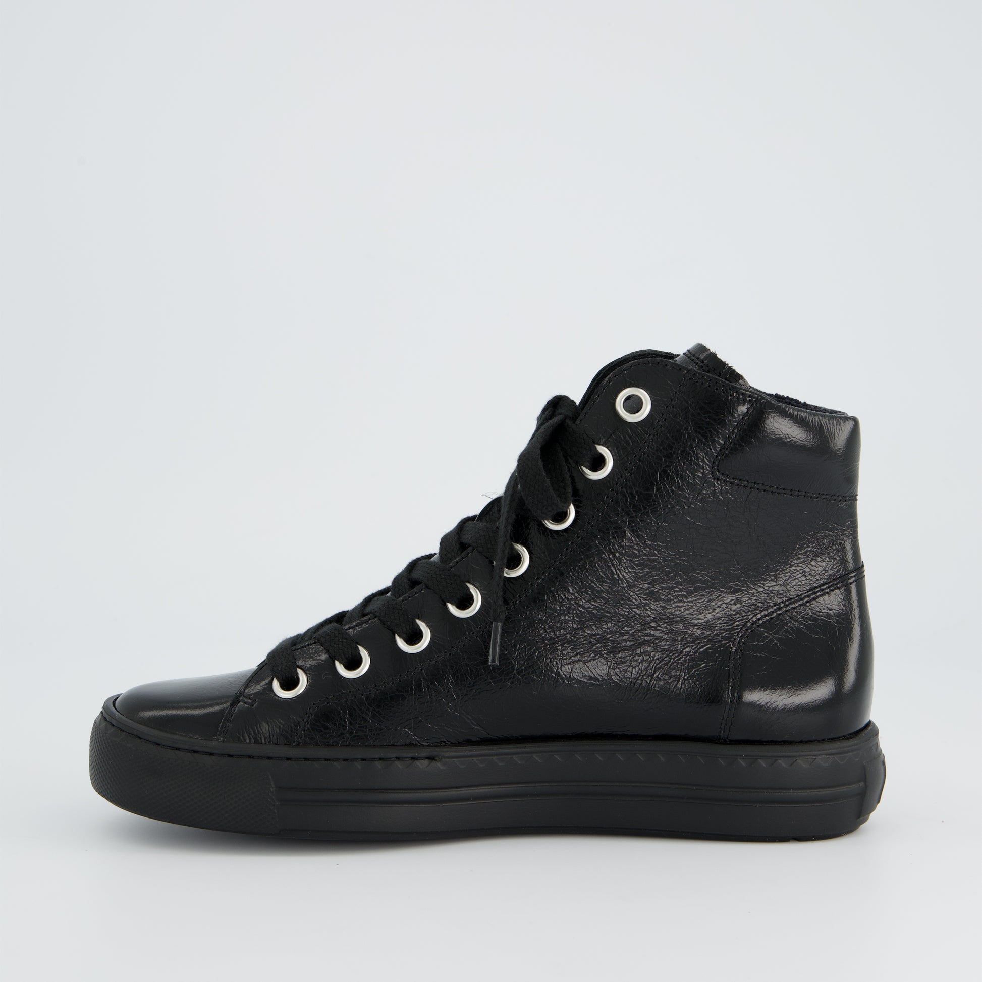 Paul Green glossy black leather hi-top sneaker boots. These incredibly soft and lightweight sneaker boots showcase the luxury leathers from a master shoemaker. The glossy finish is not the same as patent leather. These are smooth leathers polished to a crystallo finish rather than a plastic lacquer applied to the surface. Paul Green shoes are handmade in Austria using only the finest leathers for admirable quality and exclusive design.