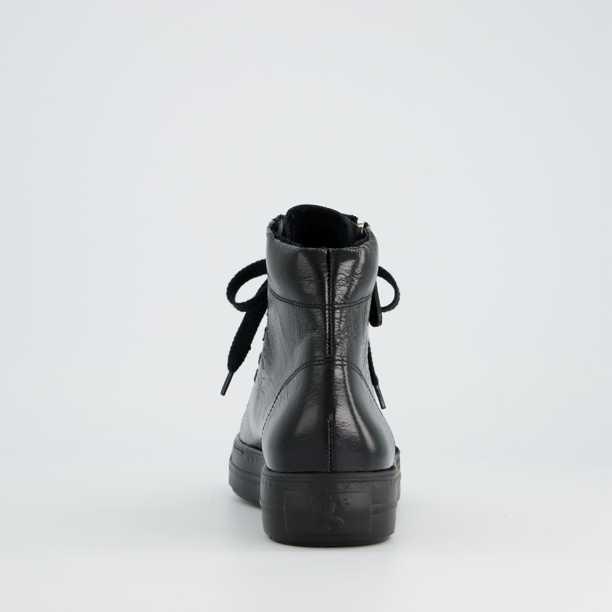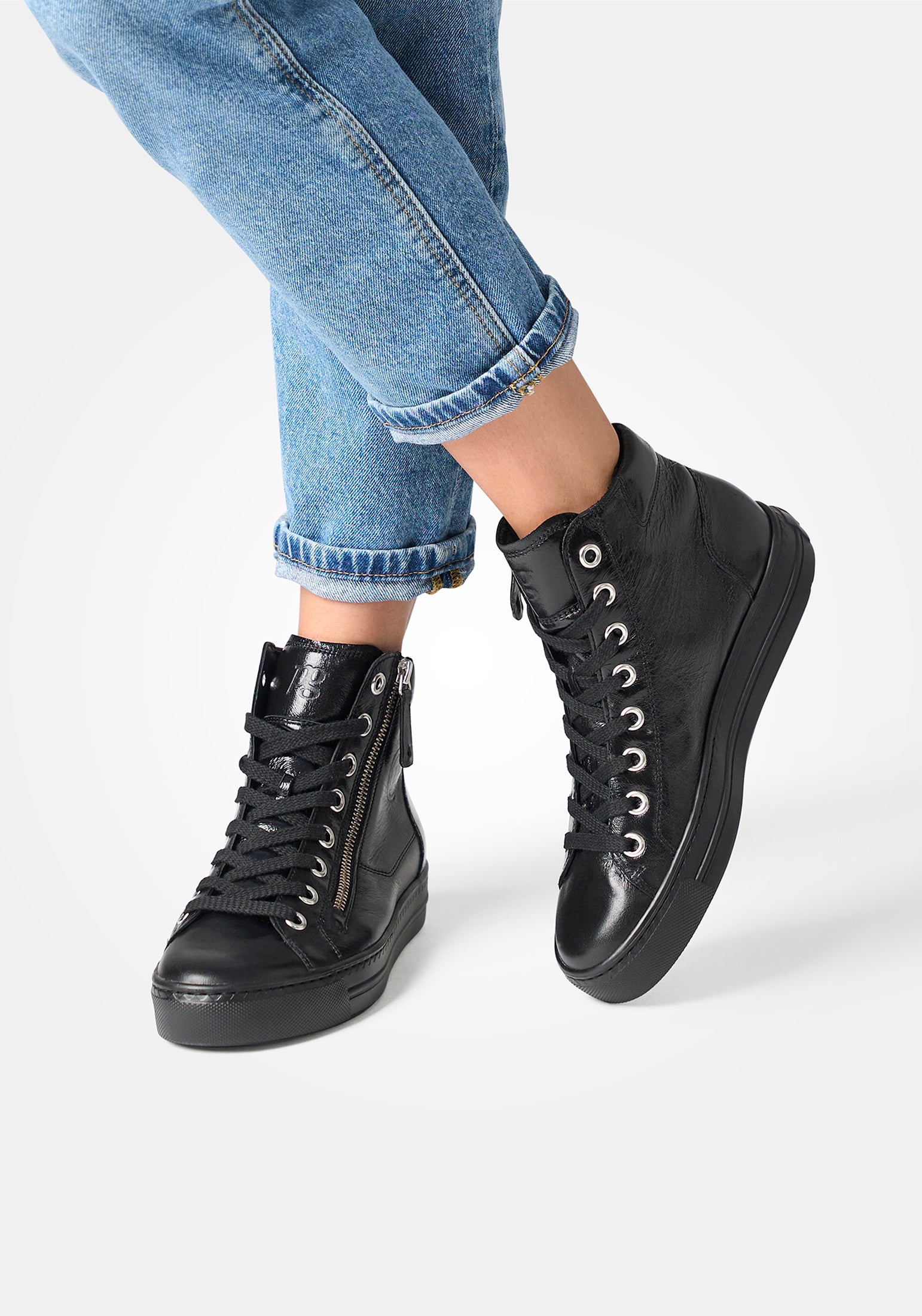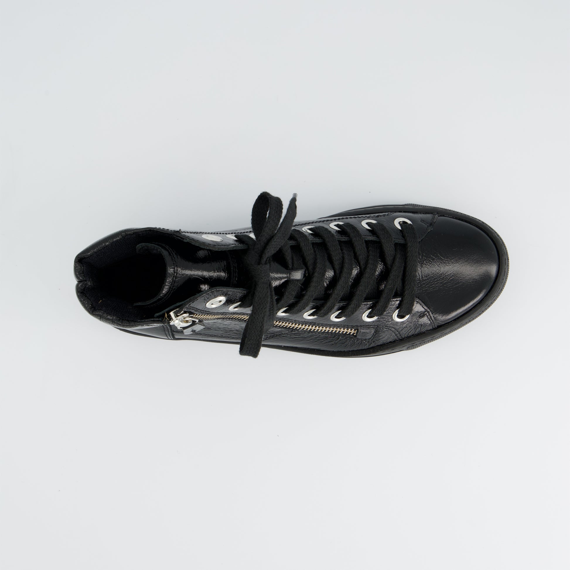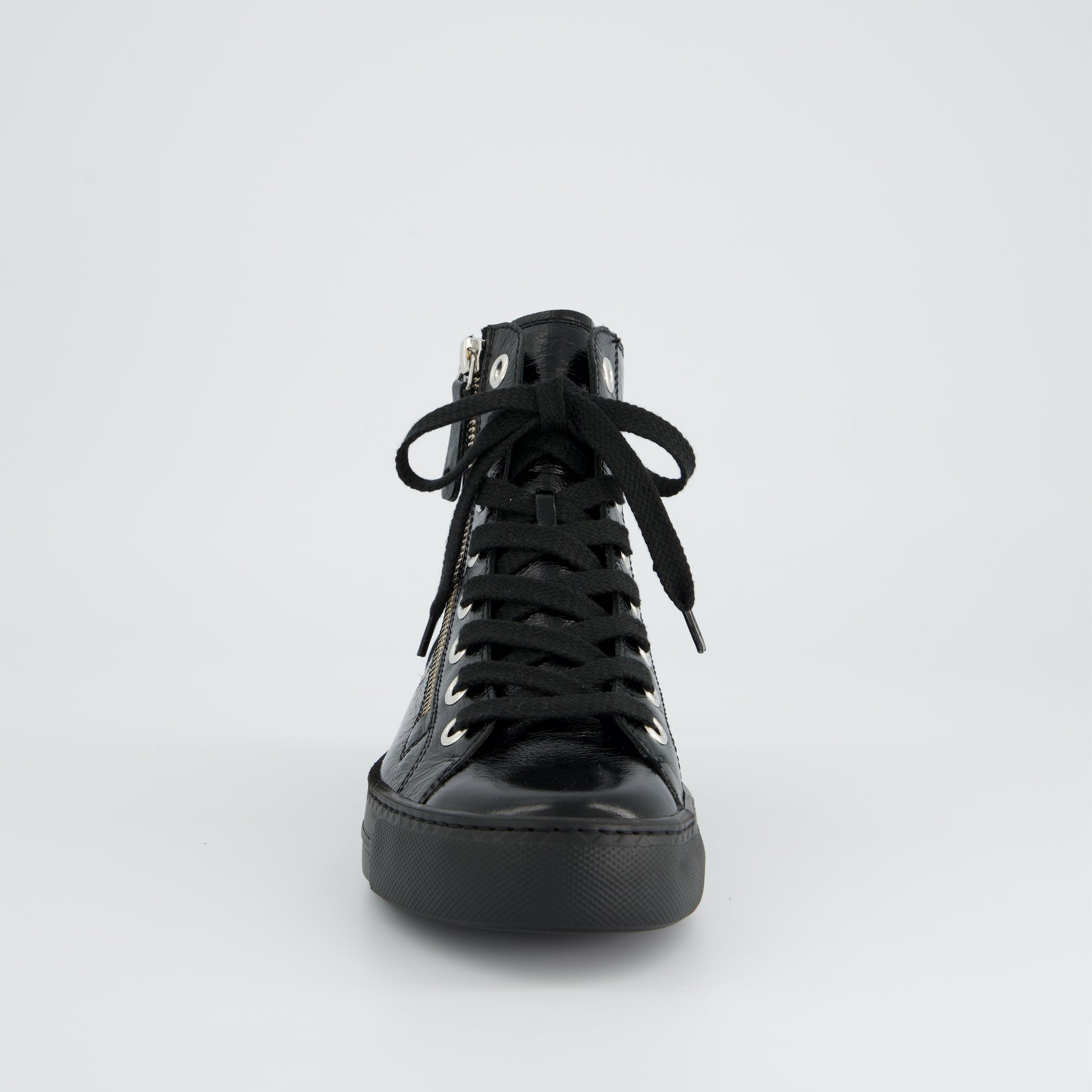 Paul Green glossy black leather hi-top sneaker boots. These incredibly soft and lightweight sneaker boots showcase the luxury leathers from a master shoemaker. The glossy finish is not the same as patent leather. These are smooth leathers polished to a crystallo finish rather than a plastic lacquer applied to the surface. Paul Green shoes are handmade in Austria using only the finest leathers for admirable quality and exclusive design.