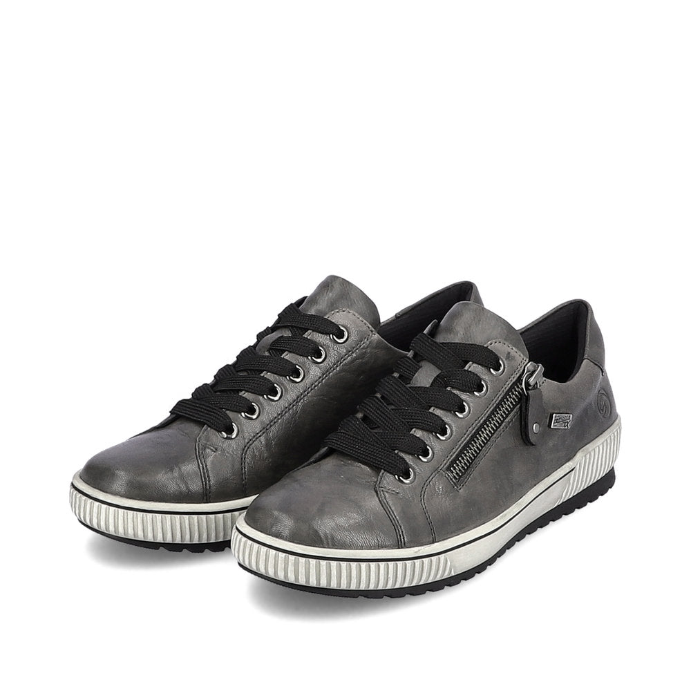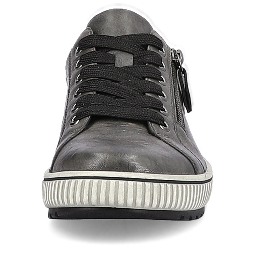 Thia Remonte Women’s casual leather sneaker with laces and a side zip, providing optimal comfort and adjustability. These trainers feature a crinkled leather upper with an off-white midsole, why not pair them with your favourite jeans for the perfect look.