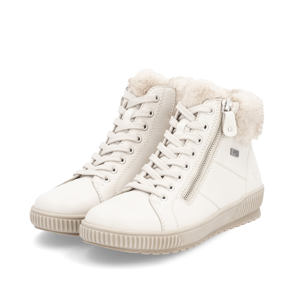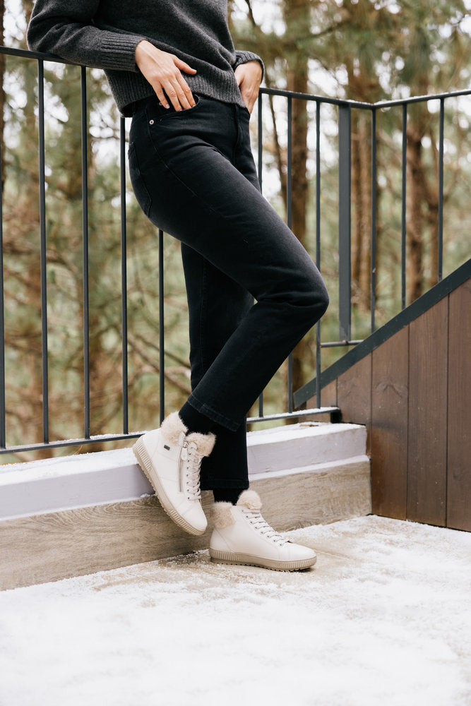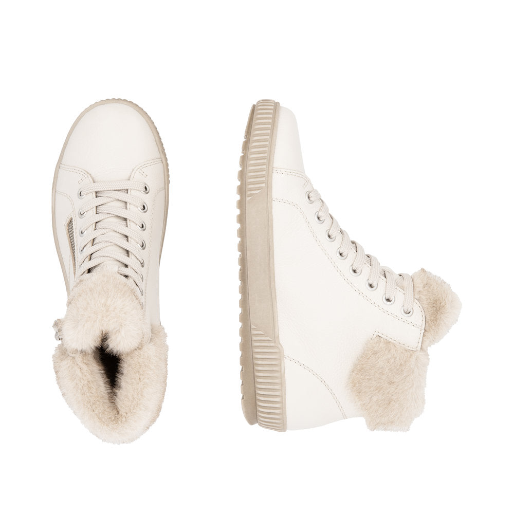 Remonte cream leather hi-top sneakers. With a Remonte-Tex membrane and warm fleecy lining your feet will stay warm and dry this winter. The neutral winter-white upper is easy to clean with a damp cloth and the darker sole unit wont show the dirt like a pure white sole.