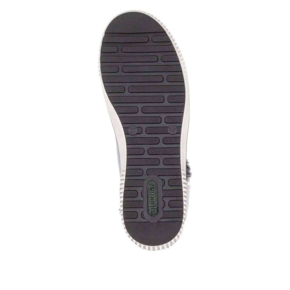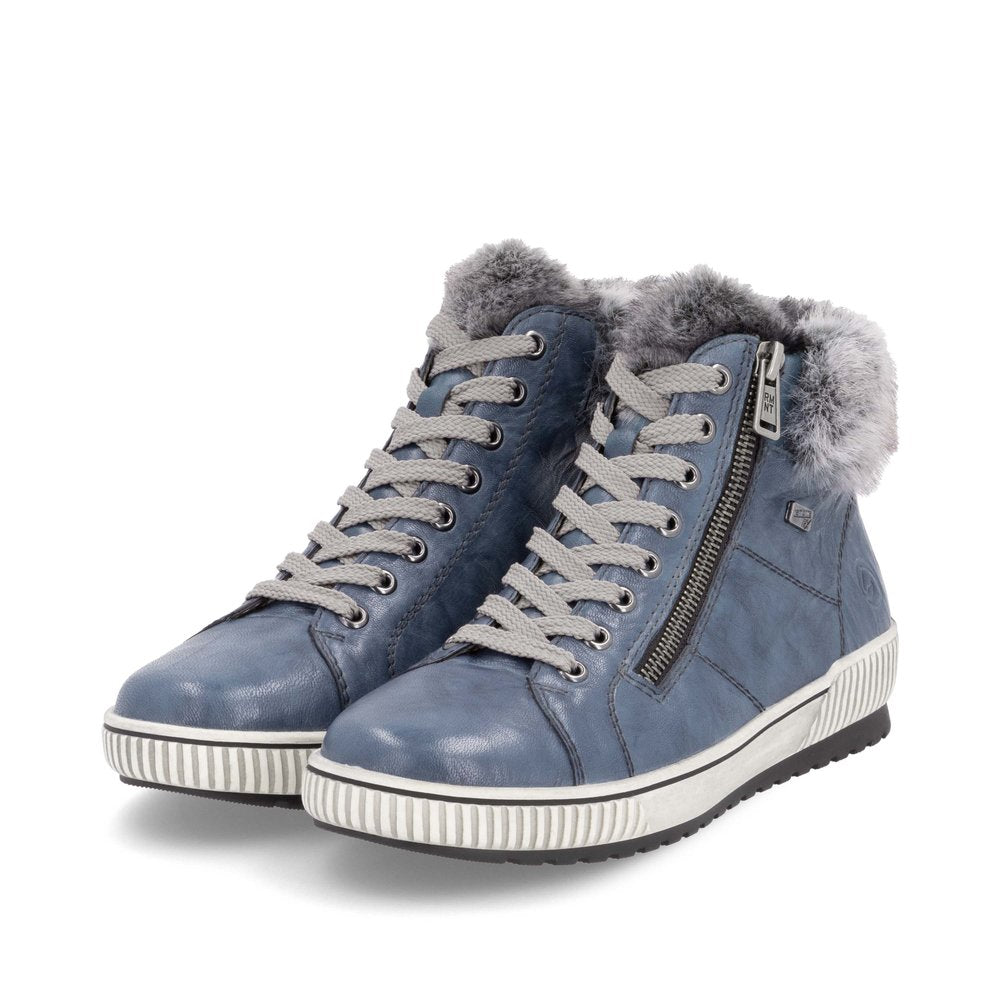 Remonte blue leather hi-top sneakers. With a Remonte-Tex membrane and warm fleecy lining your feet will stay warm and dry this winter. The neutral winter-white upper is easy to clean with a damp cloth and the darker sole unit wont show the dirt like a pure white sole.