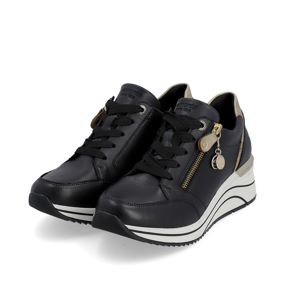 Remonte high wedge sneakers with laces and zip. Stand tall with these statement two tone low top sneakers with black and white sole and 2 inch wedge heel. Pair with skinny jeans or leggings for a smart casual look.