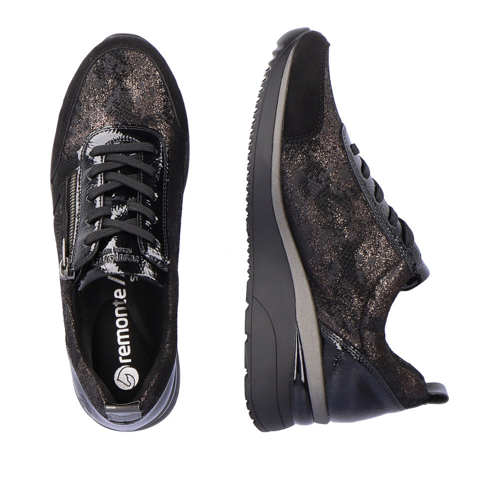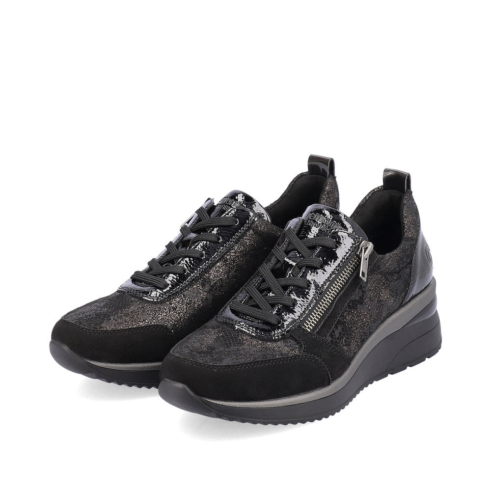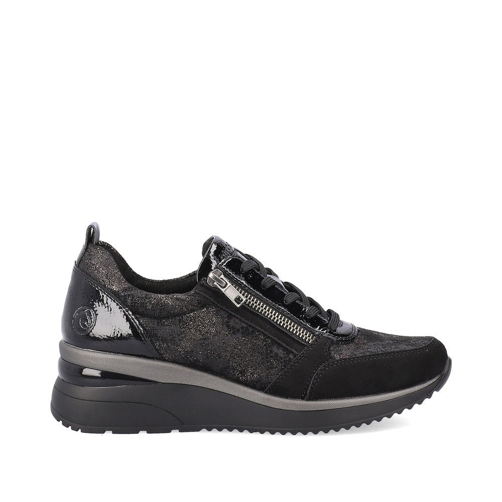 Remonte wedge heel sneakers with laces and zip. Stand a little taller with these dressy combination leather sneakers. The metallic suede and patent leather upper gives a subtle and smart look to a very comfortable shoeand the soft stretch upper gives lots of room for your toes.