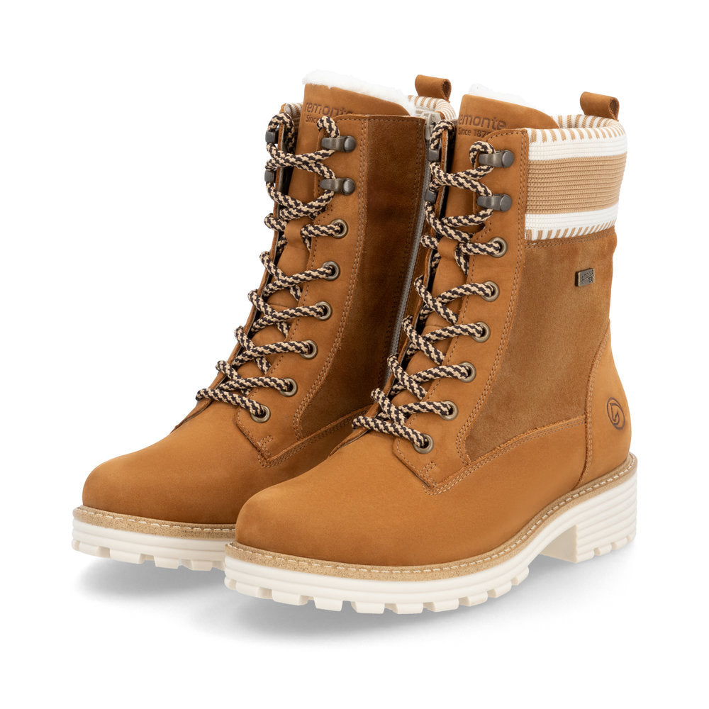 Lighter cognac tan midi boots with matching knit cuff for a perfect ankle fitting. These Nordic inspired boots can be laced for a supportive fit and then zipped on and off when coming in from the cold. The warm lining keeps your feet at a comfortable climate and the honey ochre tan looks great with blue jeggings.