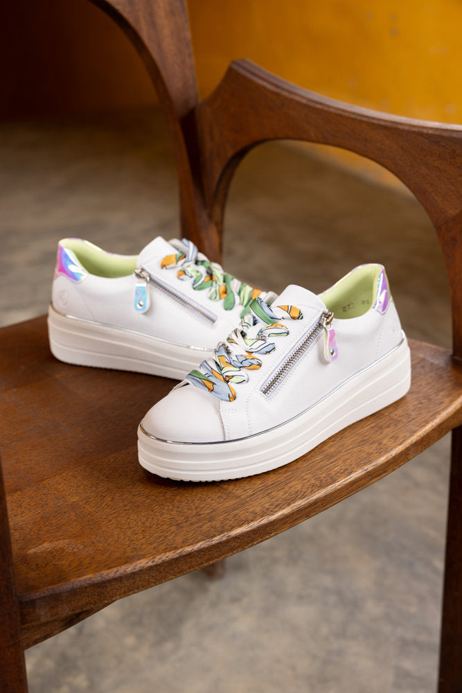 Add a little chic comfort to an outfit with these beautiful scarf lace sneakers. Made from a soft off white leather and toning soft colours this wedge mini platform can be paired with anything. This model has laser effect heel and zip detailing and is a featured model in Elle magazine. An impressive new style for this summer season.