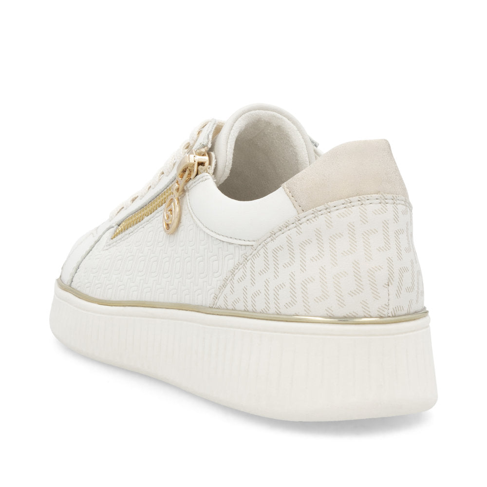 Remonte chic off white leather sneakers with mini platform soles offering a little height boost. The embossed leather sides and cream/gold trim gives these sneakers a more luxurious designer feel. Pair with summer dresses or casual clothes for a smart and versatile look.