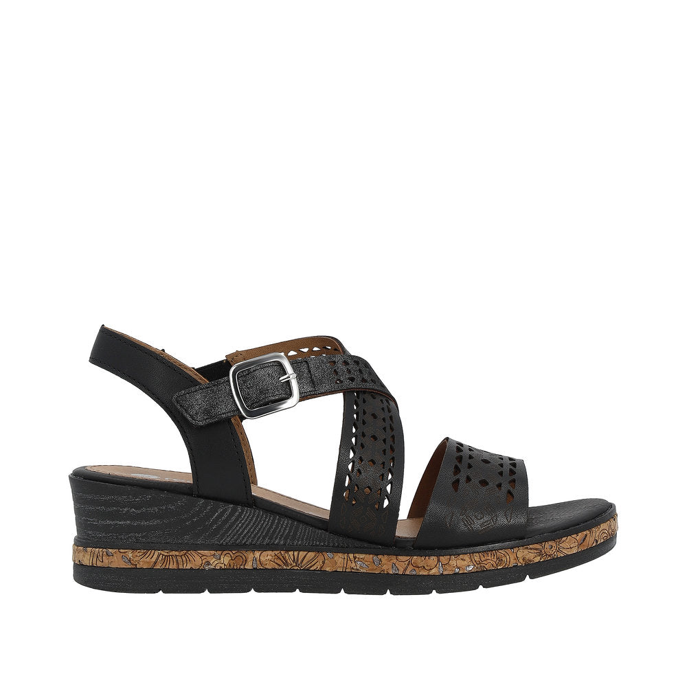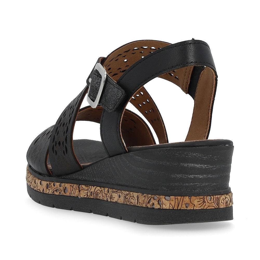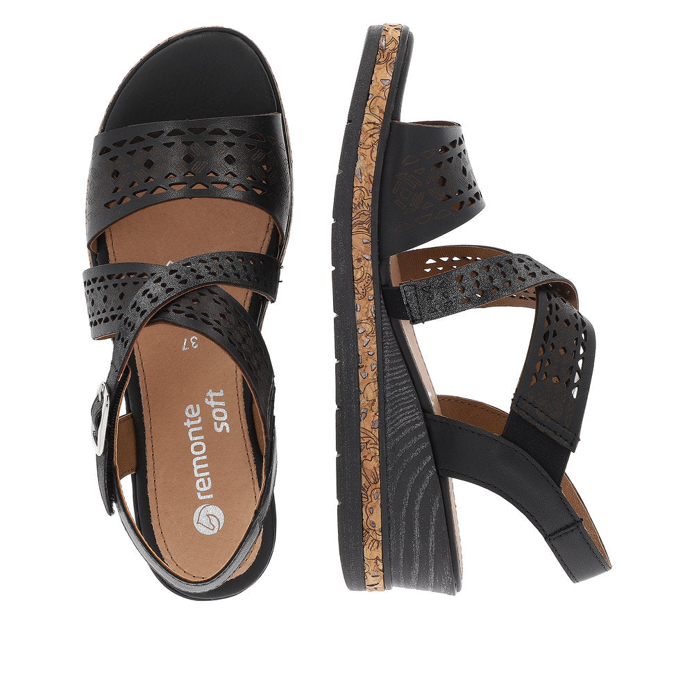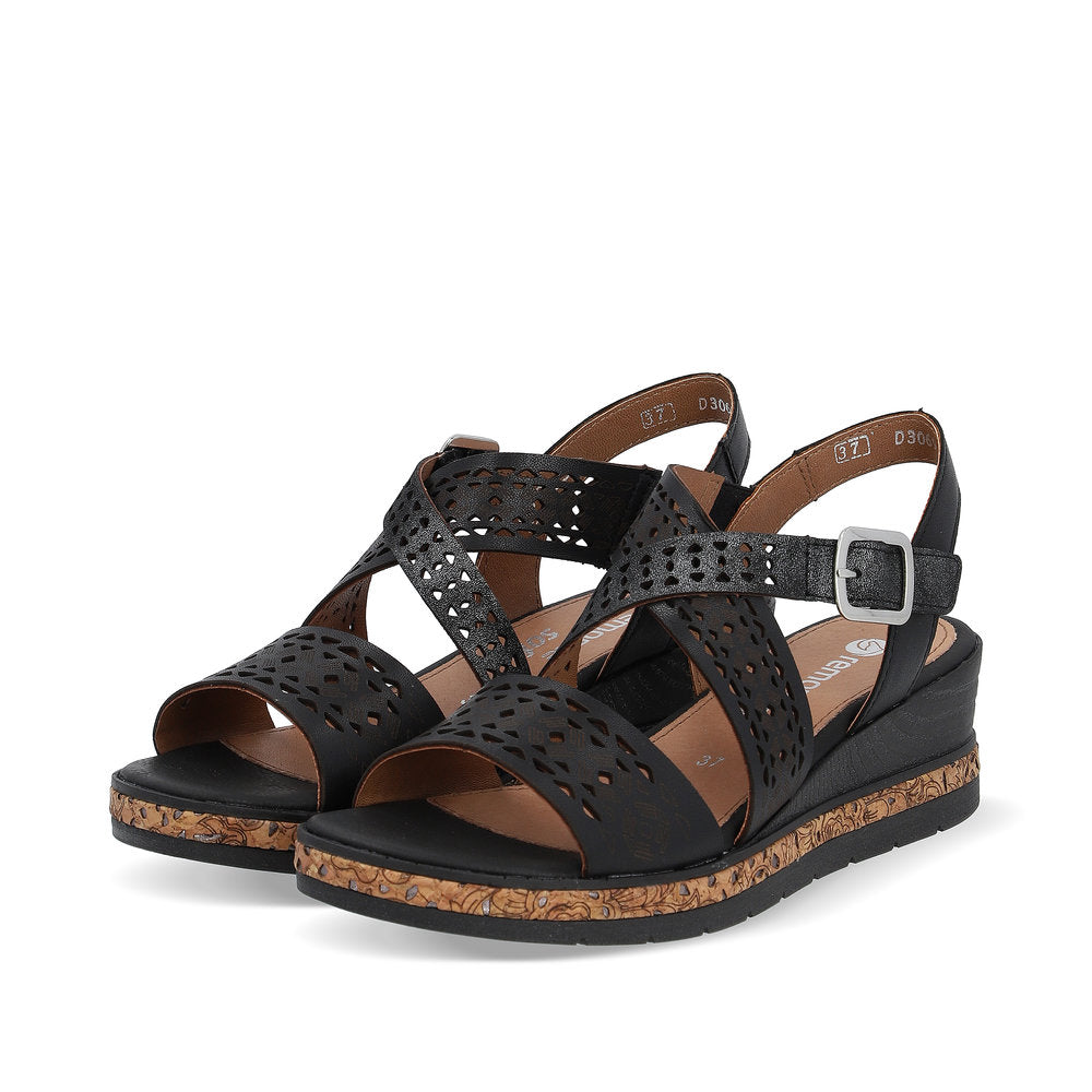These Remonte D3069 dressy sandals provide a sophisticated look with their black leather laser cut out finish. With a comfortable dual textured wedge heel, leather lining, and footbed, these shoes provide superior support for all-day wear.