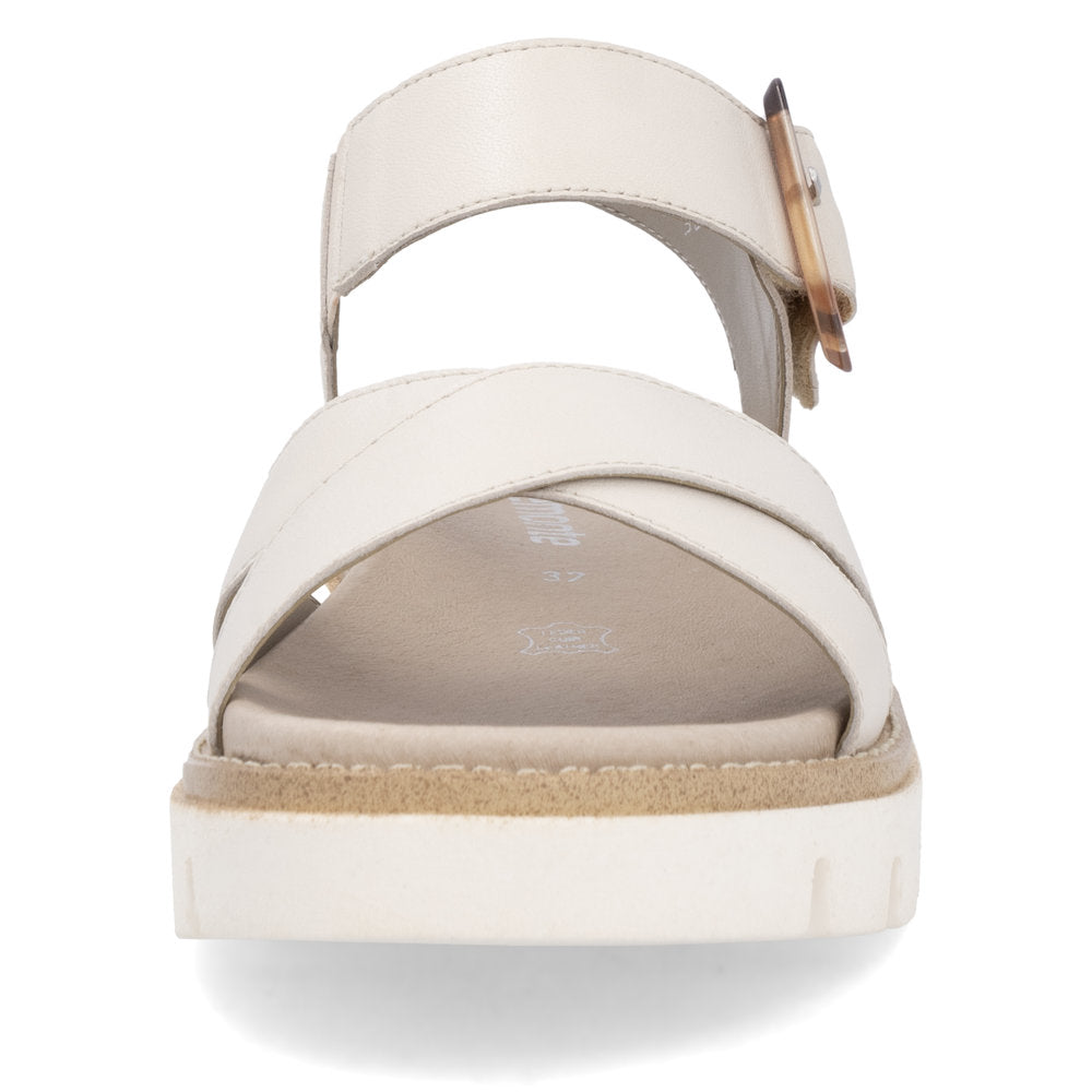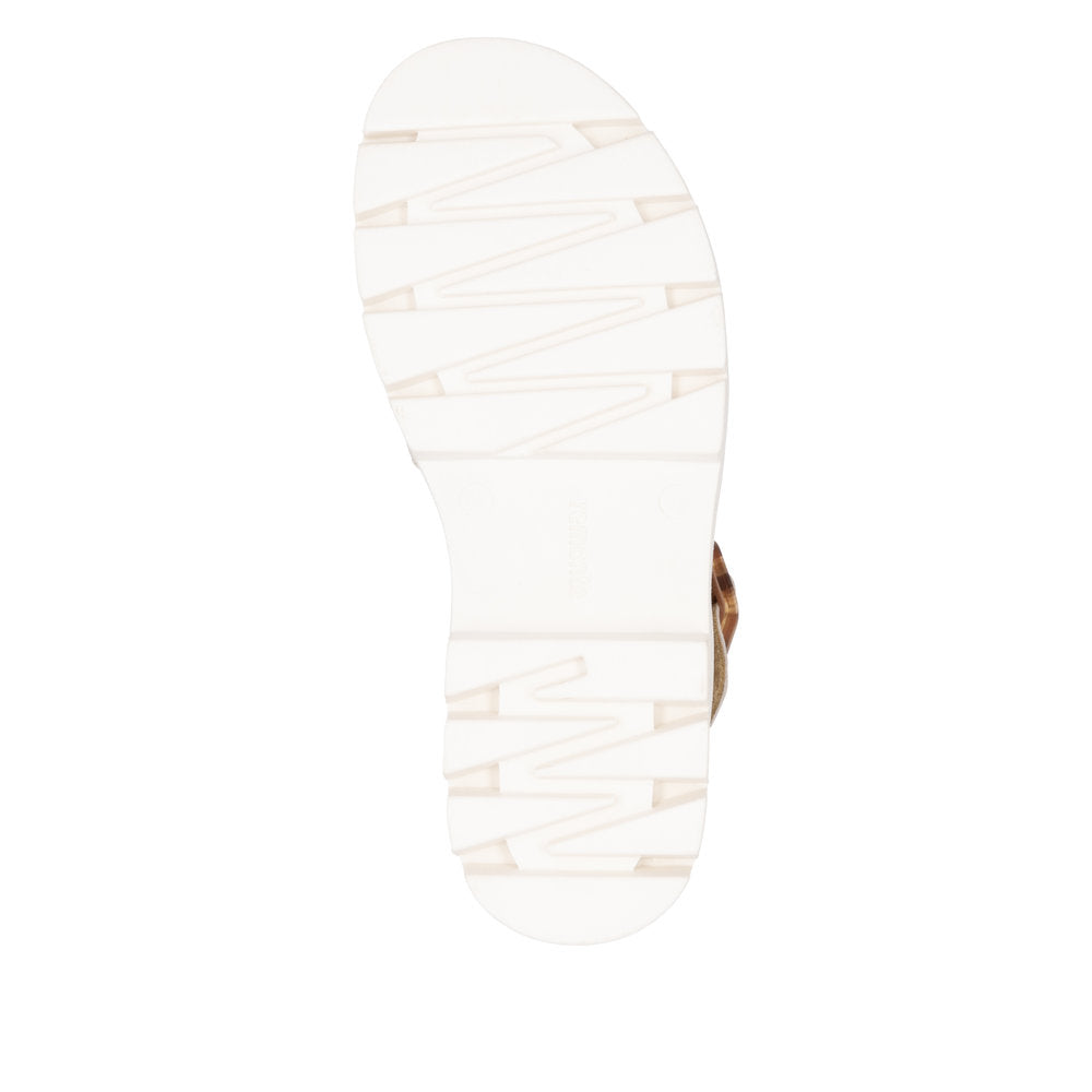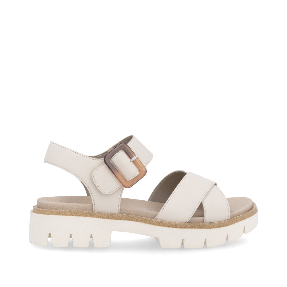 Remonte cream leather walking sandals with chunky platform soles. These soft leather sandals have a criss-cross front and rip-tape adjustable fastening disguised as a buckle.