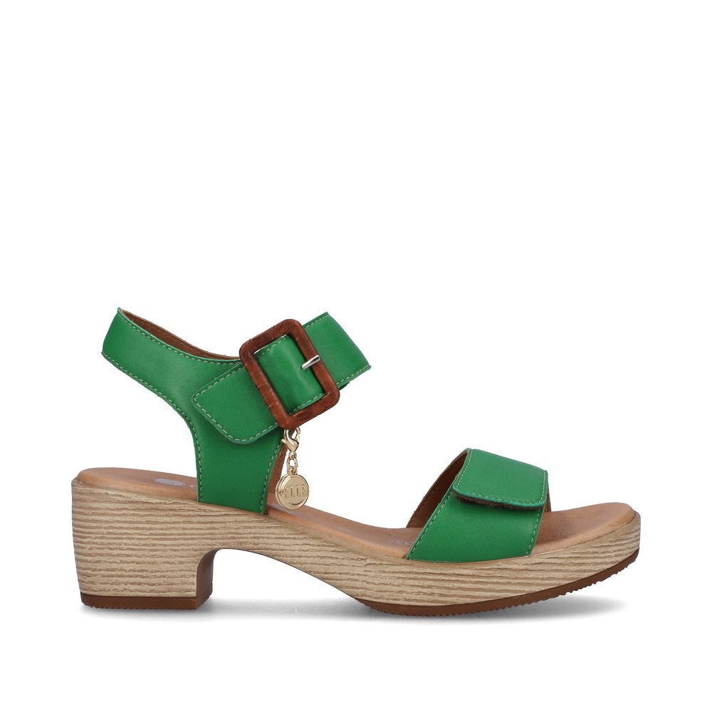 Remonte Emerald green leather fashion sandals with a heel and platform soles. These soft leather statement sandals have a hook and loop adjustable fastening disguised as a buckle. The toe strap also has an adjustable fastening to get that perfect fit. Fashion with comfort and a welcome extra 20 mms of height.