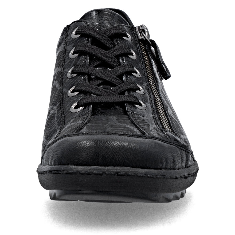 Remonte black sneakers with Rieker-Tex water resistant membrane. These lightweight and cleated rubber sole for sure grip and a slightly wider toe shape and standard heel fitting for a little extra toe room