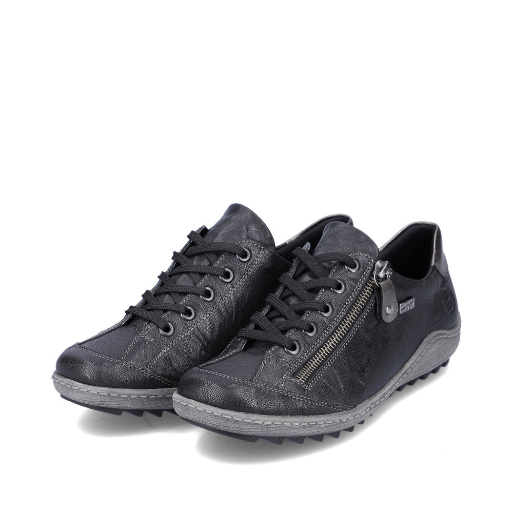 Remonte black leather sneakers with Rieker-Tex water resistant membrane. These lightweight and neat looking winter shoes have a slightly wider toe shape and standard heel fitting for a little extra toe room