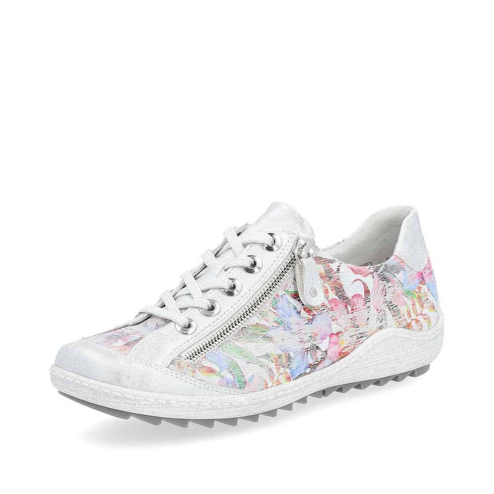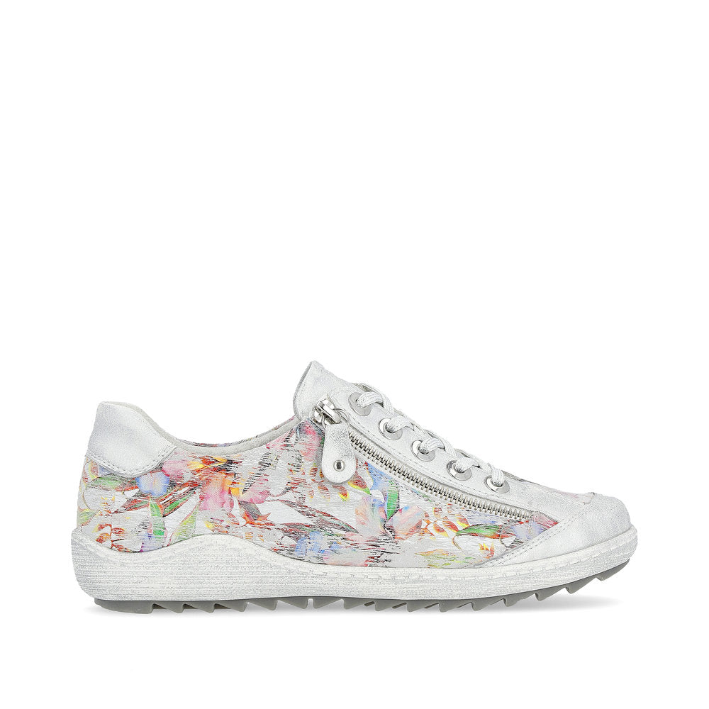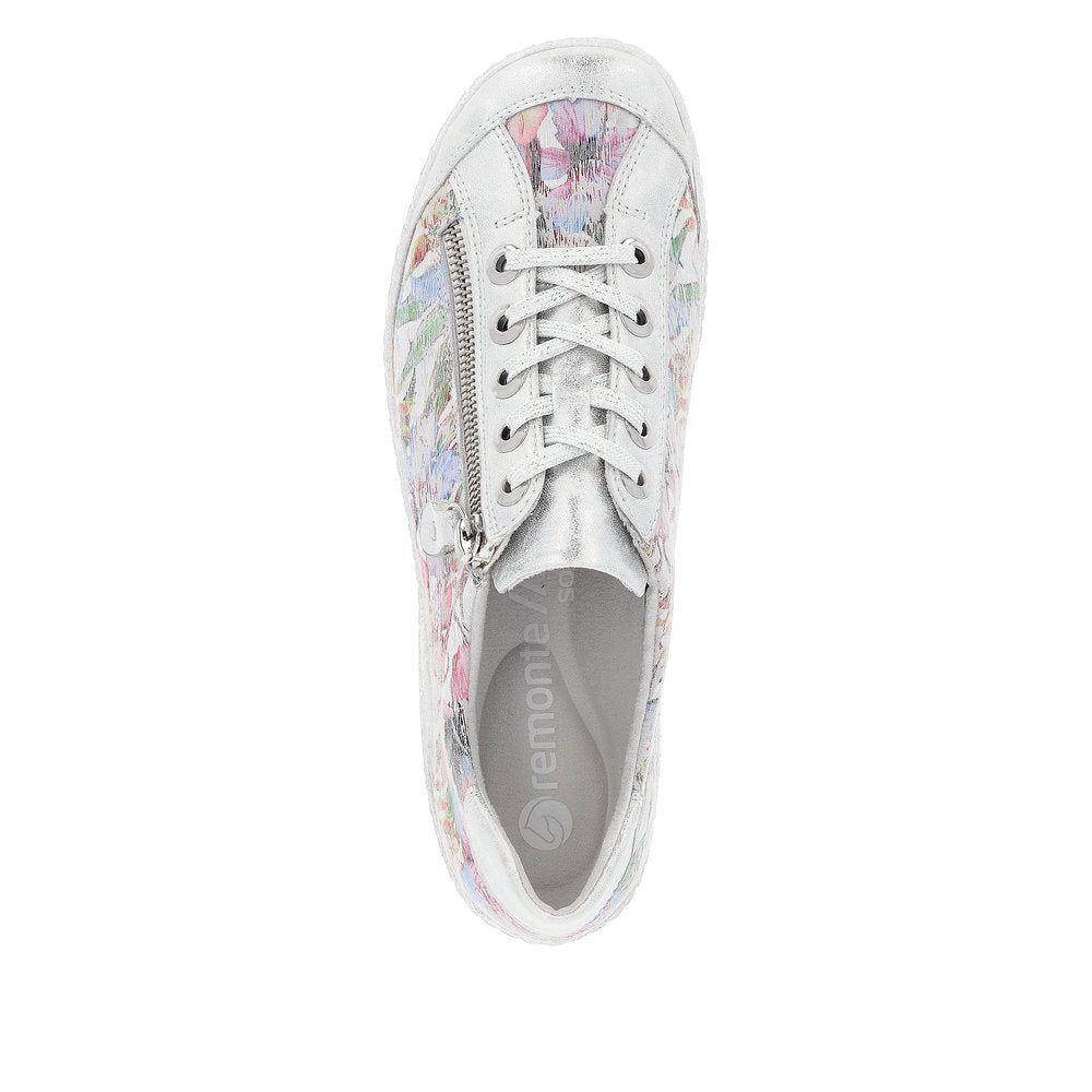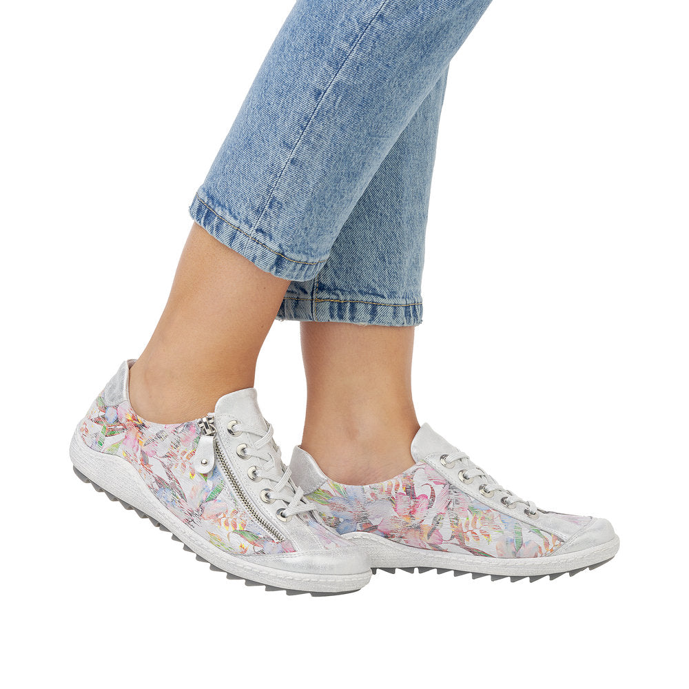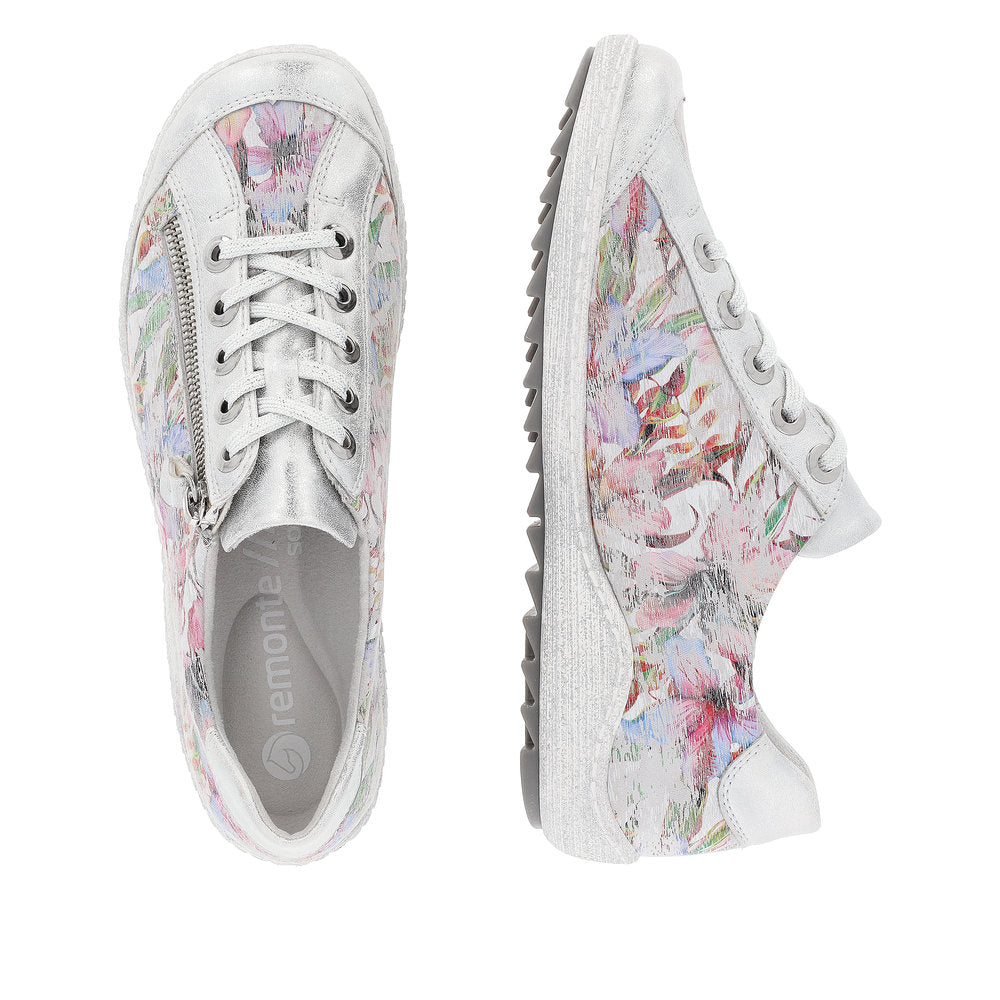 Remonte R1402 silver and multi flower printed leather lace up summer shoes. These pretty summer sneakers feature a soft cushioned footbed for maximum bounce and the cleated sole means they double up as great walking shoes.