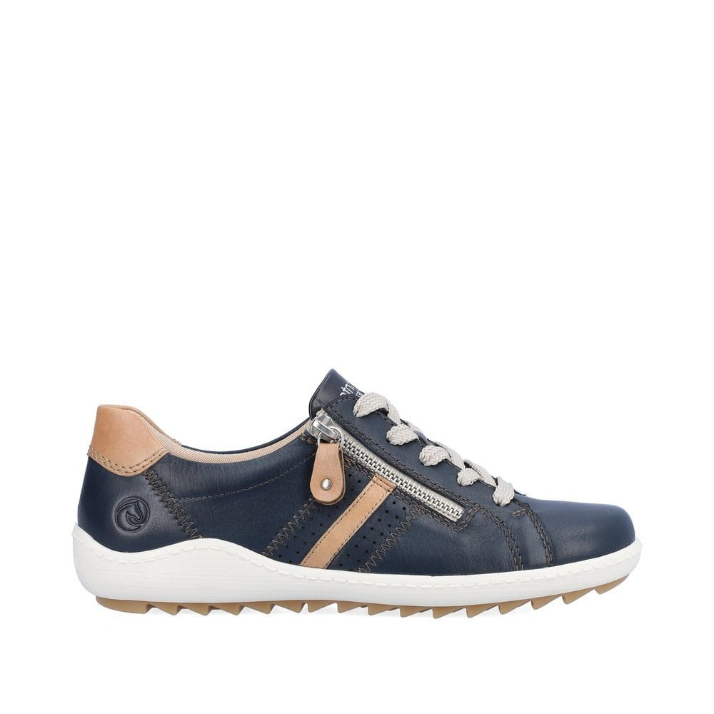 Remonte navy blue leather lace up shoes with a square toe shape. These smart sneakers feature a soft cushioned footbed for maximum bounce and the cleated sole means they double up as great walking shoes. Lace and zip fastening allows finer adjustment.