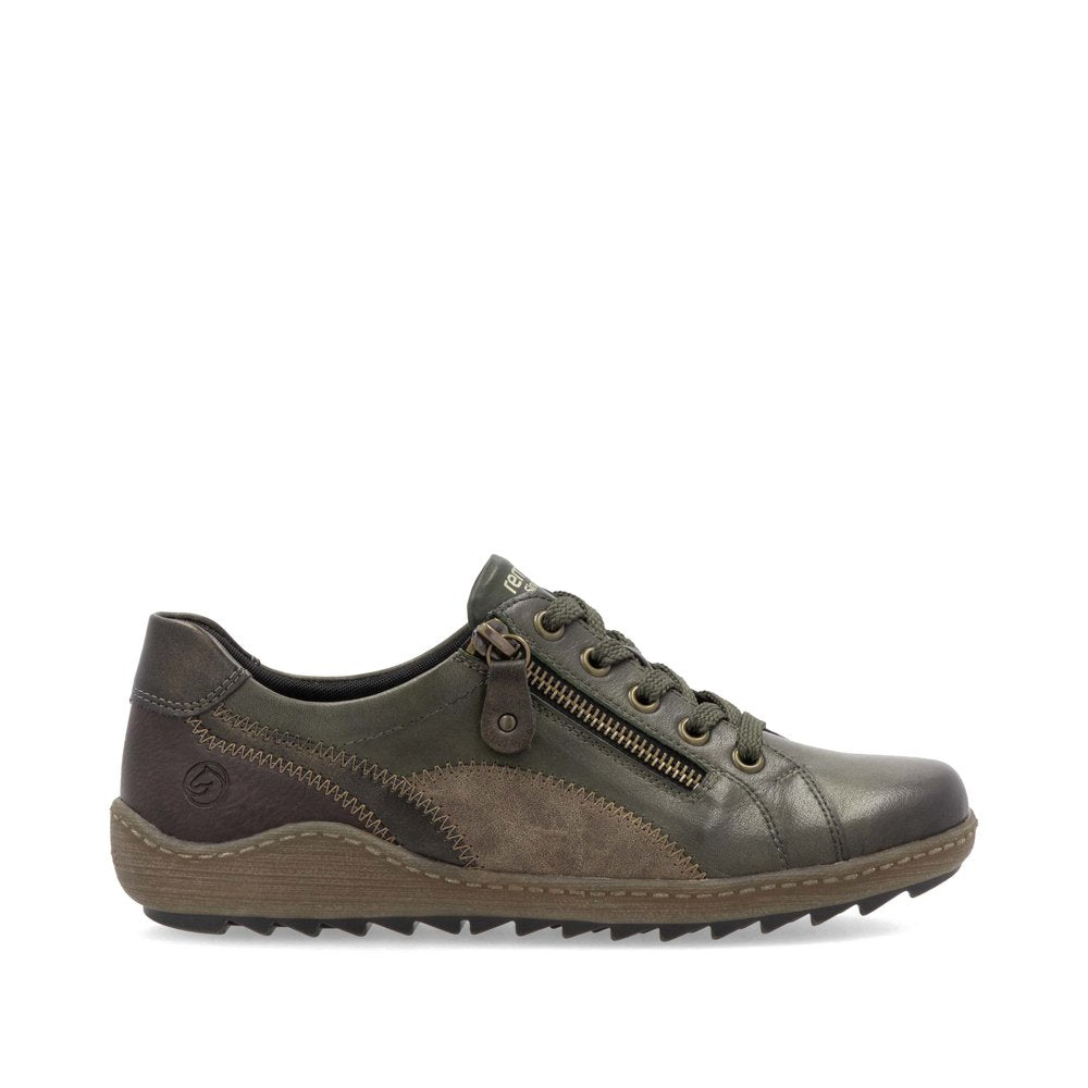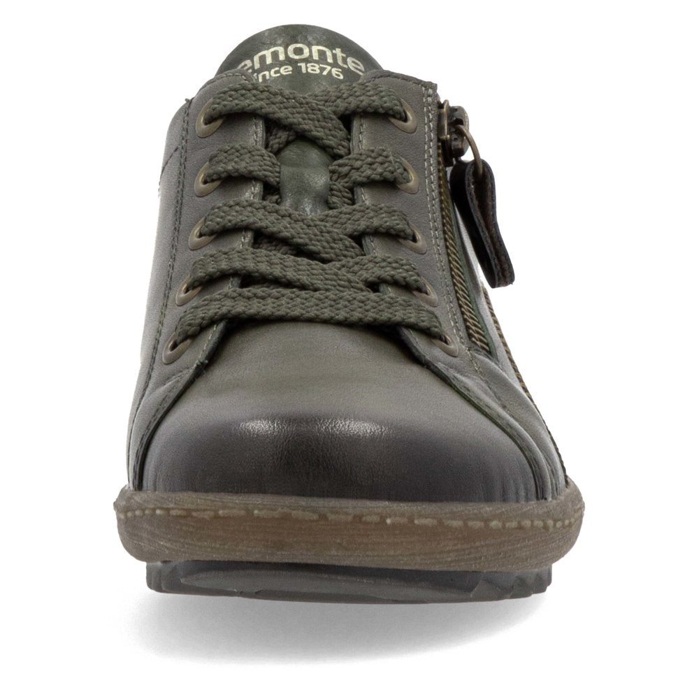 Remonte earthy forest green and brown leather lace up shoes with a square toe shape. These smart sneakers feature a soft cushioned footbed for maximum bounce and the cleated sole means they double up as great walking shoes. Lace and zip fastening allows finer adjustment.