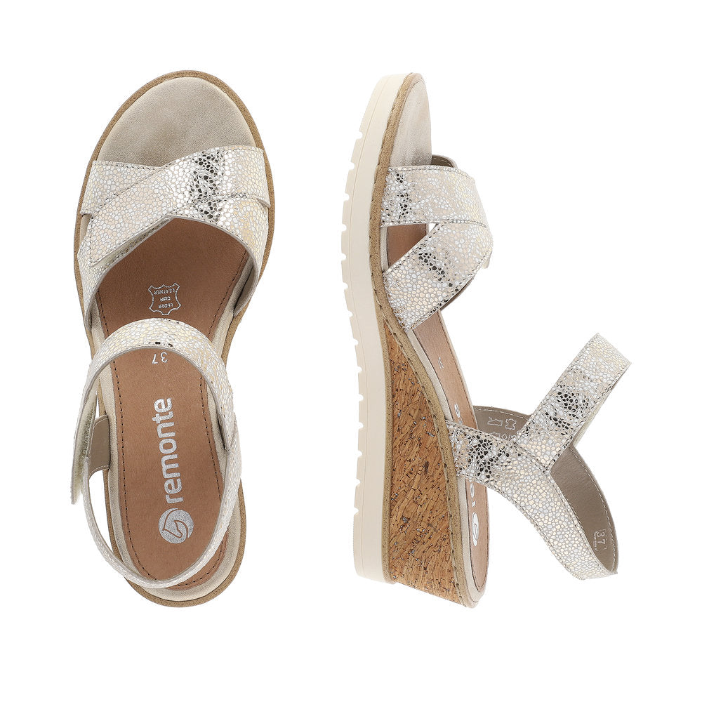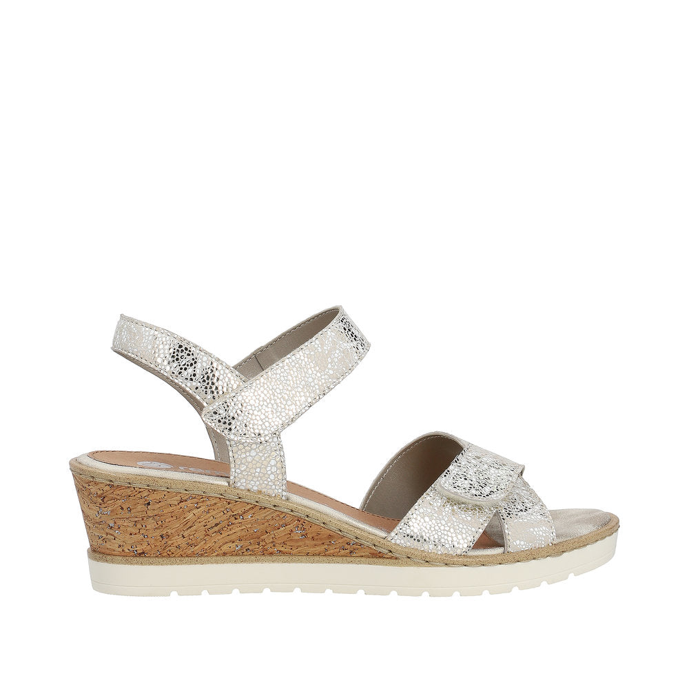 Remonte pale gold crackle effect soft leather summer sandals with cushioned footbed. The instep strap is a simple hook and loop which can be adjusted to suit your ankle. These are more than just a sandal, they look dressy and glamourous and could go from a walk to an evening out. The leather insole has a colour coordinated toe piece and the front strap is also adjustable.