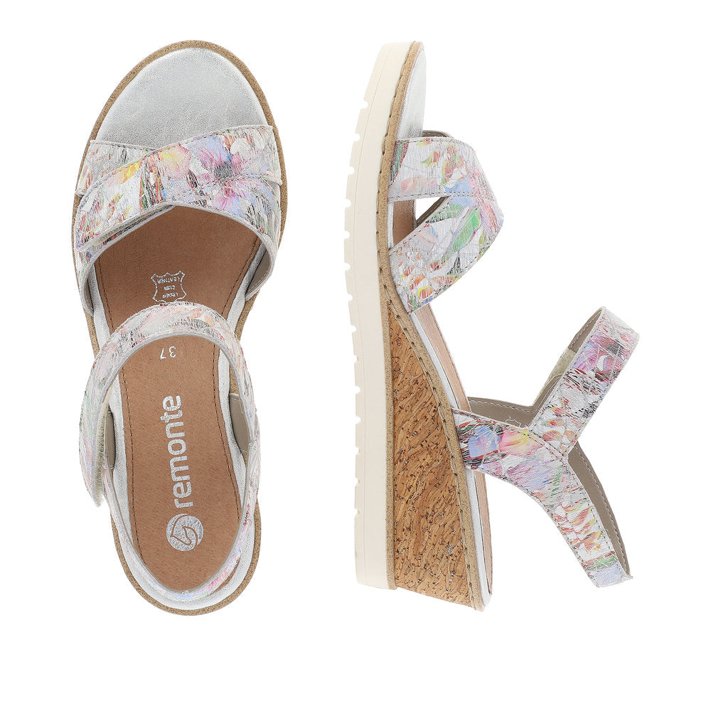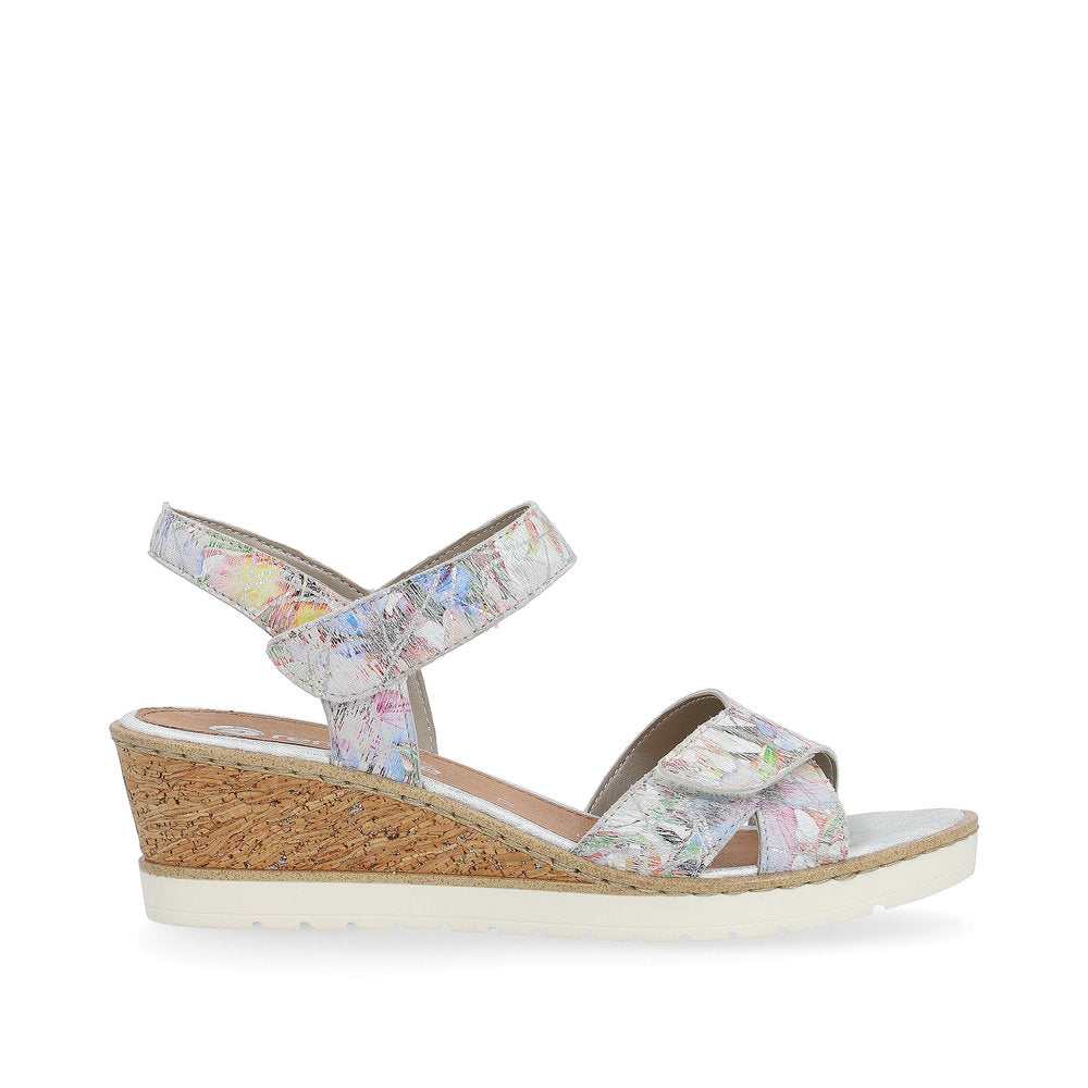 Remonte silvery multi colour flower effect soft leather summer sandals with cushioned foot bed. The instep strap is a simple hook and loop which can be adjusted to suit your ankle. These are more than just a sandal, they look dressy and glamorous and could go from an afternoon walk to an evening out. The leather insole has a colour coordinated toe piece and the front strap is also adjustable.