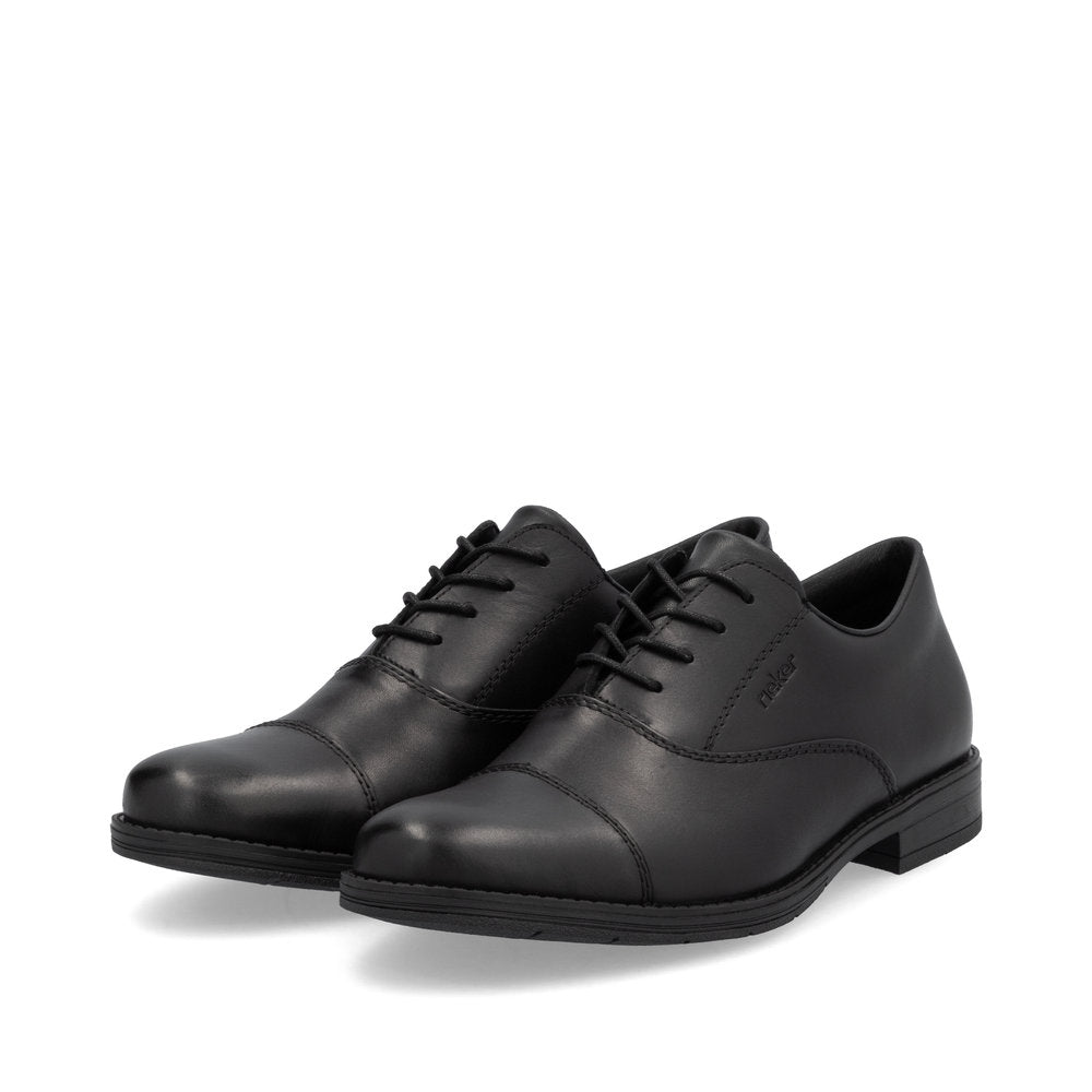 Rieker men's smart leather shoes. Combining a formal toe cap with a soft insole that provides comfort throughout the day, these black lace shoes offer great flexibility and can be paired either with a formal suit or smart trousers and a shirt.