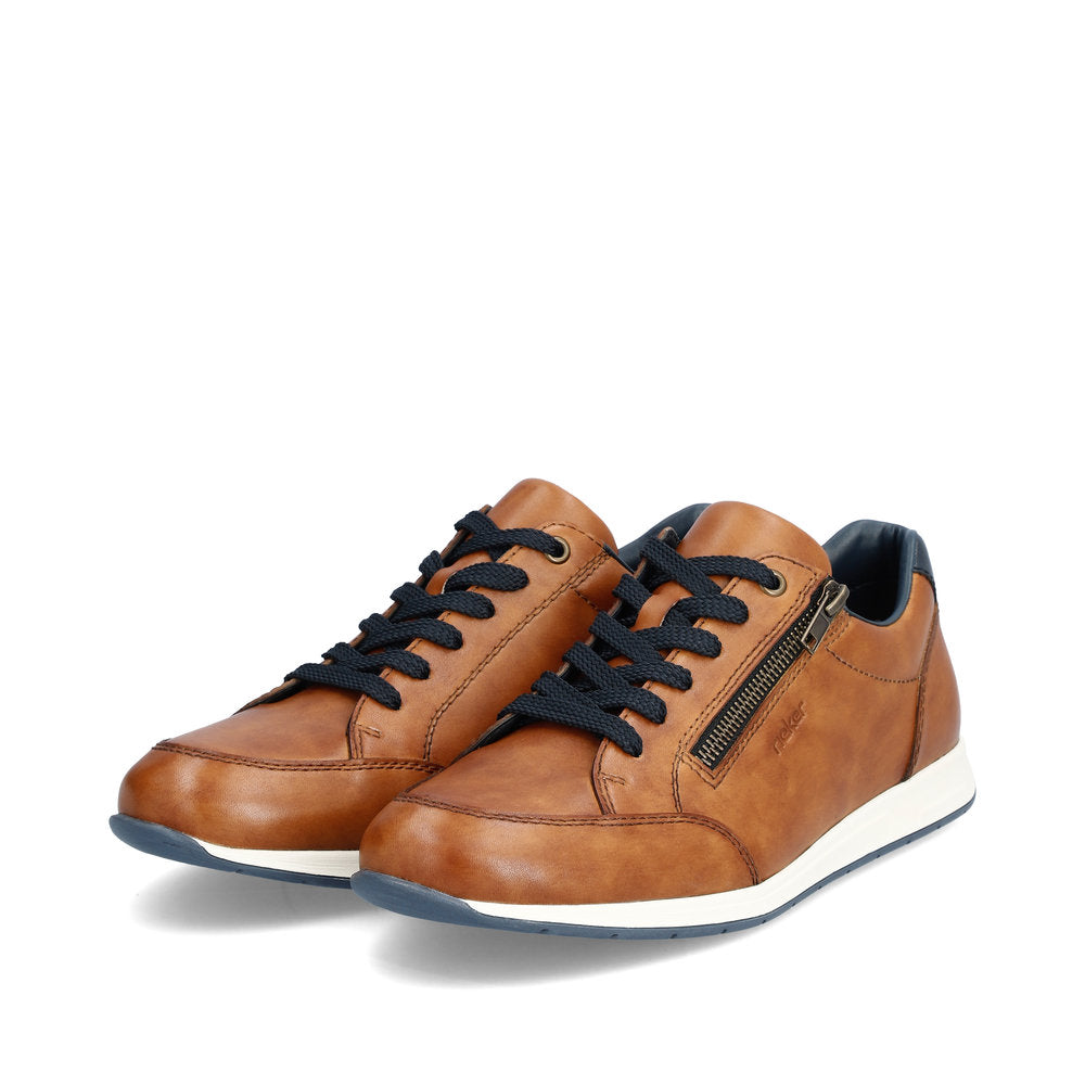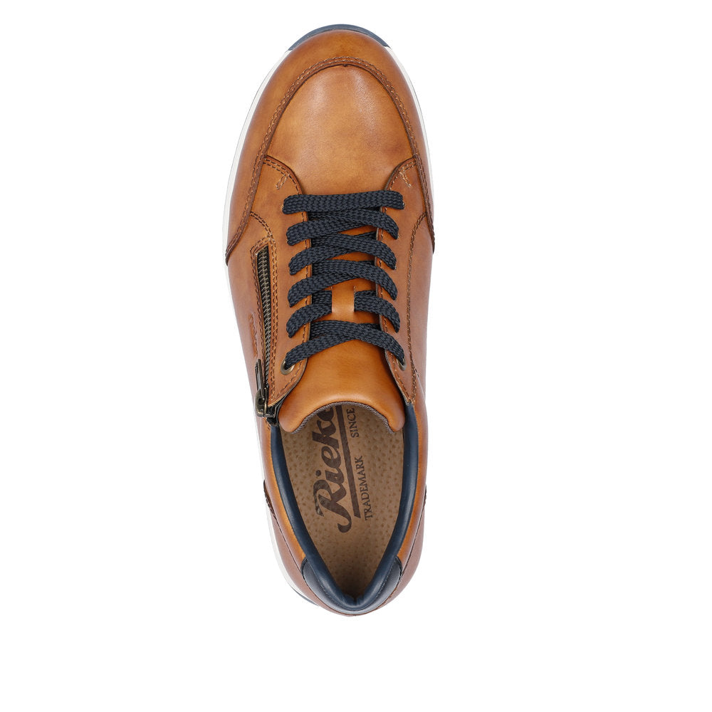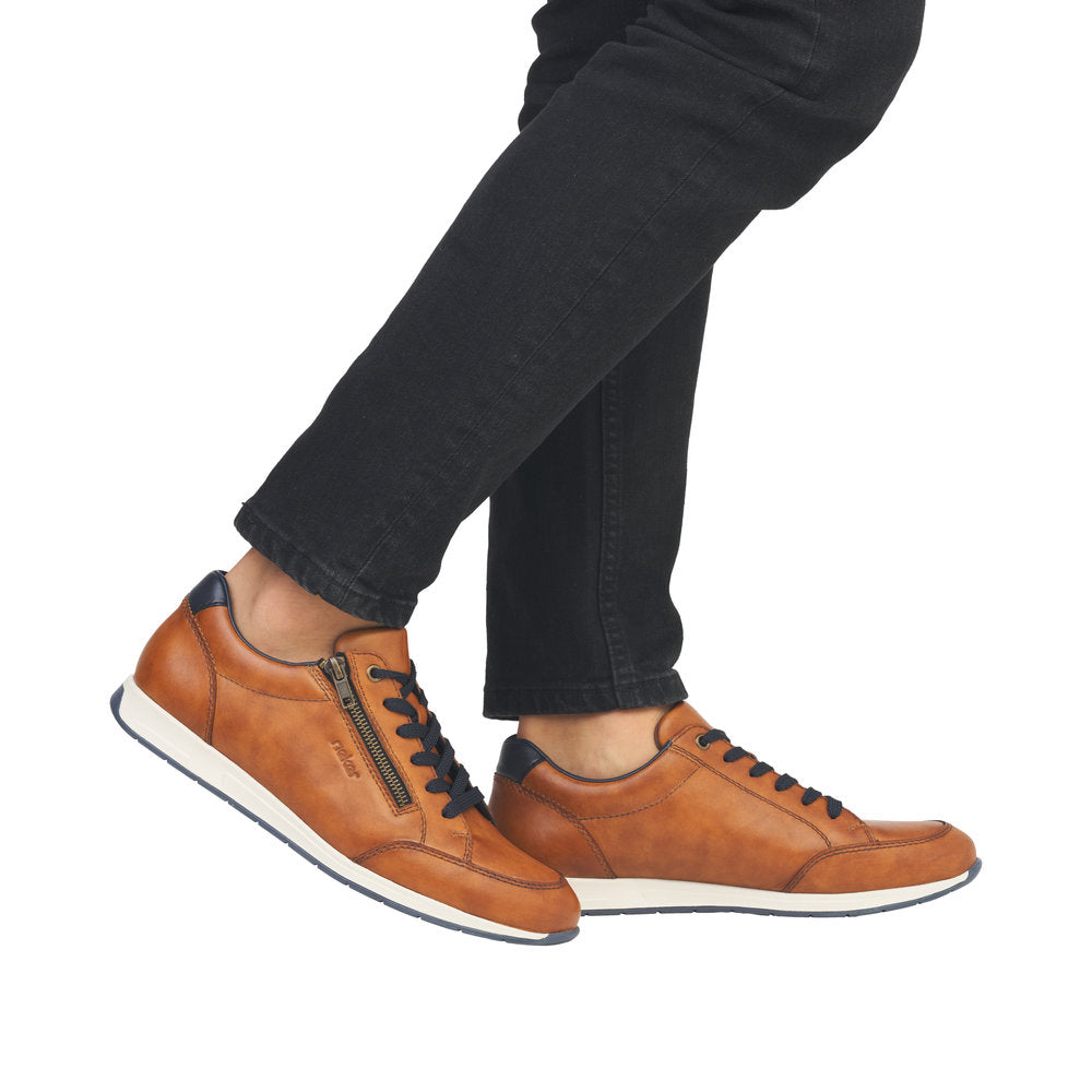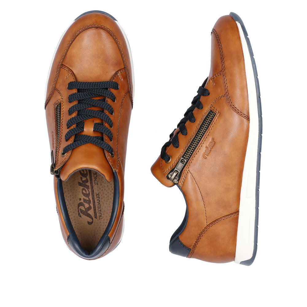 Rieker men's leather trainer style casual shoes for this summer. These lightweight leather shoes are soft and breathable . The gently padded leather insole adds a little bit of cushioning underfoot. This model has navy heel cuff and lining and lacing which is complimented with an easy action zip.