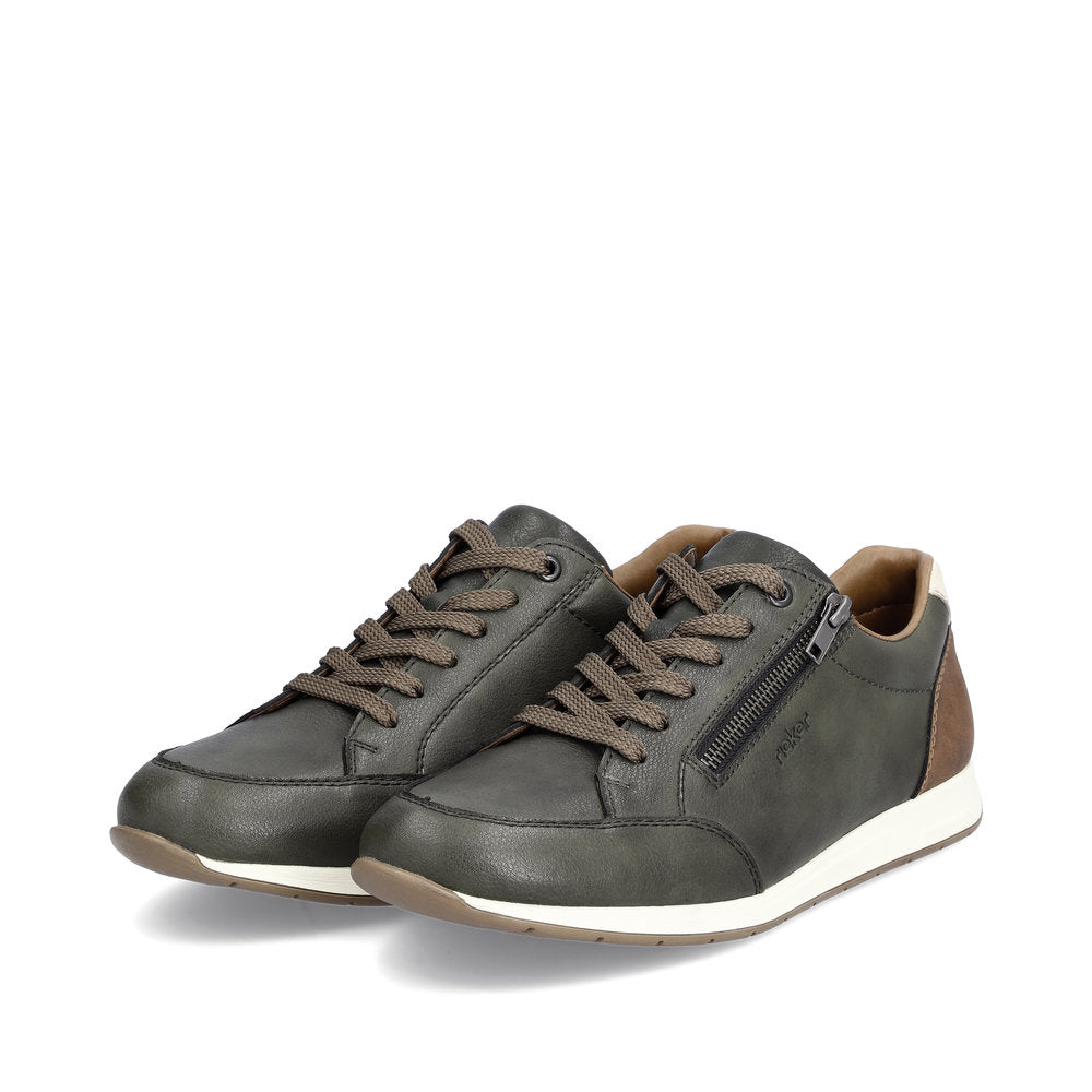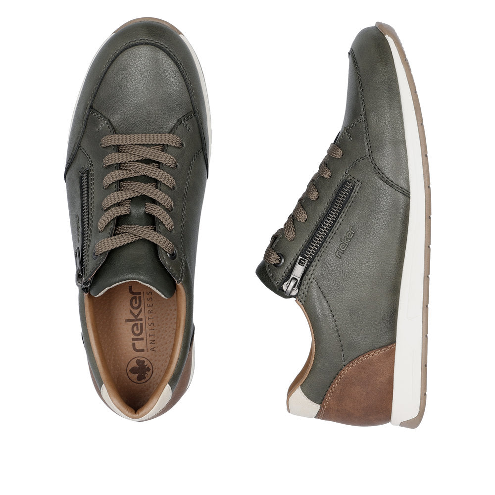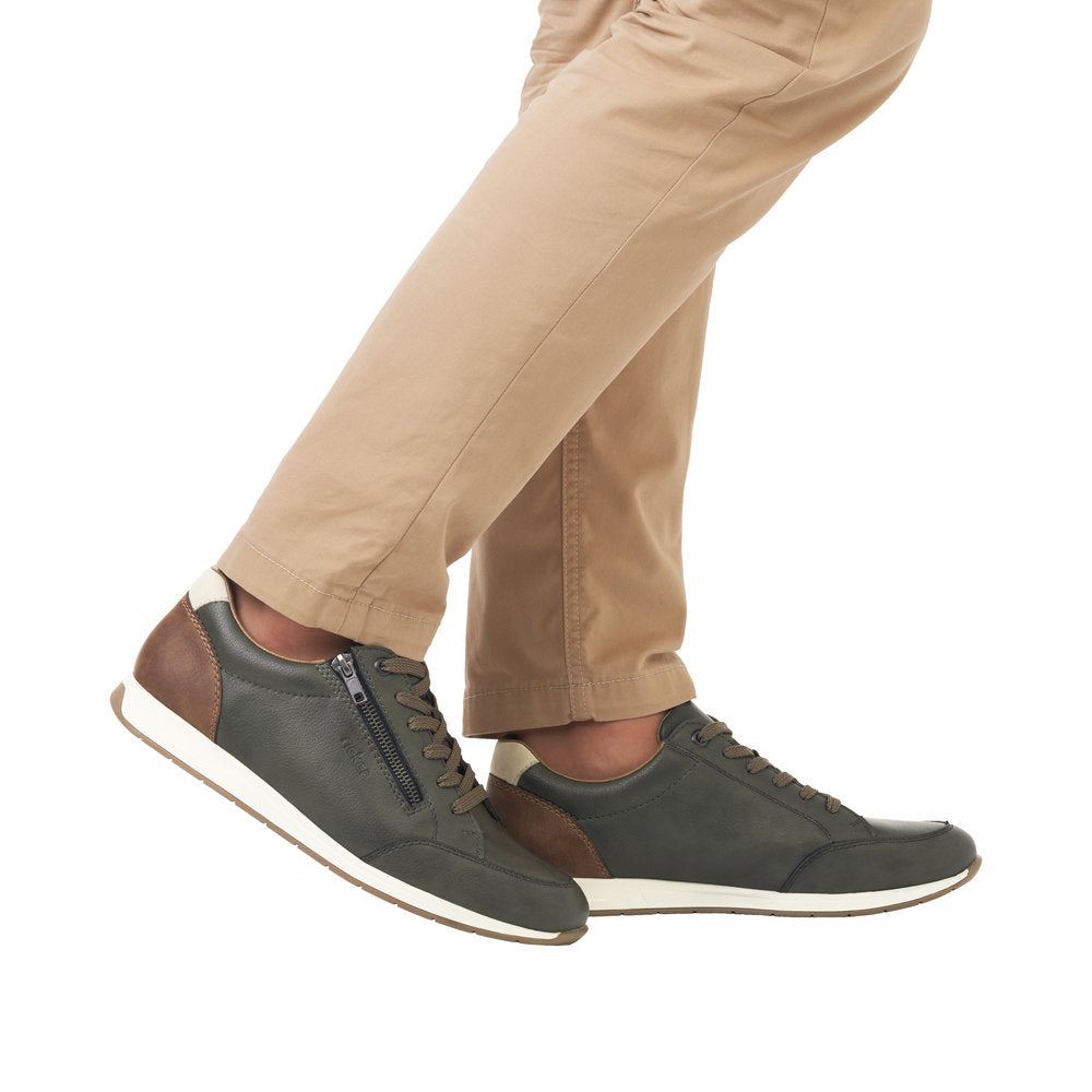 Rieker men's leather trainer style casual shoes for this summer. These lightweight leather shoes are soft and breathable . The gently padded leather insole adds a little bit of cushioning underfoot. This model has tan and beige heel cuff, tan lining and lacing to match the upper which is complimented with an easy action zip.
