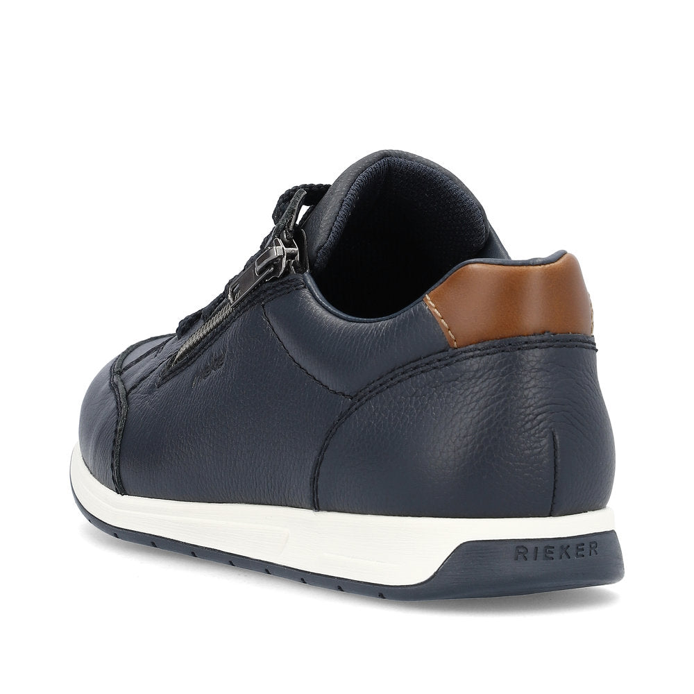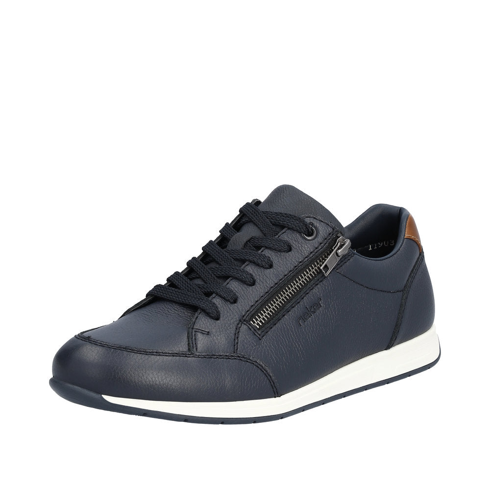 Rieker men's leather trainer style casual shoes for this summer. These lightweight leather shoes are soft and breathable . The gently padded leather insole adds a little bit of cushioning underfoot. This model has a tan trim to the heel cuff , the lining and lacing are colour co-ordinated, complimented with an easy action zip.