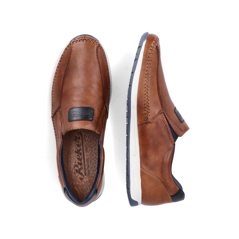 Rieker men's soft leather slip on casual shoes for this summer. These lightweight leather shoes are soft and breathable . The gently padded leather insole adds a little bit of cushioning underfoot. This model has a contrast stitched moccasin style front which allows a good depth for your toes.