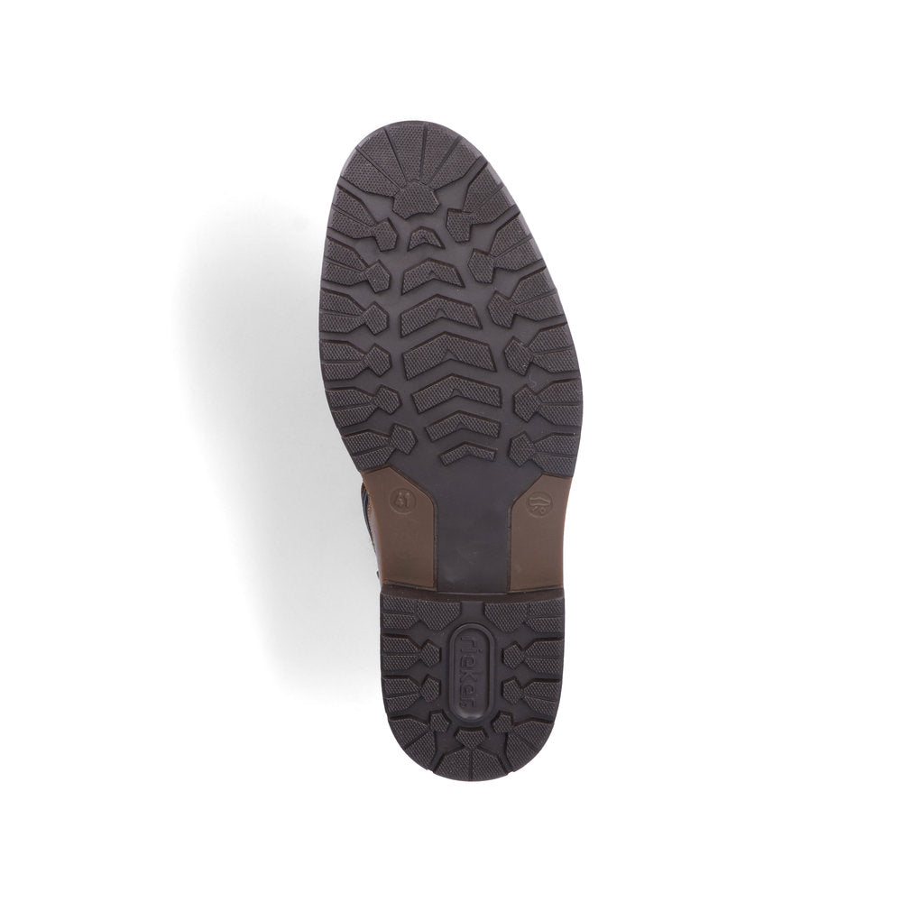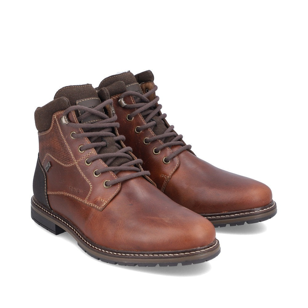 Rieker 13740 men's ankle boots feature a smooth leather upper in a trendy brown colour complemented by contrasting elements at the heel. Lined with lambs wool, this boot has a Tex membrane which offers waterproofing and breathability. This warm and comfy boot is the perfect addition to any man's winter wardrobe.  The lace and zip fastening will ensure that this versatile boot fits like a glove.