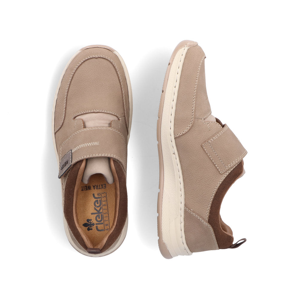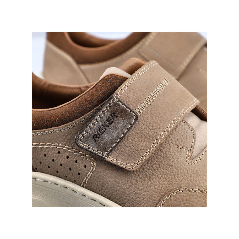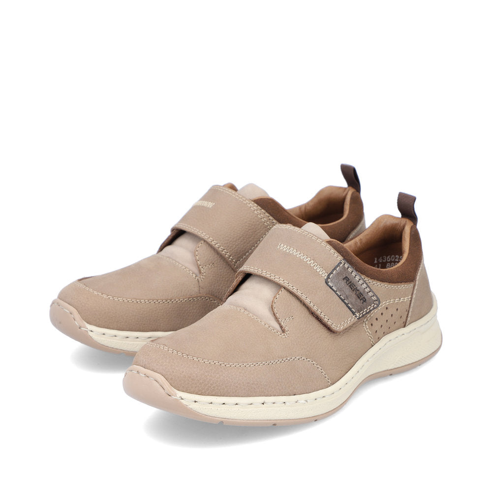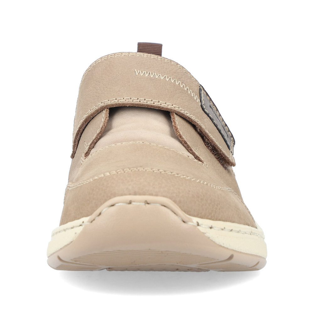 Rieker 14360 light grey/brown summer casual shows with a single hook and loop strap. These soft leather men's casuals are easy to put on and take off and feature a leather linings and soft cushioned footbed.
