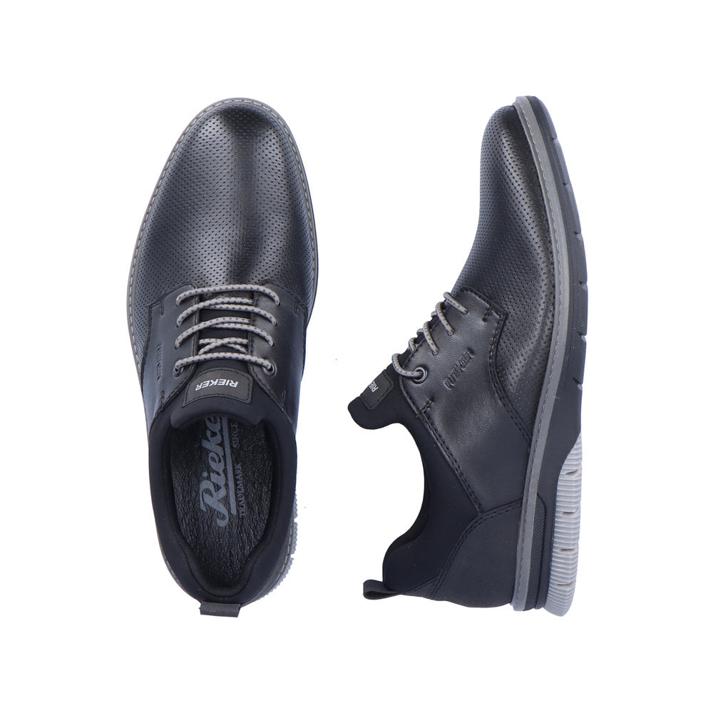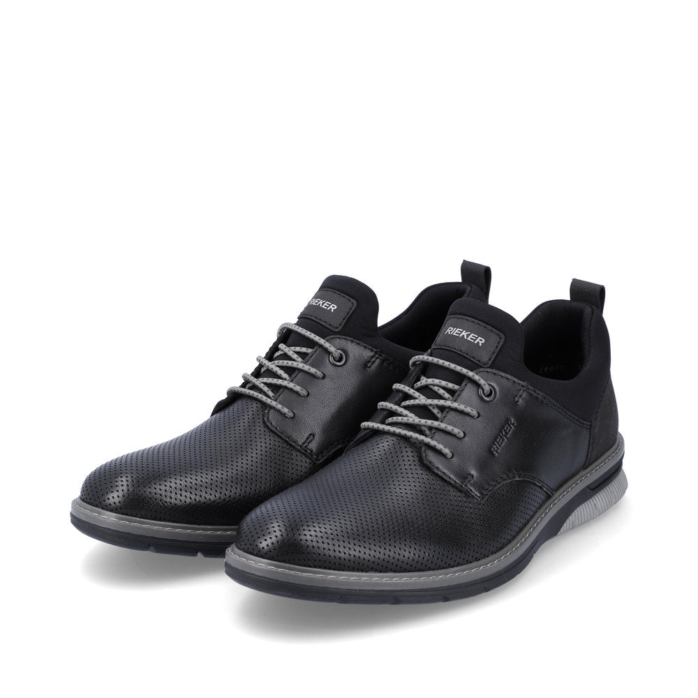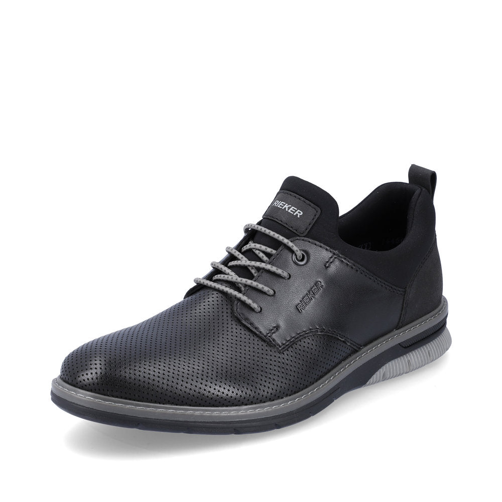 Rieker men's smart perforated leather shoes. Combining a formal look with a comfy trainer like styling, This shoe has a stretchy neoprene like soft lining that wraps around the top part of the foot. This stretchy material allows you to wear these comfortably, with or without socks. These are versatile leather shoes which can be worn with a smart pair of jeans or more formal trousers alike.