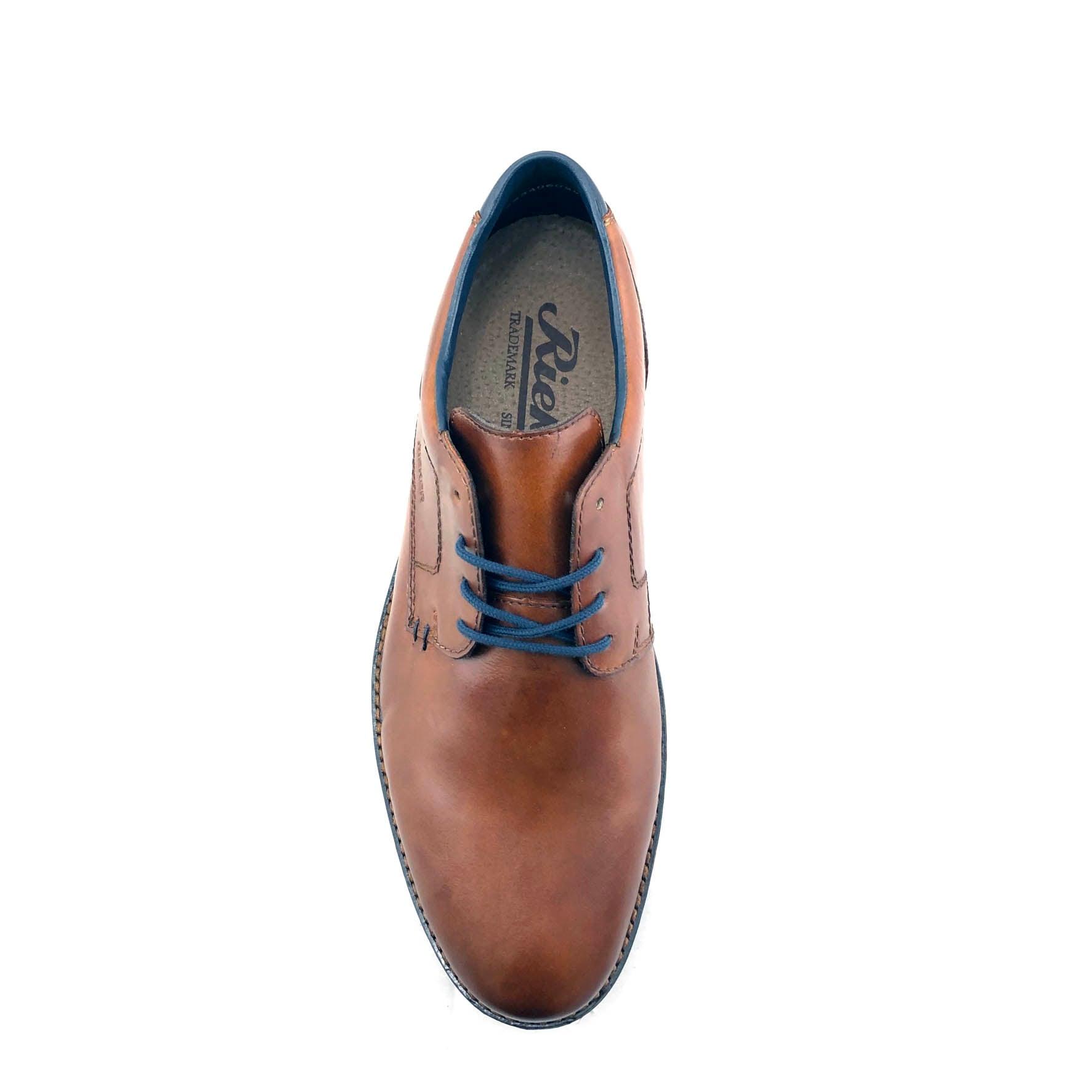 Rieker 14602 tan leather semi formal shoes with contrasting navy blue stitching and natural coloured welts.