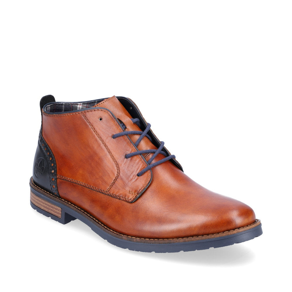Rieker classic tan leather chukka boots. These smart casual lace up boots look great with smart denim jeans. With a traditional block heel and grippy rubber sole these are practical and comfortable smart winter footwear.