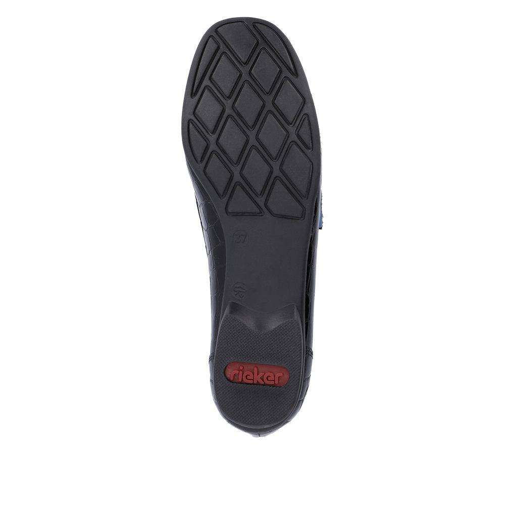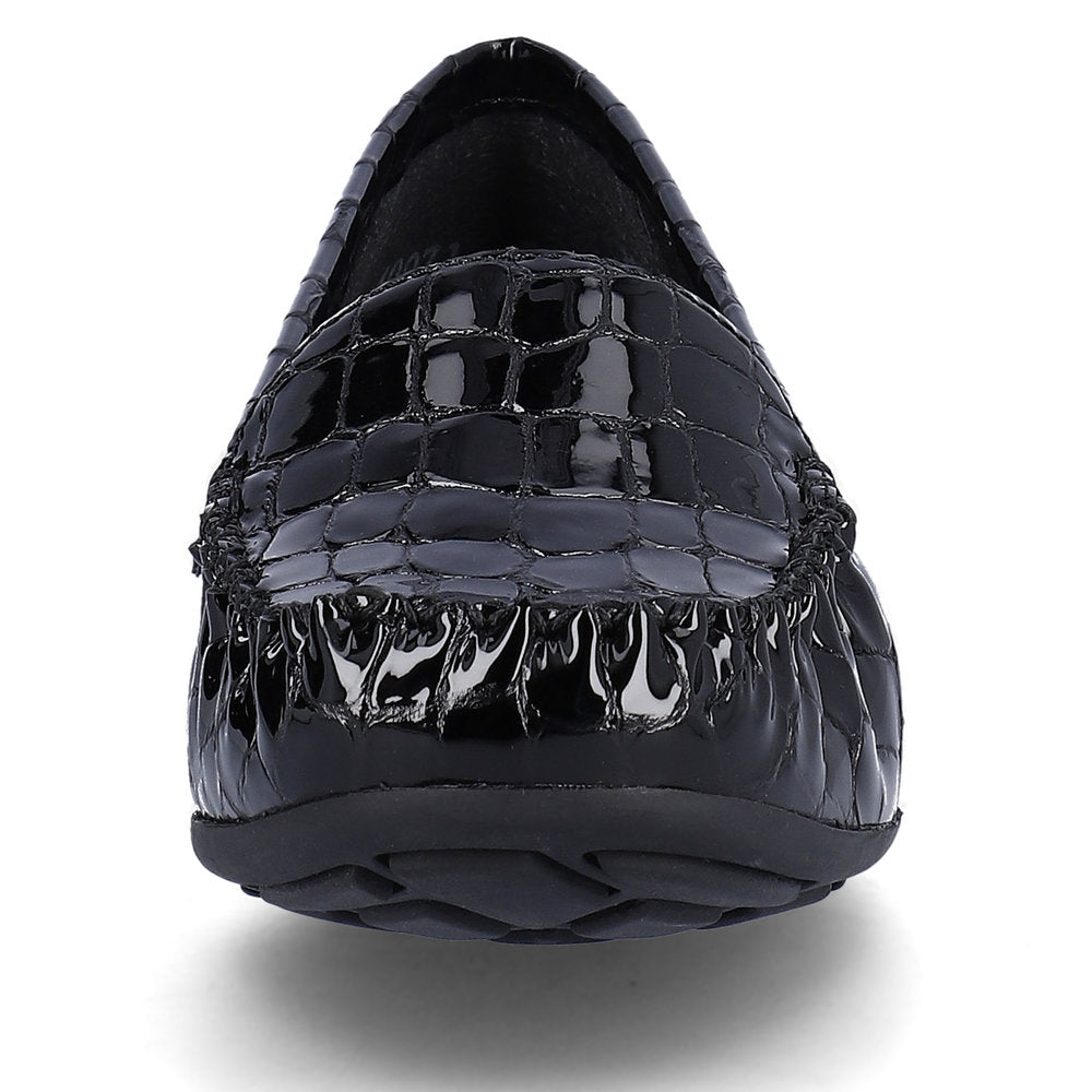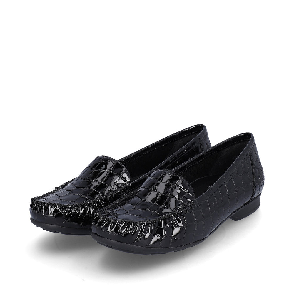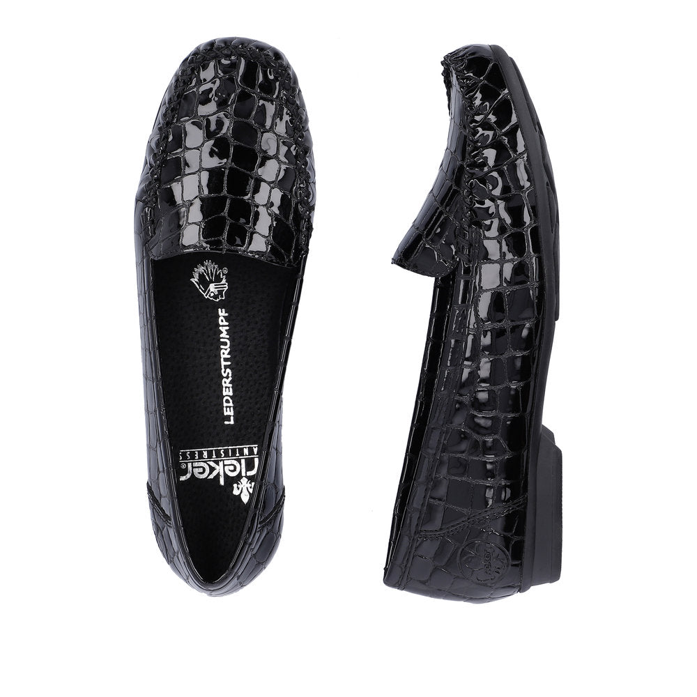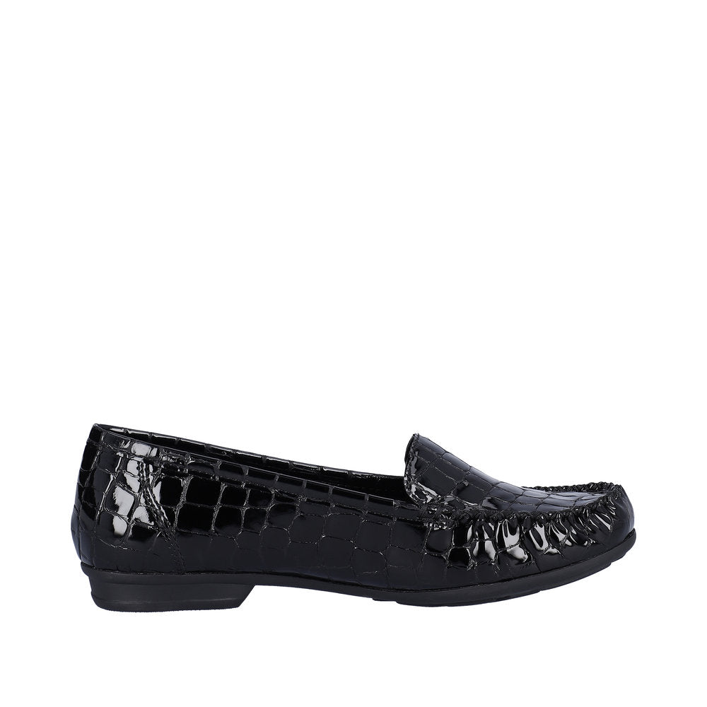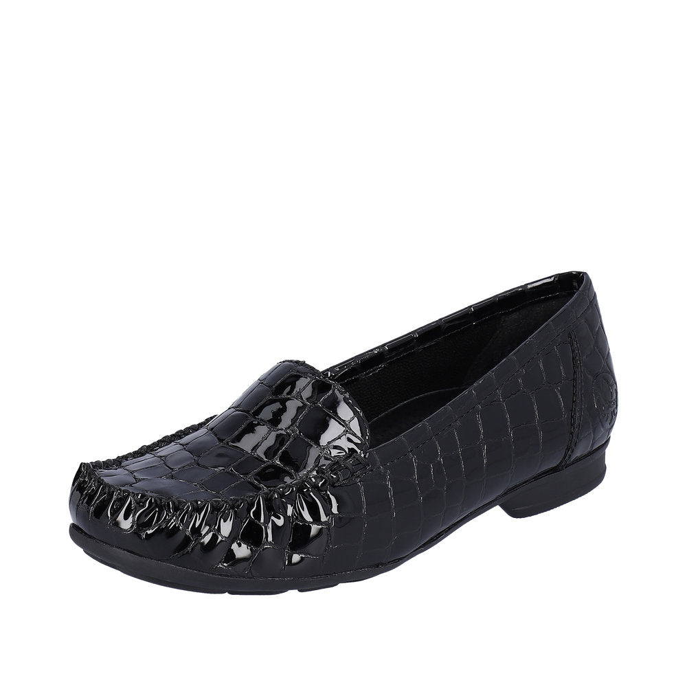 Neat moccasin style, ladies black slip-on loafer. This loafer style shoe features a patent leather upper with a square toe shape to give you plently of room. Featuring Rieker's anti-stress technology, these loafers offer flexibility and comfort for all seasons.