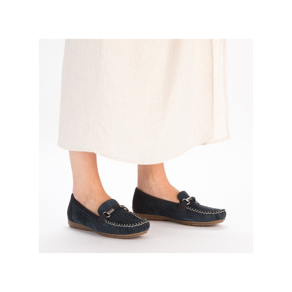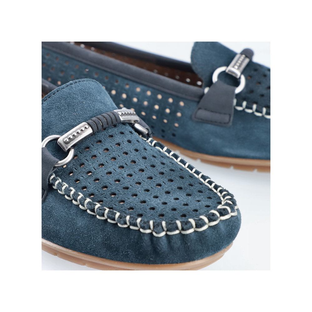 Soft nubuck leather moccasin shoes with a flat heel. These soft leather shoes have a square toe shape to give you plenty of room and a deep toe box to allow more space for your toes. The 40253 model has open slots to allow air to circulate around your feet, making this style a good choice for summer. Silver coloured decorative snaffle.