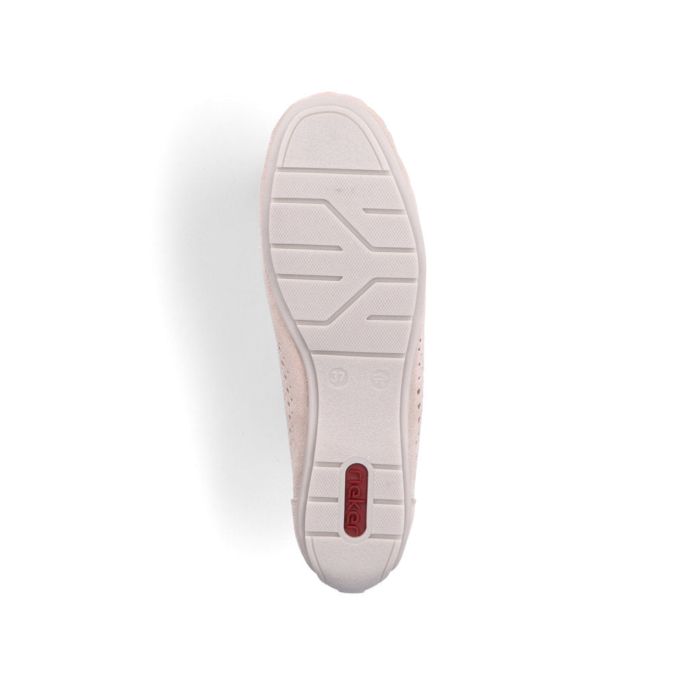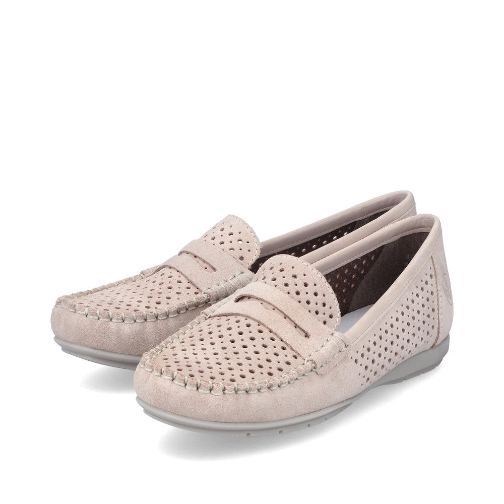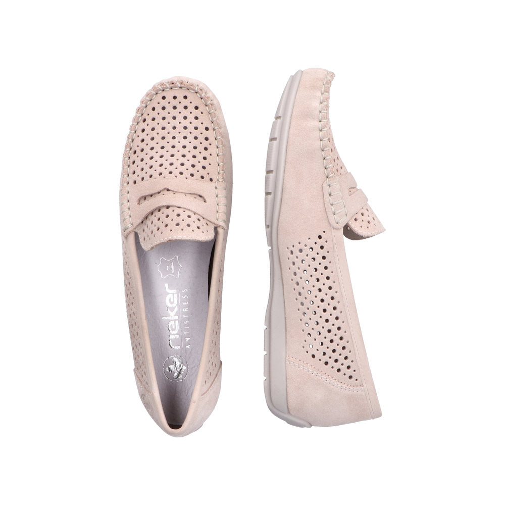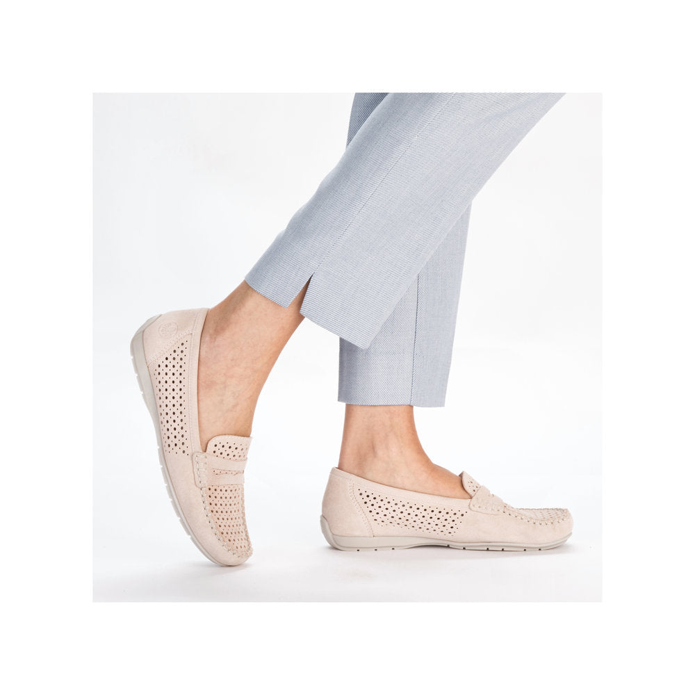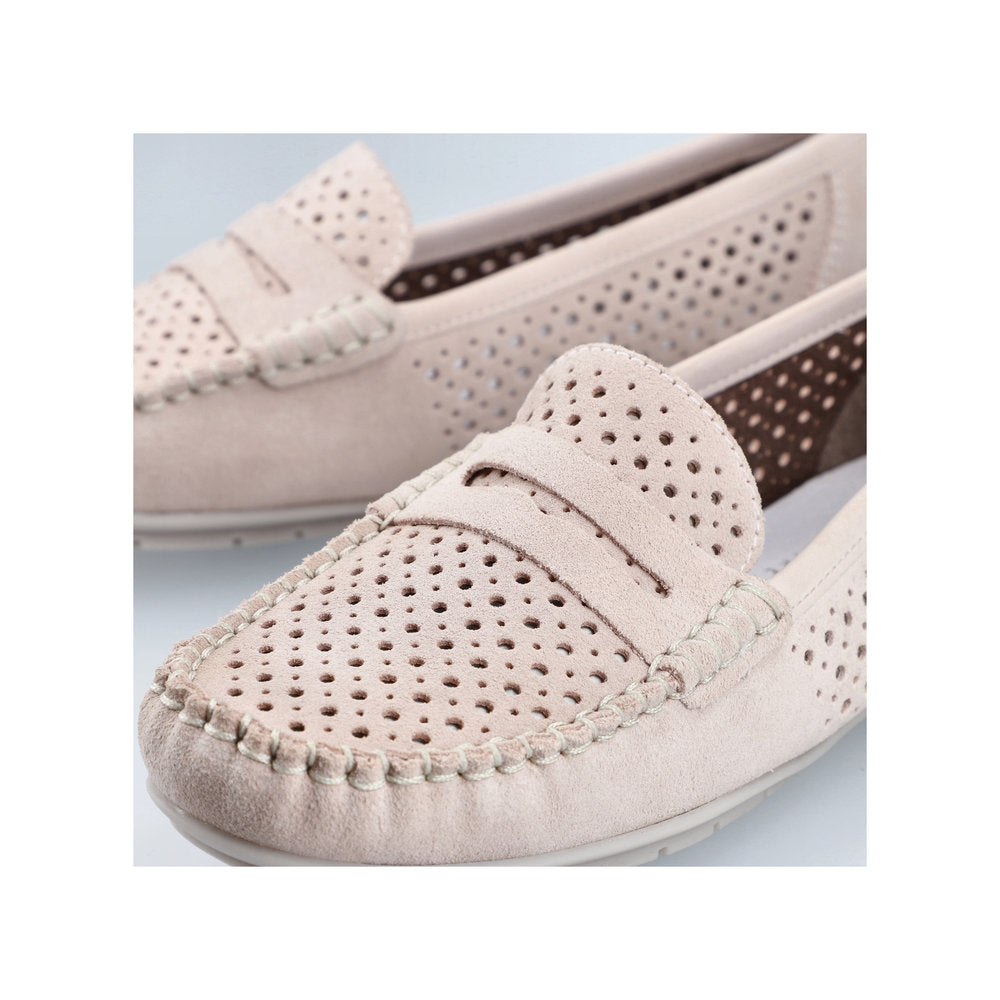 Soft nubuck leather moccasin shoes with a flat heel. These soft leather shoes have a square toe shape to give you plenty of room and a deep toe box to allow more space for your toes. The 40263 model has open slots to allow air to circulate around your feet, making this style a good choice for summer. Self coloured decorative tab all in soft pale rose pink.