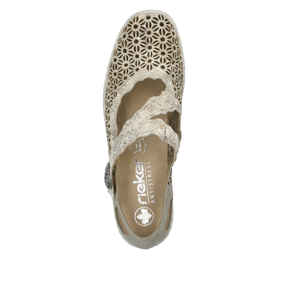 Light and comfy. These asymmetrical strap Mary Jane style shoes adjust for a perfect fit. The metallic gold beige and white soft leather laser cut flower design subtly blends to give a neutral summer style that can be paired with warm and cool tones alike.