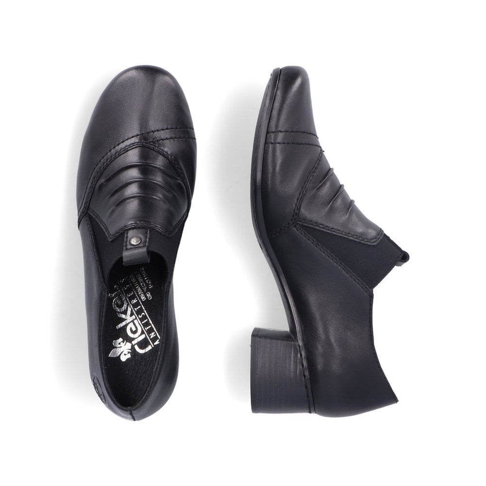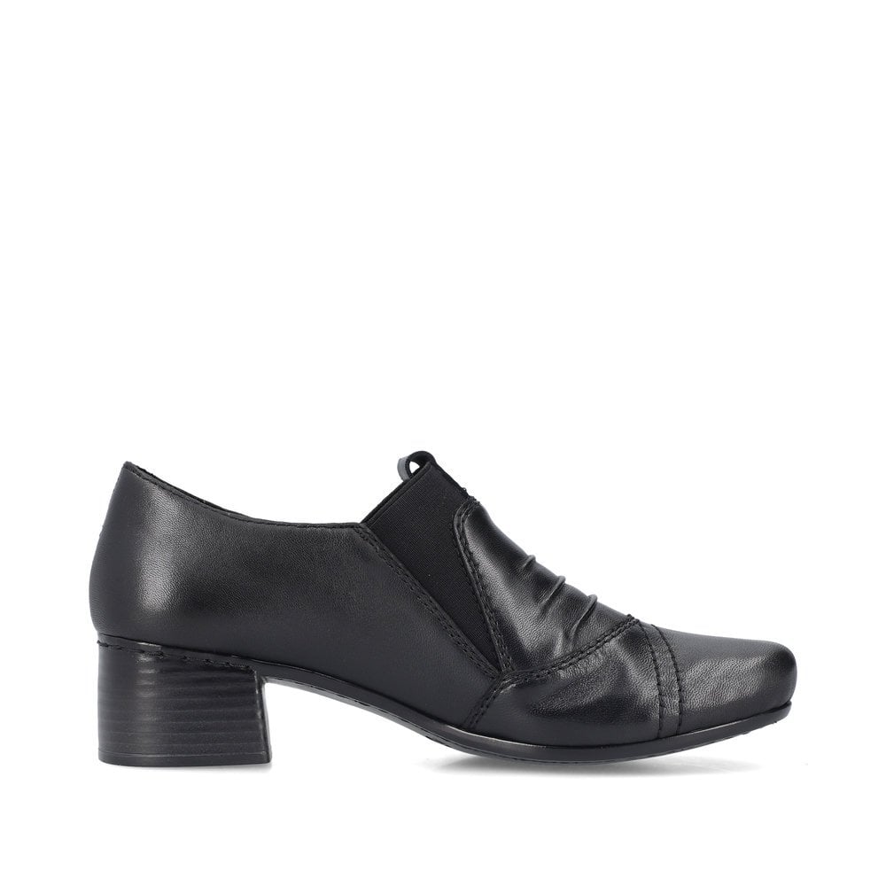 Soft smooth leather with ruched effect detail high fronted trouser shoe . These comfy heels look great with a trousers and skirts for work wear or longer length dresses and casual clothes. This model is ideal for the busy lifestyle as it has large elastic side panels for easy on/off,
