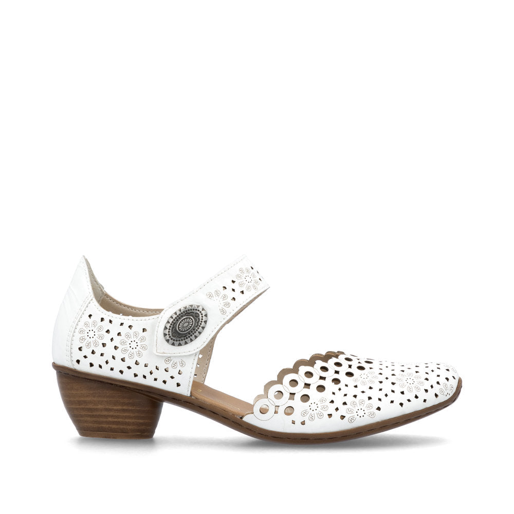 These soft leather shoes have an oval toe shape to give you plenty of room and a touch and close cleverly positioned strap to allow an adjustable fit. The laser cut design allows air to get to your feet and all this with a decorative and intricate design. The 43753 model has an open waist and a small heel which helps to give a dressy look with comfort.