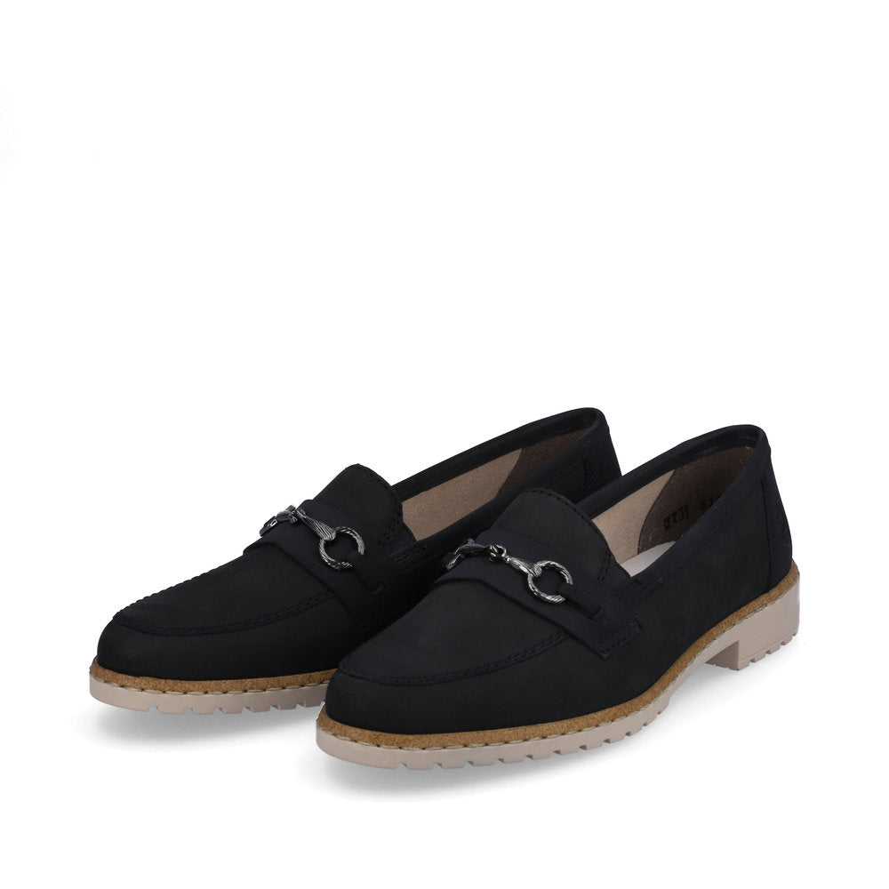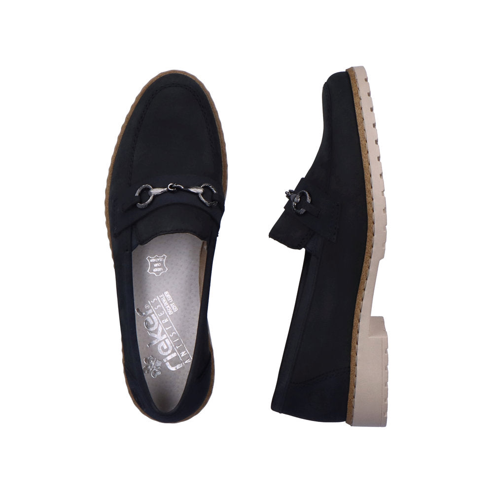 The Rieker 51860 is a stylish loafer with a soft nubuck upper and silver snaffle chain detail. As well as being fashionable, it is lightweight and comfortable with its 25 mm heel, twin elastic gussets, and flexible defined tread sole. Make a fashion statement and keep comfortable with the Rieker 51860.
