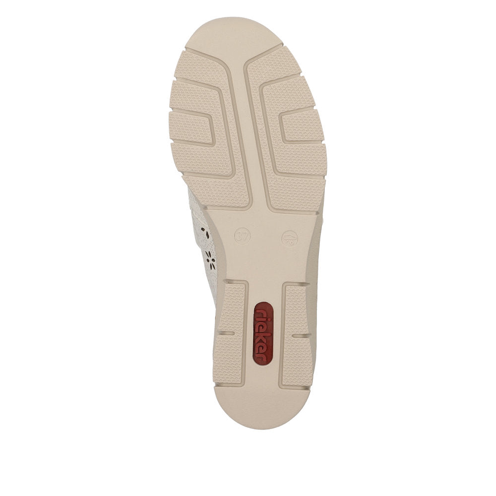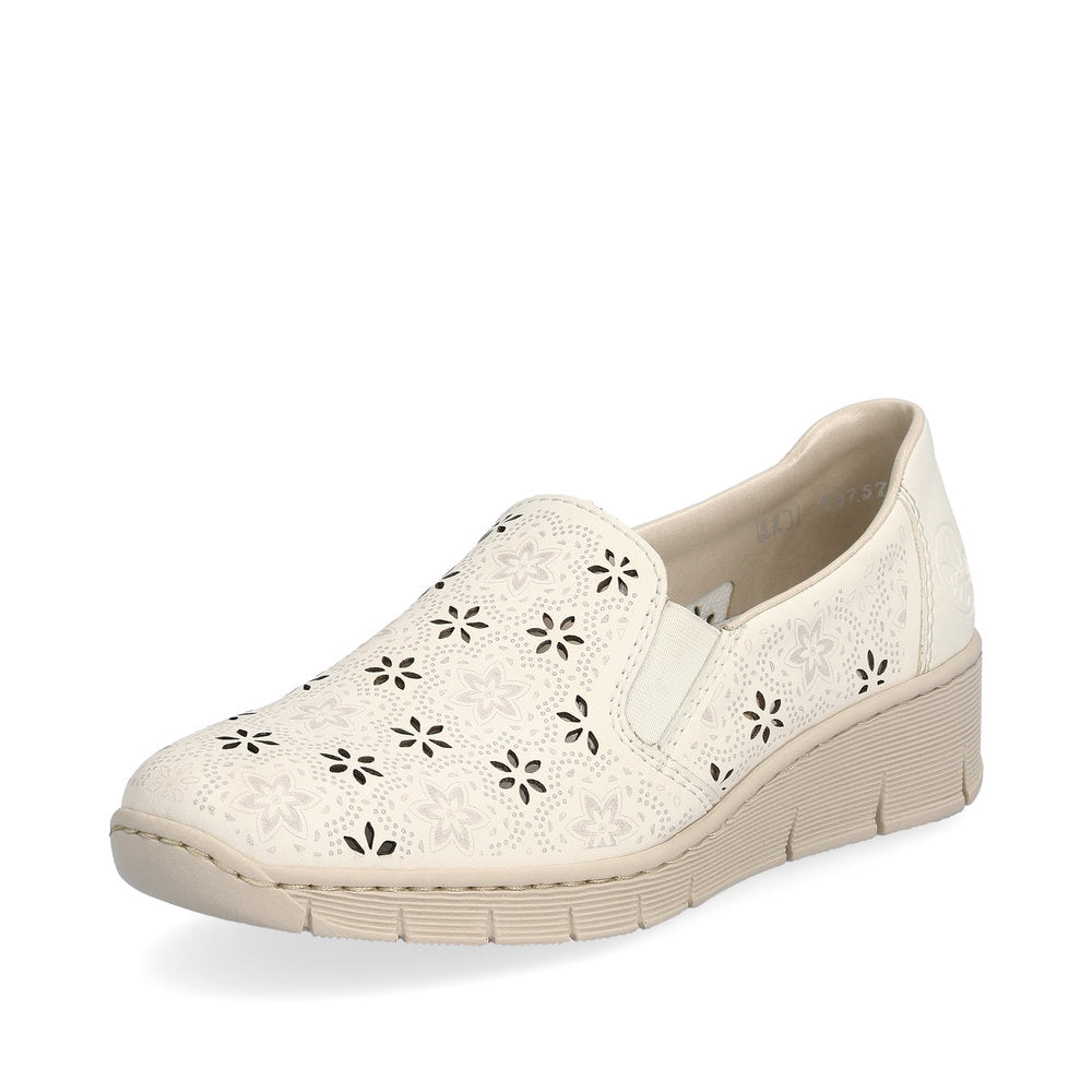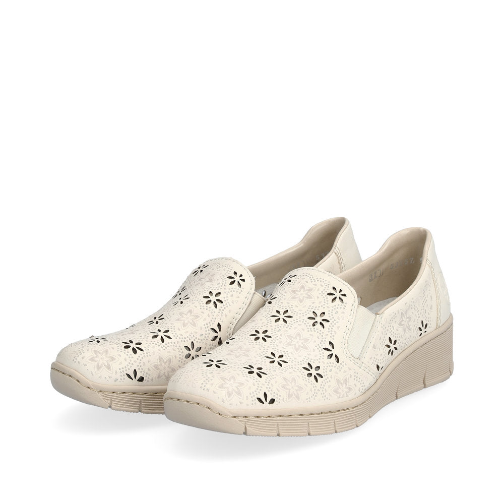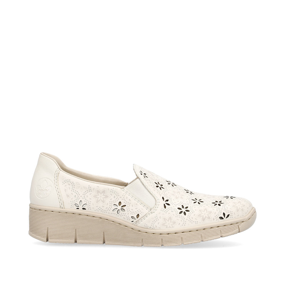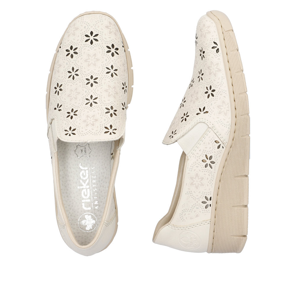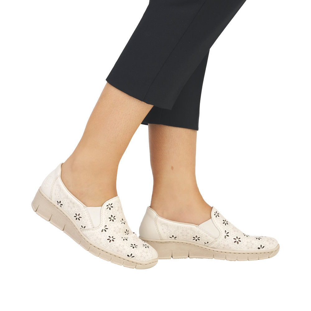 53757 porcelain leather slip on shoes with a laser cut out flower detail. Soft and light these smart high fronted shoes are practical everyday footwear.